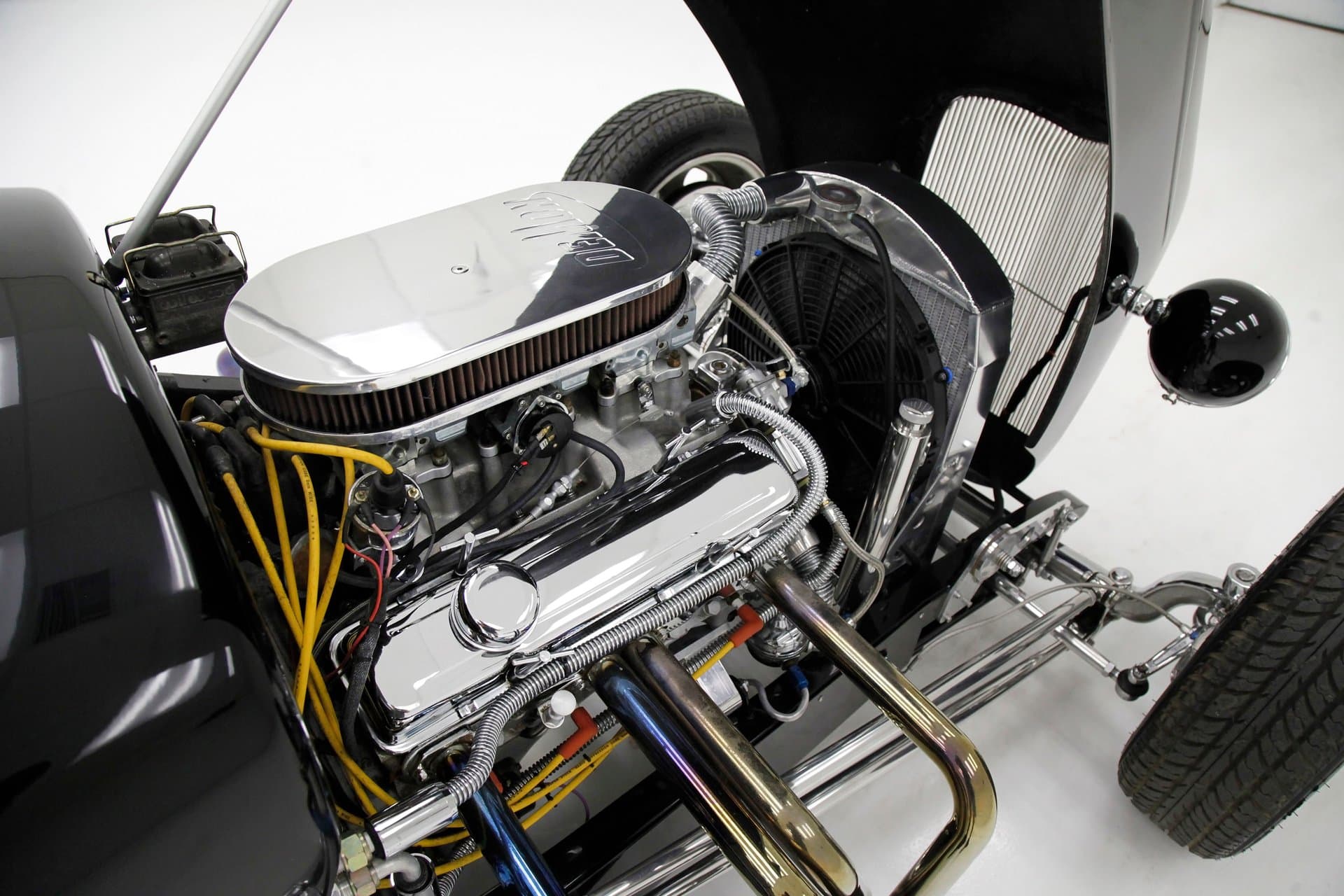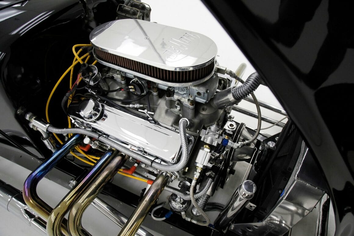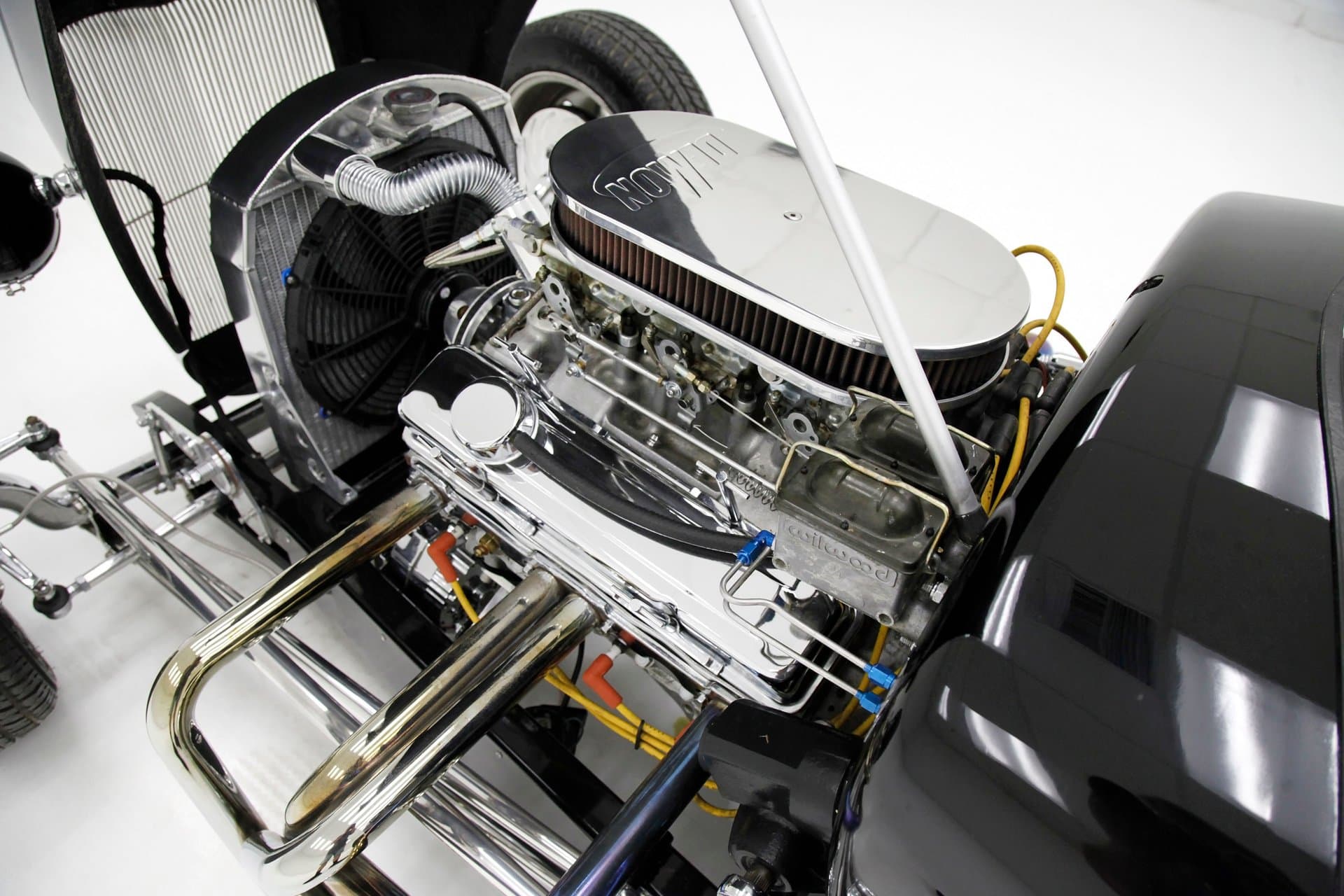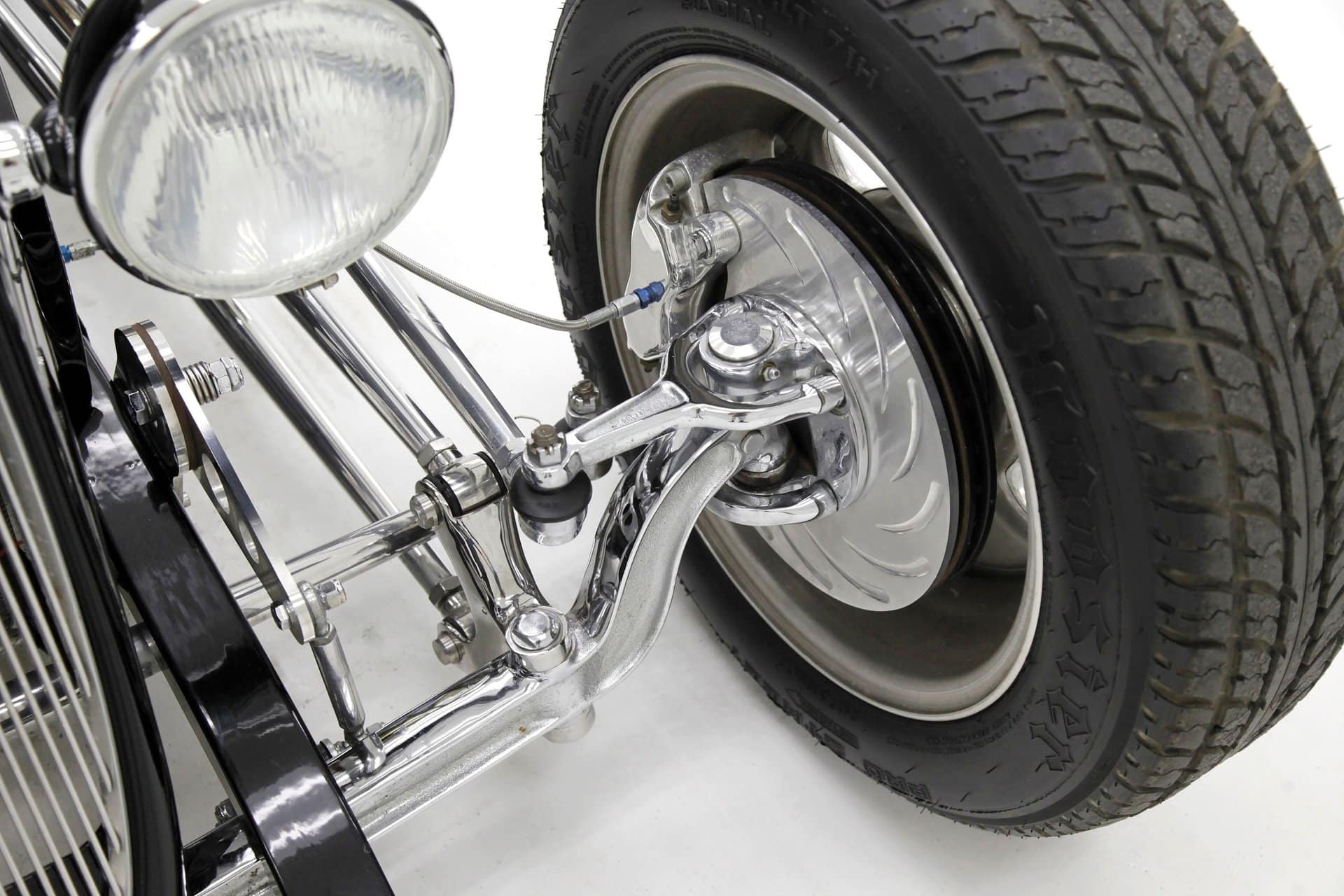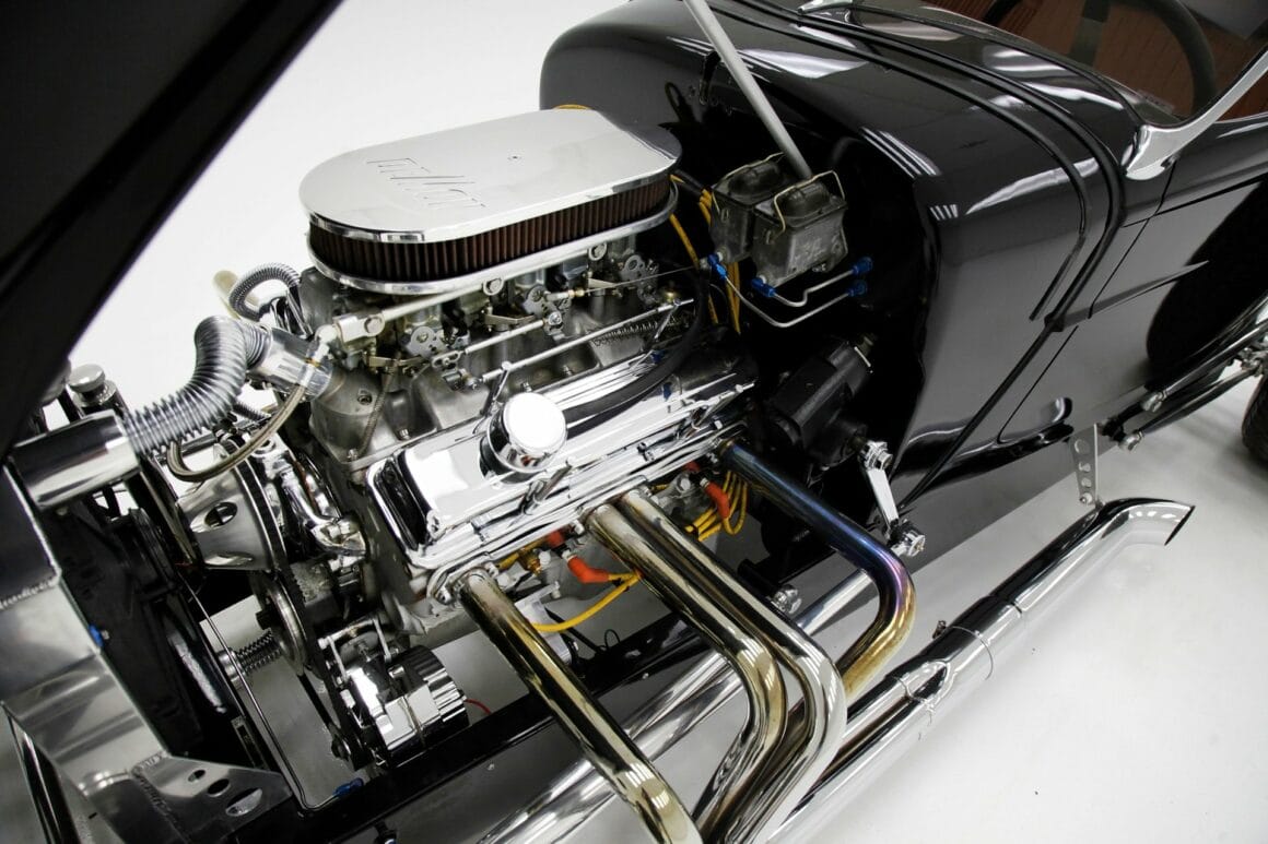 Un volant de style rallye fait face à ce tableau de bord peint en noir. Au milieu des sièges en banquette se trouve une découpe pour faire place à un levier de vitesses en aluminium à poignée pistolet B&M. Le retournement du capot vers l’avant révèle un moteur dont Henry Ford n’aurait pu que rêver (et qui pourrait actuellement se retourner dans sa tombe !), un 350ci V8 avec 3 carburateurs double corps. Des collecteurs chromés accrocheurs peuvent être vus dans toute leur splendeur sur les flancs depuis les côtés ouverts du capot. L’essieu avant abaissé avec une configuration chromée à 4 barres déchire les yeux, et, à l’arrière se laisse admirer une configuration de suspension à ressort à lames transversales avec amortisseurs d’action.