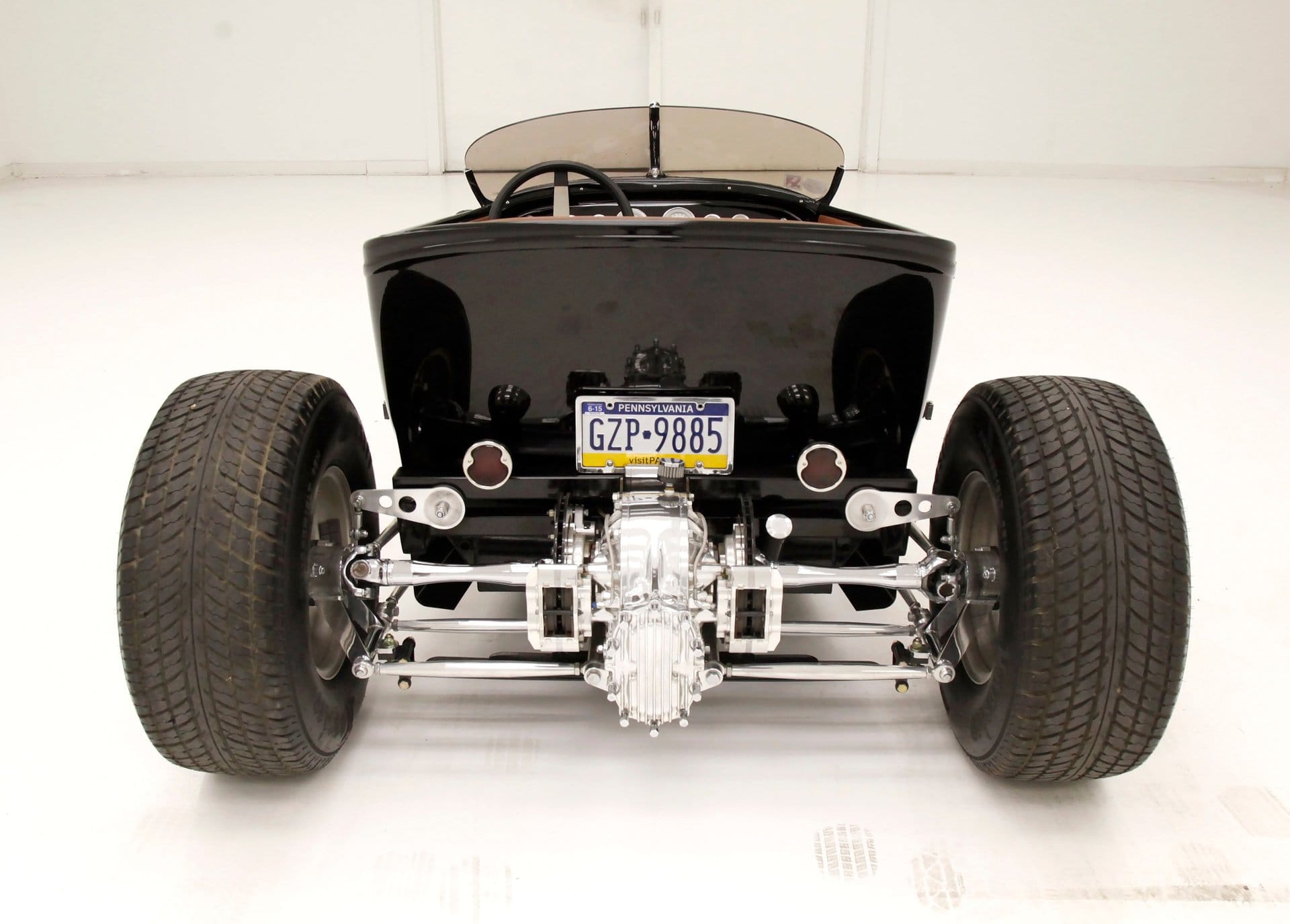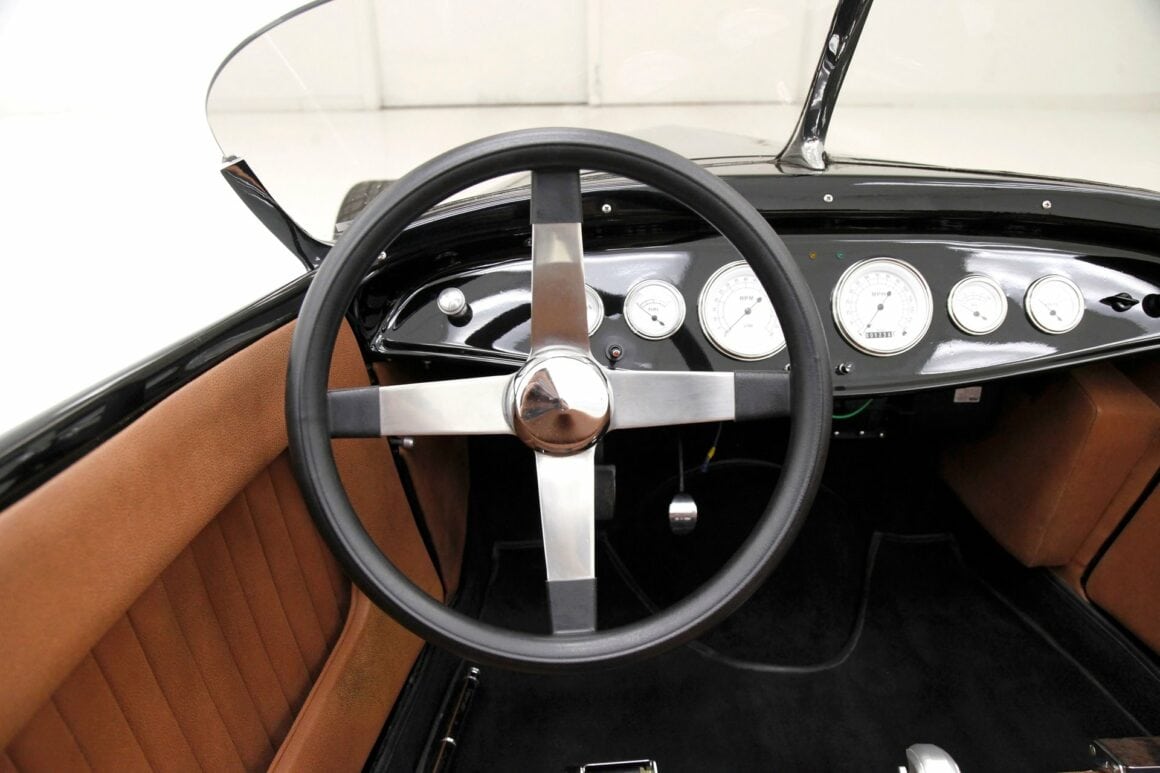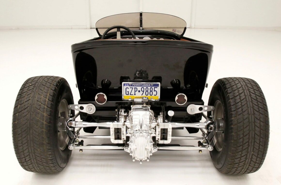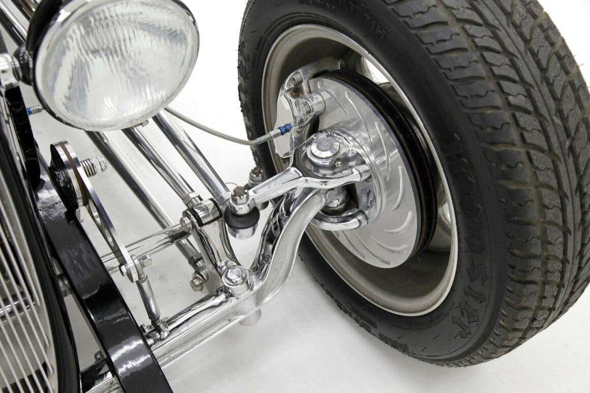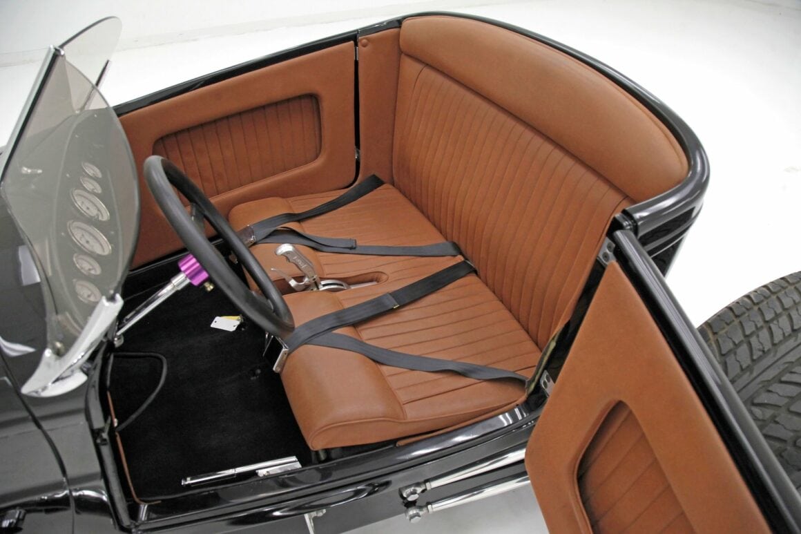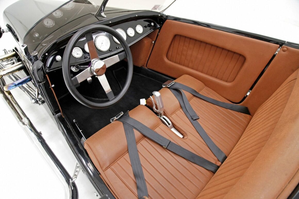 Pas cette voiture. Derrière la baignoire arrière arrondie se trouve la citrouille arrière chromée qui semble célébrer Noël plus qu’Halloween ! Les 24×7.50-15 à l’avant et 31×12.5R15 à l’arrière, enveloppent des jantes Weld Rodlite de 15 pouces. Ce qui est juste plus de chrome pour ajouter du bling. Tout cela n’a certainement plus le vieux look d’Henry ! Withing la baignoire flottent les sièges en cuir brun selle-Western avec beaucoup de rembourrage et de largeur pour le conducteur et le passager. Les inserts de selle Tuck&Roll se trouvent sur les panneaux de porte, et, à l’avant se trouve un tableau de bord qui abrite une gamme complète d’instrumentation avec des compteurs à face blanche et des cerclages chromés transmettant tous les éléments vitaux.
