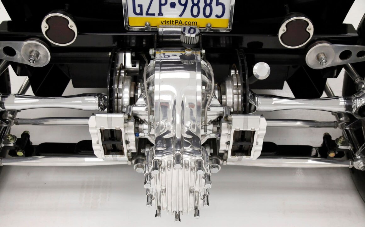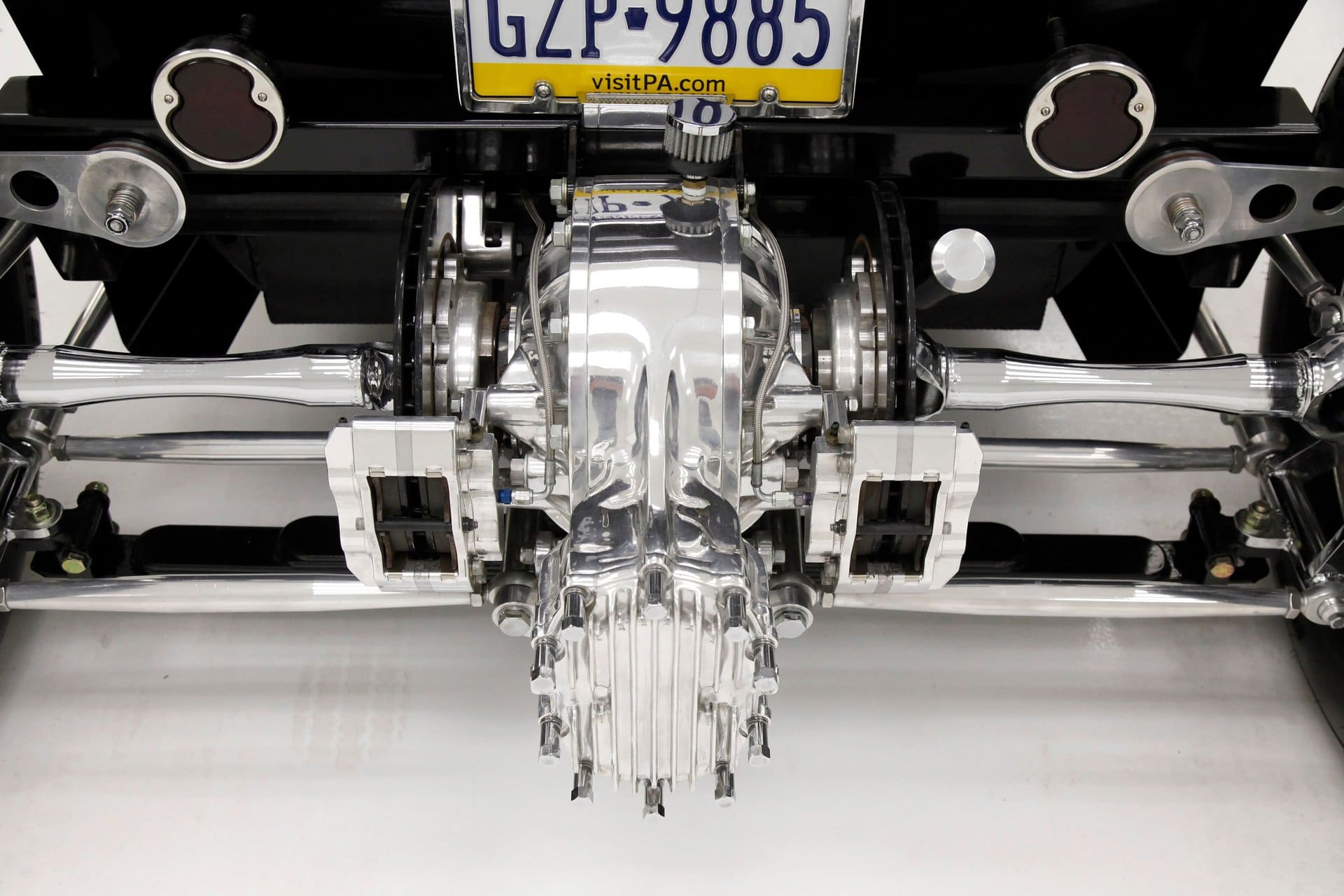 La compression est de 12,5:1, les cames sont inversées d’un côté et il tourne facilement à 7500 tr/min. Dan a converti le moteur en carter sec en utilisant une pompe à huile Peterson pour perdre de la hauteur. Il a usiné la nouvelle casserole. La puissance est juste à 400cv. La transmission est une Tremec T-5, dirigeant la puissance vers un Dan Quick Change unique conçu sur CAO avant que Tribal Motor Works ne l’usine à partir de billettes d’aluminium. D’étranges essieux flottants sont attachés à des moyeux flottants usinés par Dan. Les freins sont deux étriers Strange agrippant des rotors de 14 pouces de JMA Tool. Les amortisseurs de friction faits à la main amortissent les coins. Une unité de dragster à crémaillère Top Fuel gère la direction.