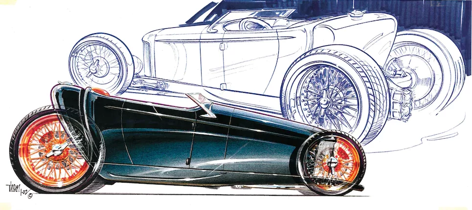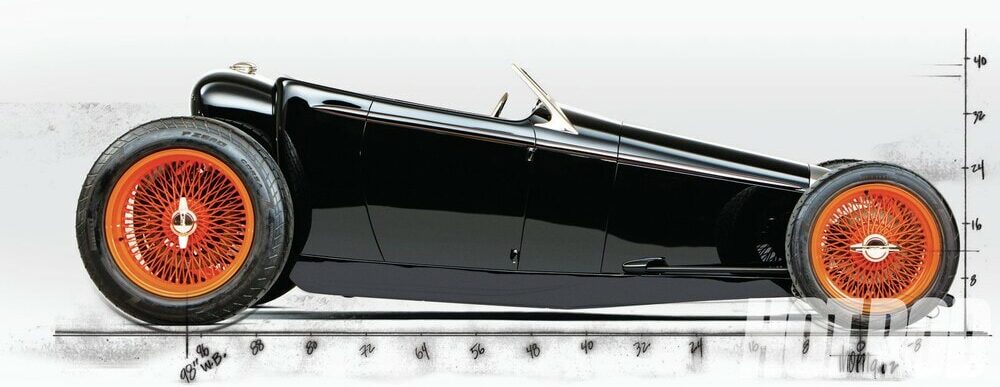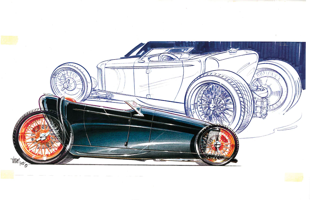 Pensez à tous ces projets bloqués sur la collecte de la poussière dans les garages et les magasins. Terminer l’accumulation de n’importe quoi peut être un gros problème. Les premiers croquis étaient tout simplement trop éloignés pour Dan Webb et Craig Naff, mais Darrell Zipp voulait un Zipper roadster Ford’34, et il a décidé de prendre cela littéralement et imaginé le capot, les portes et les quartiers d’un Roadster Zipper’34 en suite de son Coupé’34. Il a fallu relativement peu de révisions du croquis avant que l’équipe trouve une direction… et un rendu final montrant la voiture en noir a été dessiné. Bien qu’il y ait beaucoup de designers exerçant leur métier, peu ont la capacité de prendre un dessin et de le mettre en quatre vues avec des sections dessinées.