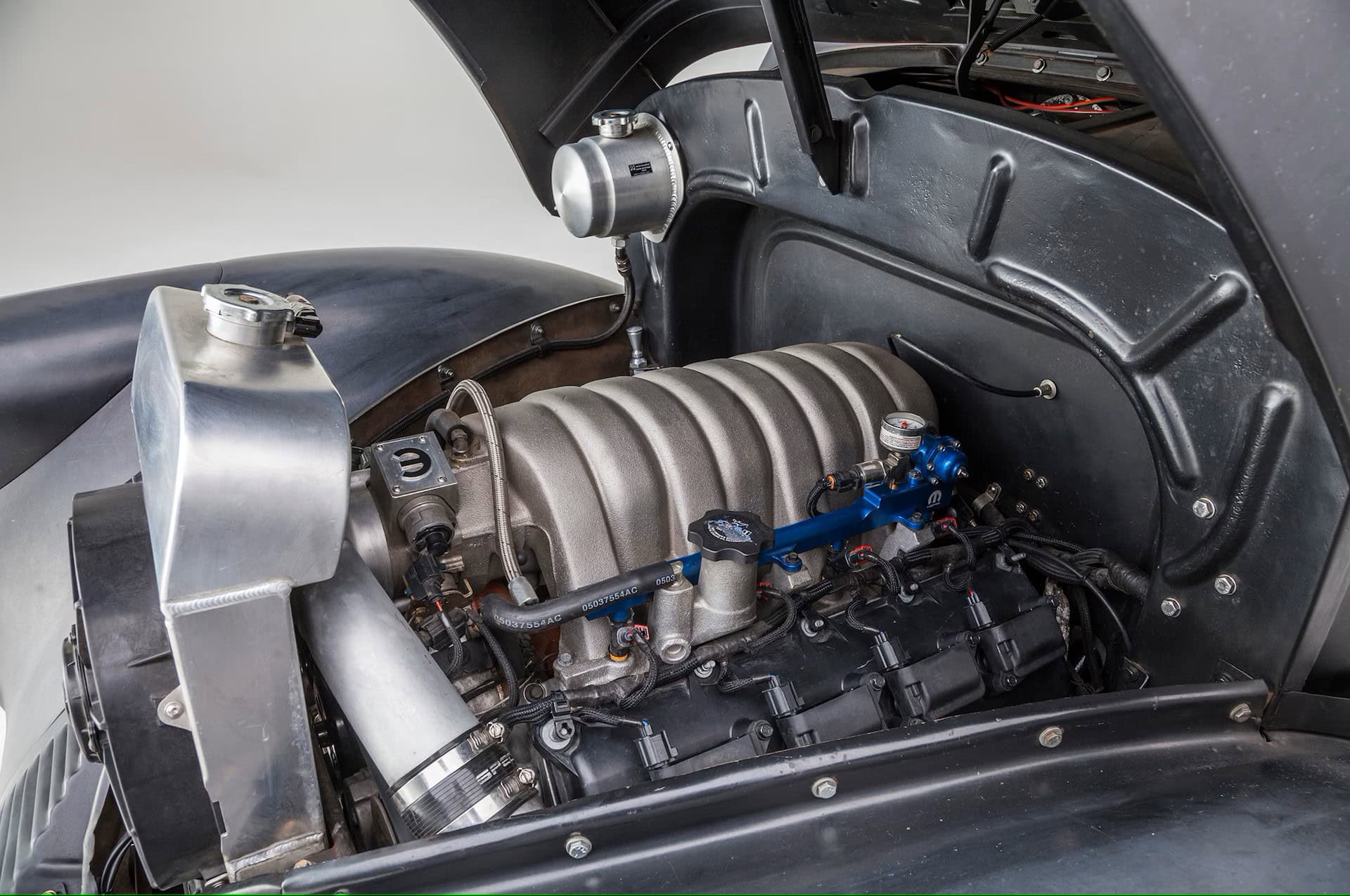 Voilà, j’en ai terminé avec le 39’Willys Overland Coupe d’Aaron et Margarita Bedrosian, Granada Hills, Californie =. USA… Un p’tit rappel des faits… V8 372 ci Gen III SRT8 Hemi 2008 4,05 x 3,58po. Taux de compression : 10,3:1. 6L1 SRT à boulons croisés (bloc orange pour les connaisseurs), assemblé en usine avec réalésages des cylindres aiguisés à plaque de couple, et jets d’huile de refroidissement des pistons. Vilebrequin en acier micro-taillé-forgé d’origine, bielles à haute résistance en 6,25po avec goupilles flottantes, pistons plats hypereutectiques en aluminium moulé avec revêtement des jupes en graphite à faible frottement et bagues de 1,5 mm. Culasses hémisphériques à double bouchon SRT en fonte d’aluminium et soupapes d’admission de 2,07po à tiges creuses.