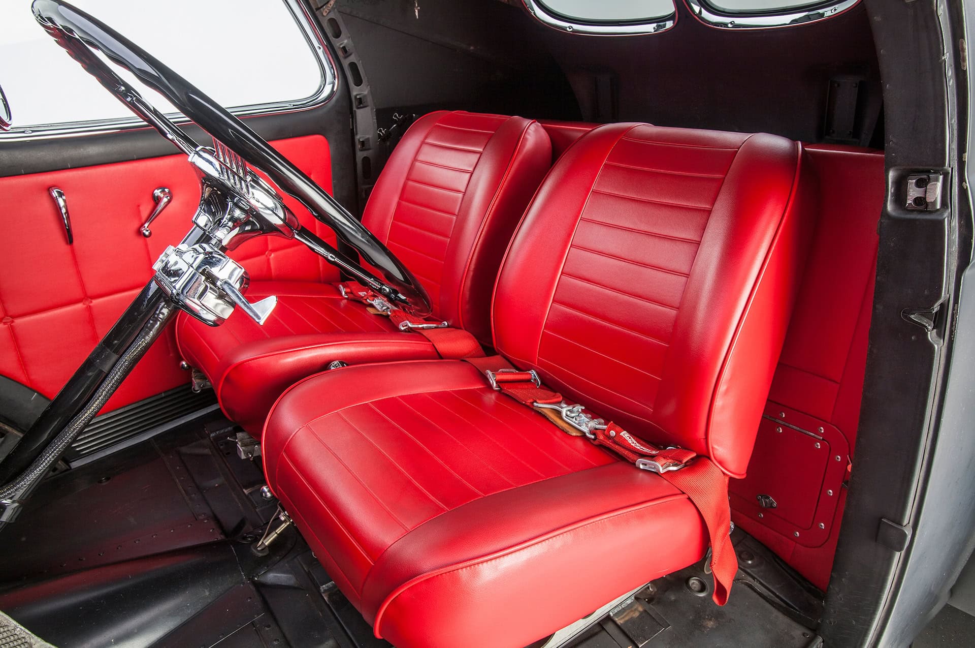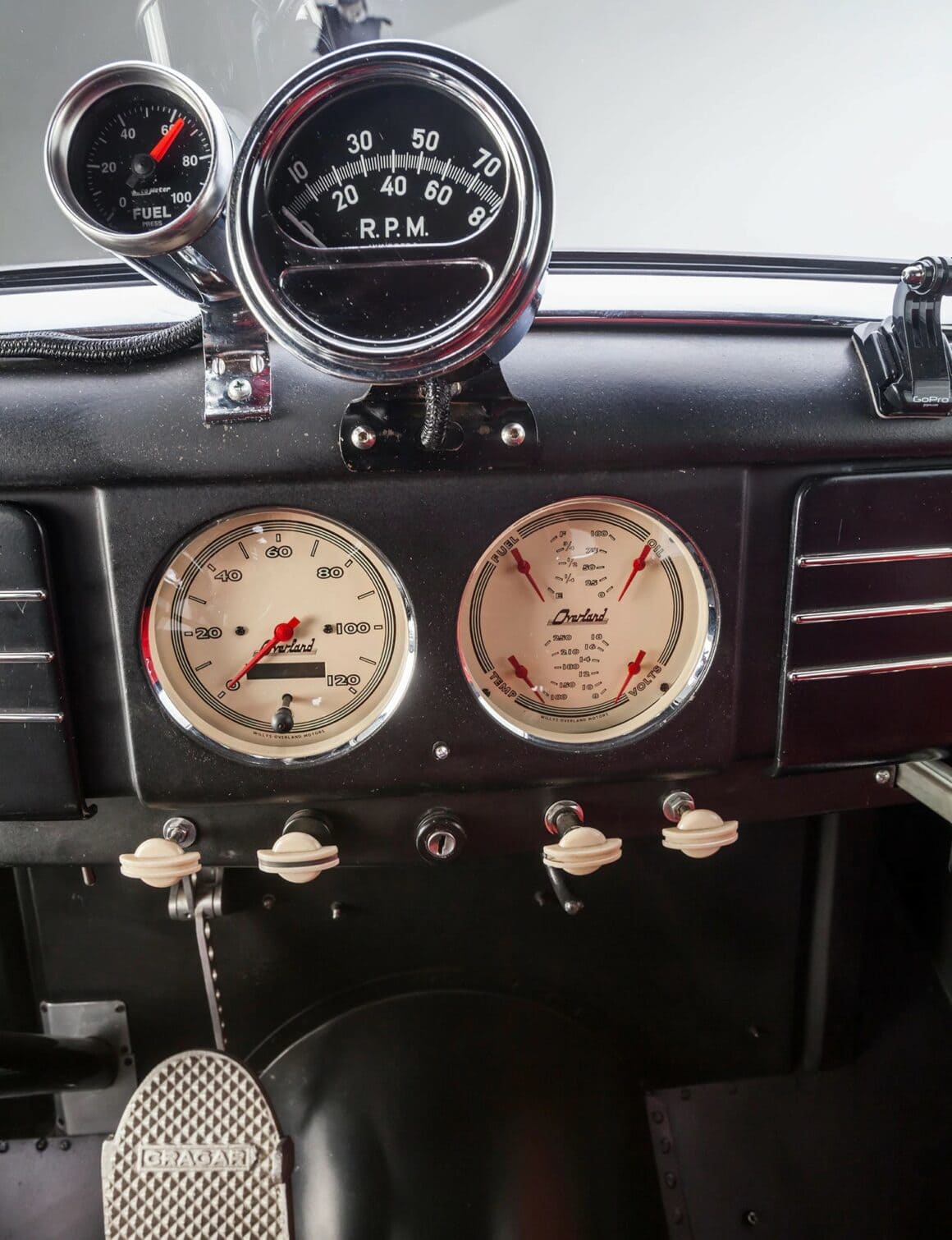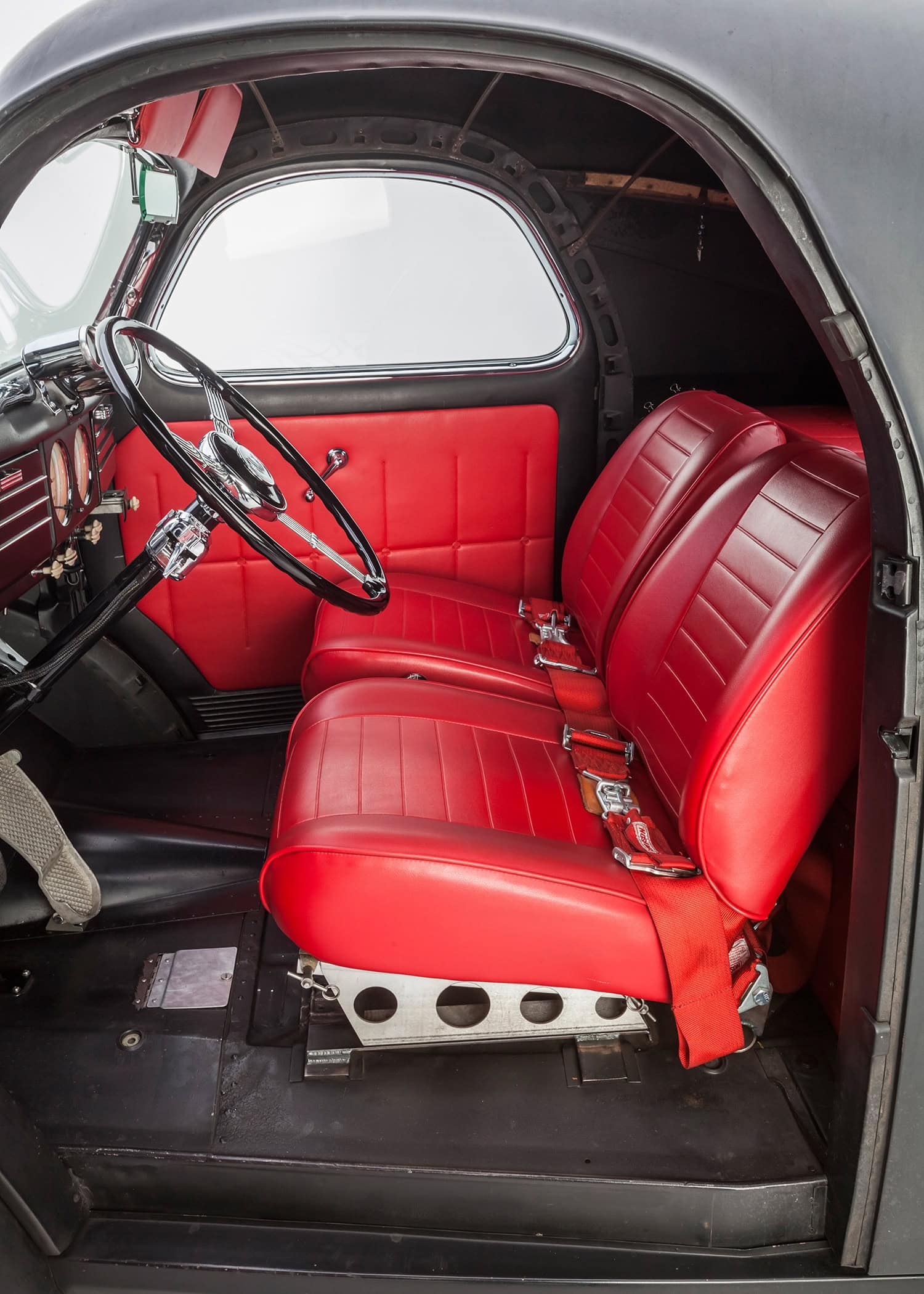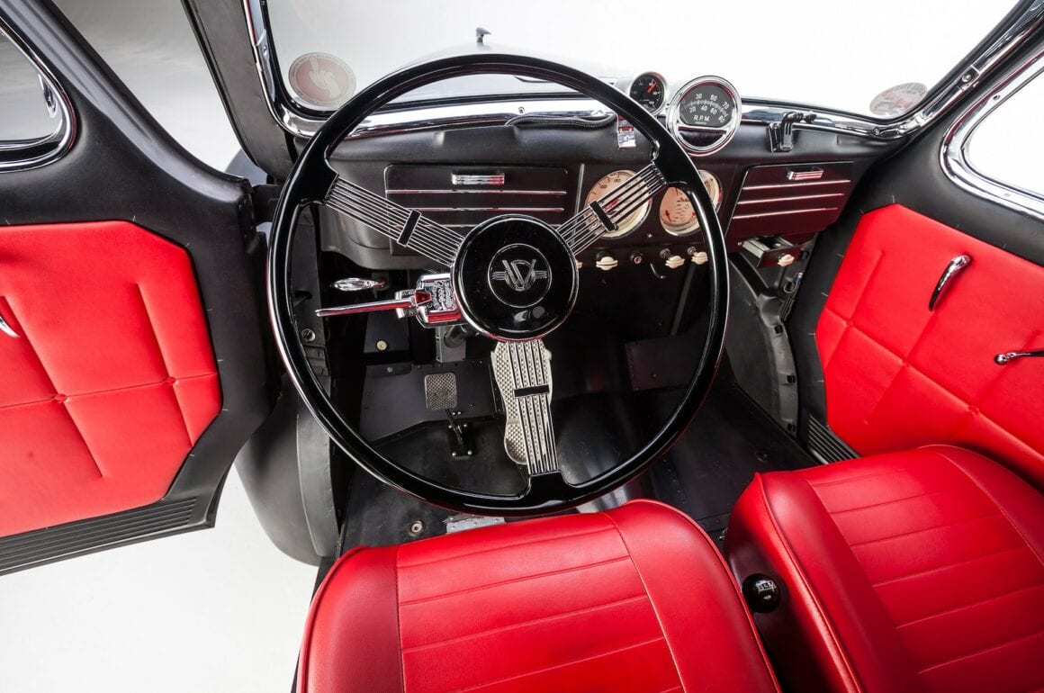 En effet, lors des nuits de cruising et des shows de Hot Rod’s dans toute la Californie du Sud. Depuis son achèvement en septembre 2009, ce Gasser a parcouru plus de 18.000 miles et roule au moins trois fois par semaine. Si vous êtes dans la région de Los Angeles, gardez un œil dans le rétro ils roulent généralement à 70 mph sur la voie rapide ! À l’intérieur, Aaron a modifié les compteurs de l’Auto Meter pour qu’elles ressemblent aux instruments Willys d’origine et il a fouillé dans son stock de goodies N.O.S. pour le rare volant Willys de style banjo. Les sièges baquets Bostrom de style Mopar A990 Super Stock sont assortis aux panneaux de porte rembourrés personnalisés et sont un clin d’œil à l’histoire des courses de dragsters Hemi.