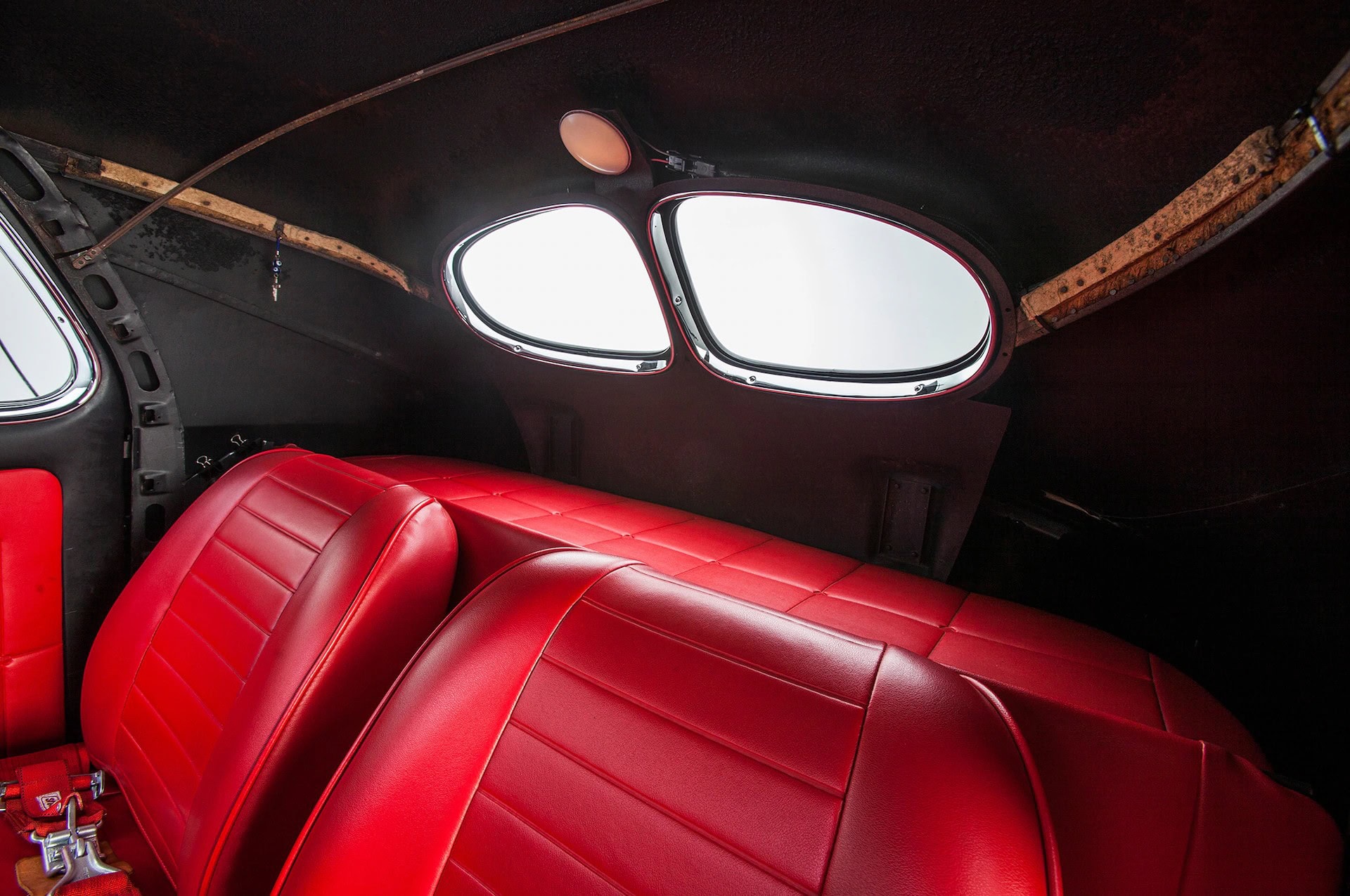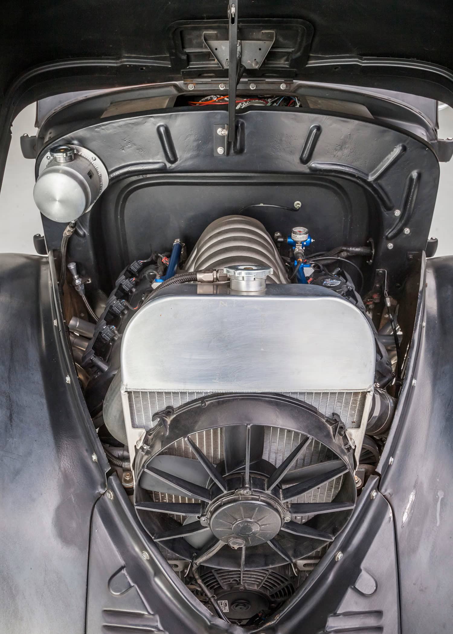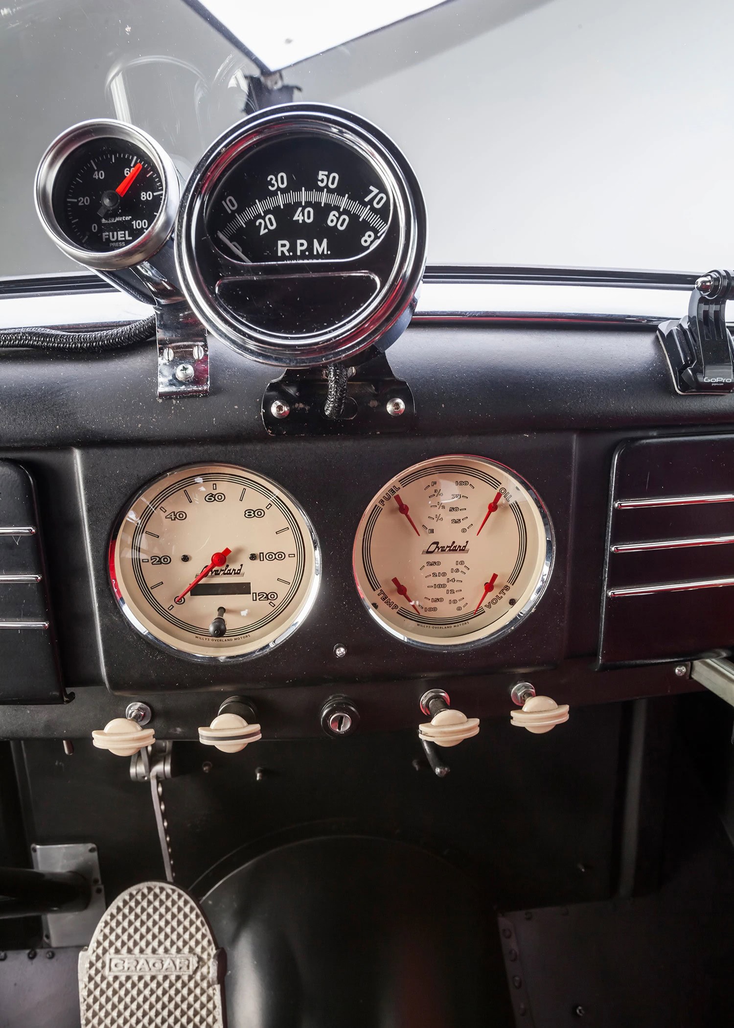 En effet, lors des nuits de cruising et des shows de Hot Rod’s dans toute la Californie du Sud. Depuis son achèvement en septembre 2009, ce Gasser a parcouru plus de 18.000 miles et roule au moins trois fois par semaine. Si vous êtes dans la région de Los Angeles, gardez un œil dans le rétro ils roulent généralement à 70 mph sur la voie rapide ! À l’intérieur, Aaron a modifié les compteurs de l’Auto Meter pour qu’elles ressemblent aux instruments Willys d’origine et il a fouillé dans son stock de goodies N.O.S. pour le rare volant Willys de style banjo. Les sièges baquets Bostrom de style Mopar A990 Super Stock sont assortis aux panneaux de porte rembourrés personnalisés et sont un clin d’œil à l’histoire des courses de dragsters Hemi.