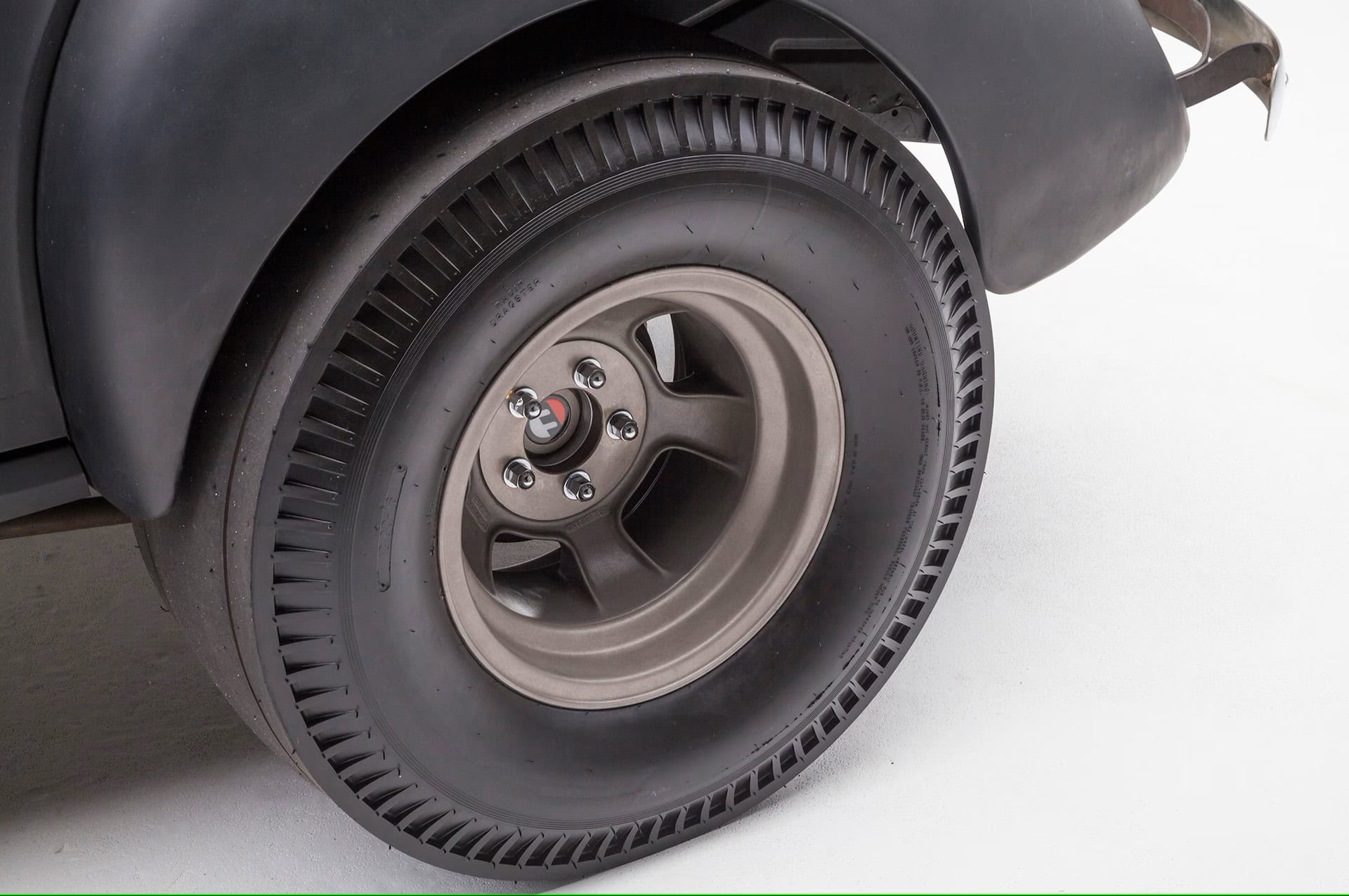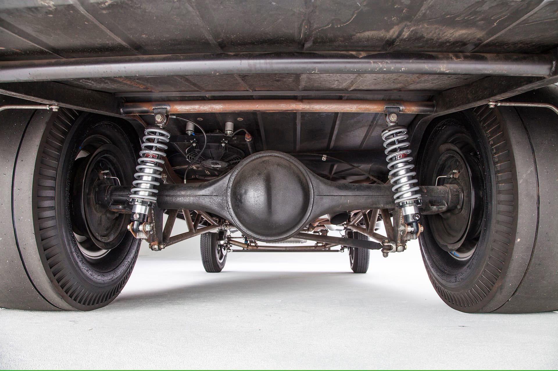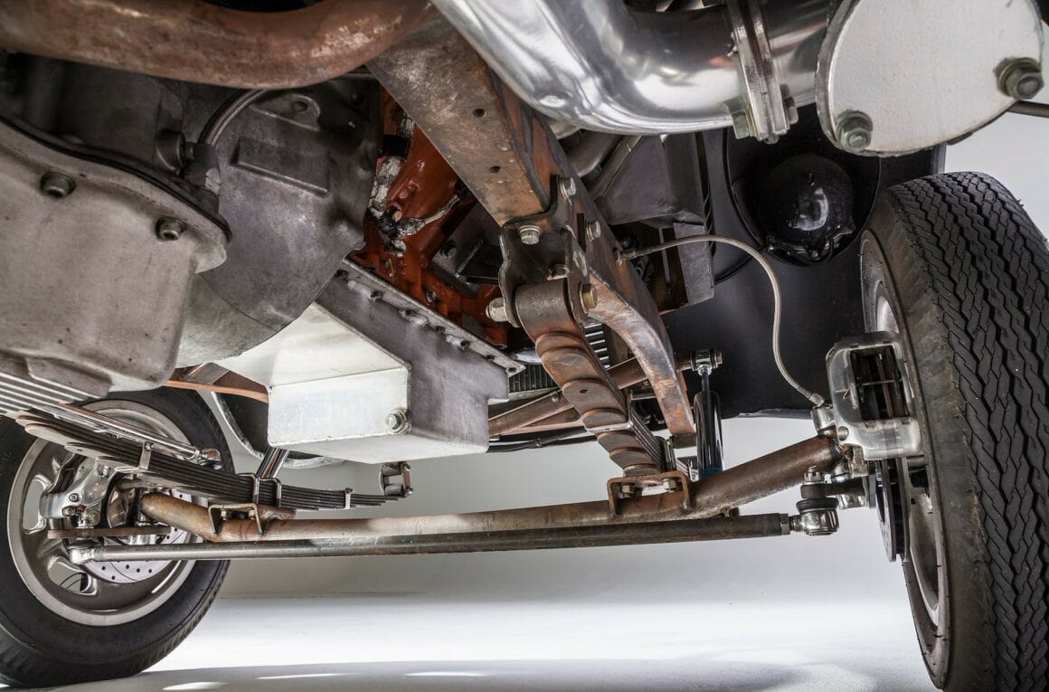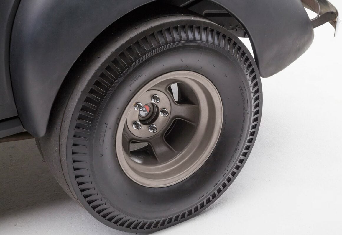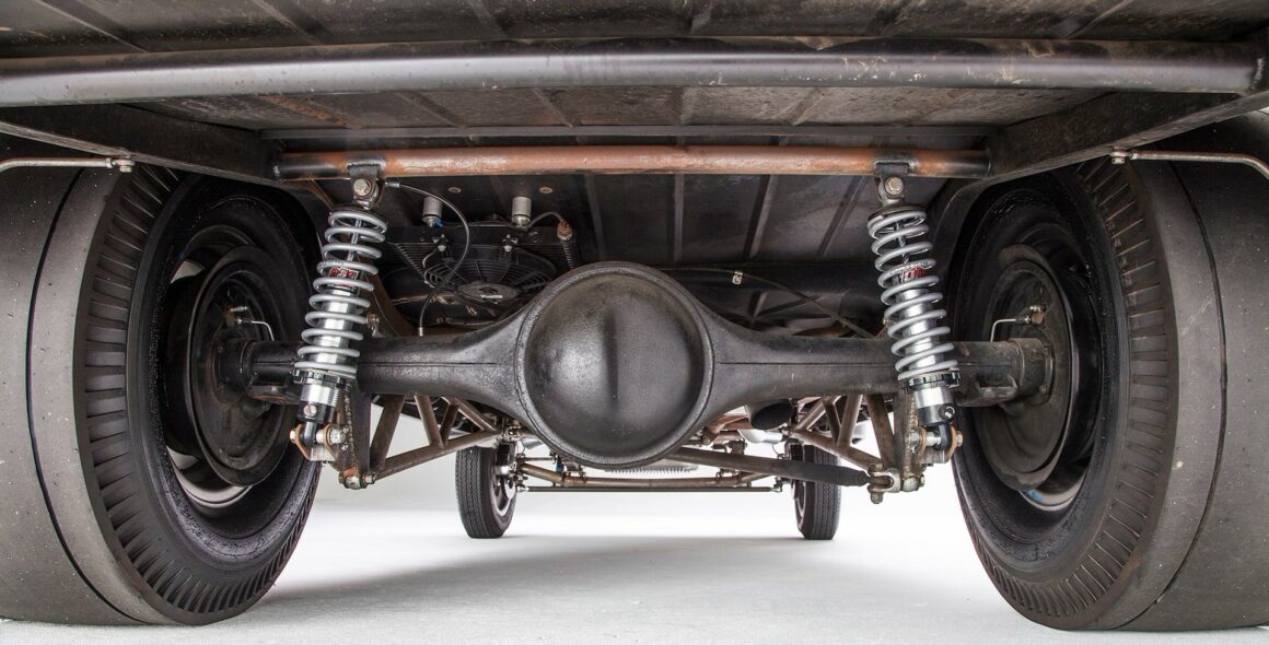 Châssis Willys d’origine, caissonné pour plus de résistance. Suspension avant : ressorts à lames avant d’origine modifiés, diamètre 2 pouces, essieu en chrome-molybdène de 375 d’épaisseur, axes Ford 1940, amortisseurs Bilstein chromés. Suspension arrière : ressorts à lames arrière d’origine modifiés, barres d’échelle de 48 pouces de long, amortisseurs réglables QA1. Boîtier de direction Willys 1940, tringlerie d’origine adaptée à la hauteur de caisse. Freins à disque Wilwood à quatre pistons à l’avant, tambours arrière Oldsmobile 11 pouces d’origine. Roues:Supports de broche Halibrand en magnésium 15×4 (avant) et Halibrand Sprints en magnésium 16×10 (arrière). Pneus:Firestone 5.60-15 DeLuxe Champion (avant), 12.00-16 Radir Dragster slicks.