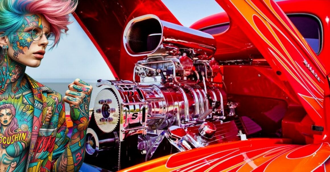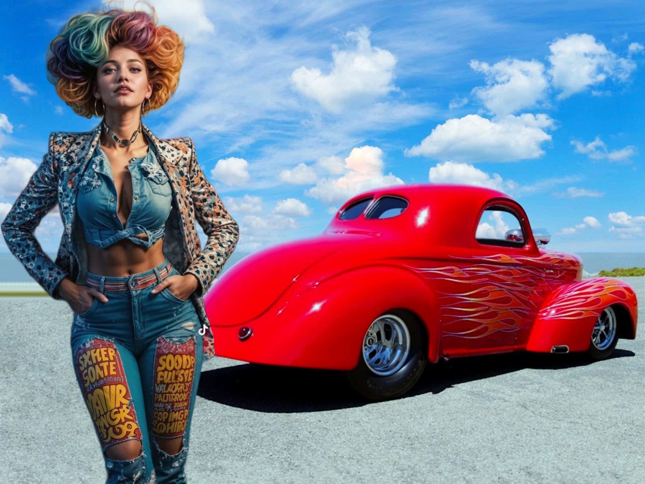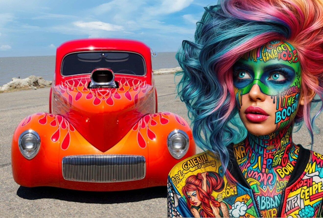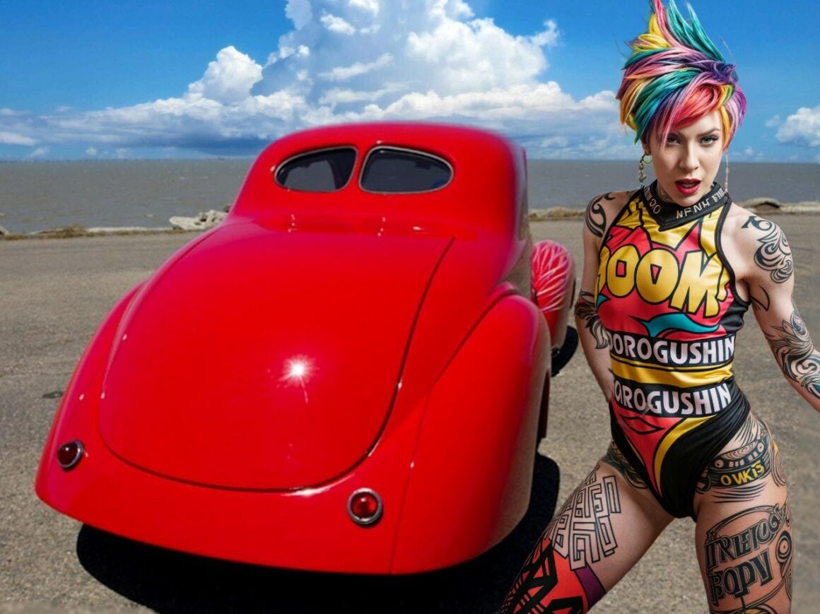 Et comme je n’en ai plus rien à f… ni de comptes à rendre (sauf au fisc qui surveille) j’en viens enfin au Hot Rod Willys qui illustre cet article… J’y ai ajouté diverses nananas IA pour mon plaisir d’enjoliver… Voici quelques lignes de commentaires sur ce Hot Rod de 100.000 $ : C’est un “Pro-street 1941 Willys”, construit entre 2000 et 2004 par “Outlaw châssis”… Ce qui vous fait une belle jambe… Cette bête est motorisée par par un V8 468ci construit de A à Z par “BBC Engineering” dont vous n’en avez rien à f…. Le compresseur est un BDS équipé de 2 carbus Holley quadruples corps (rien à f… idem).