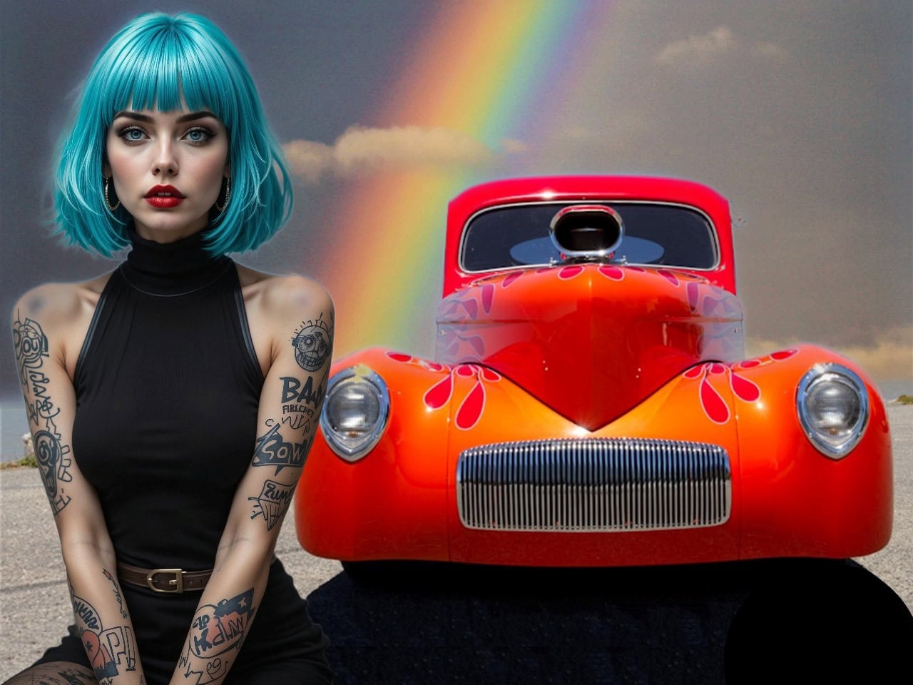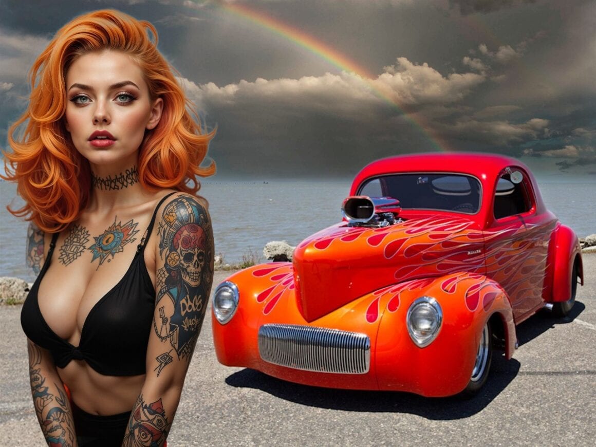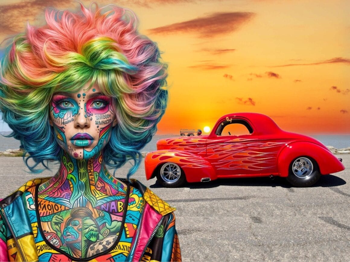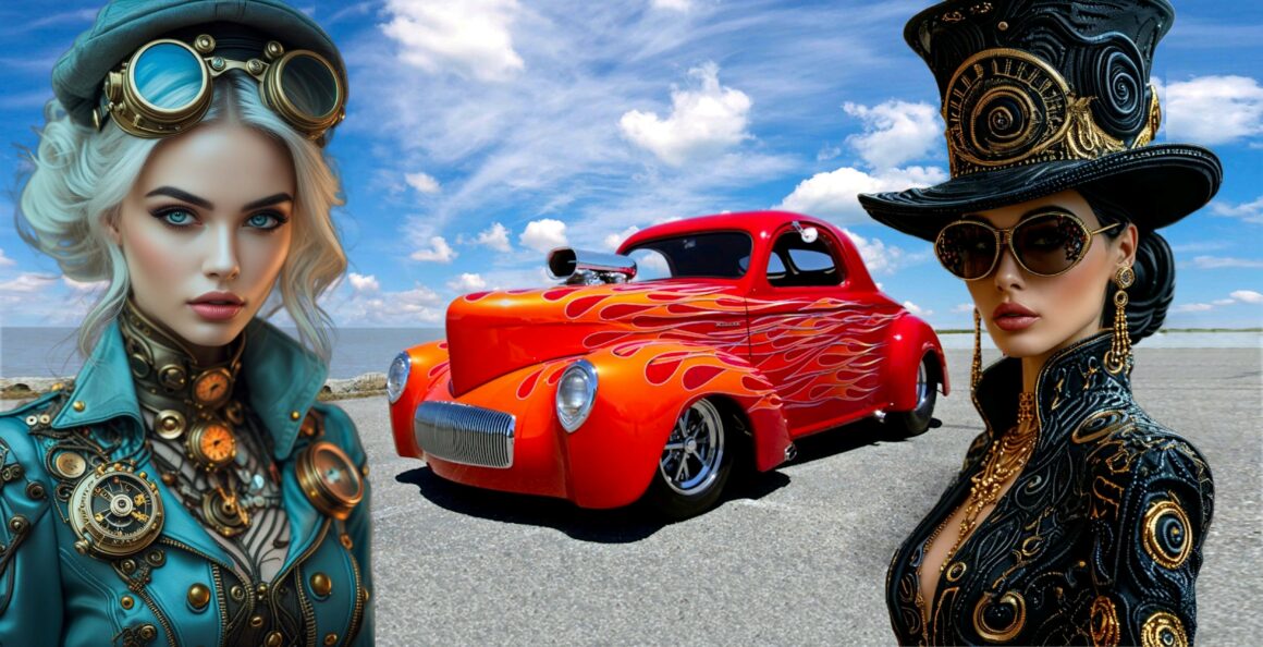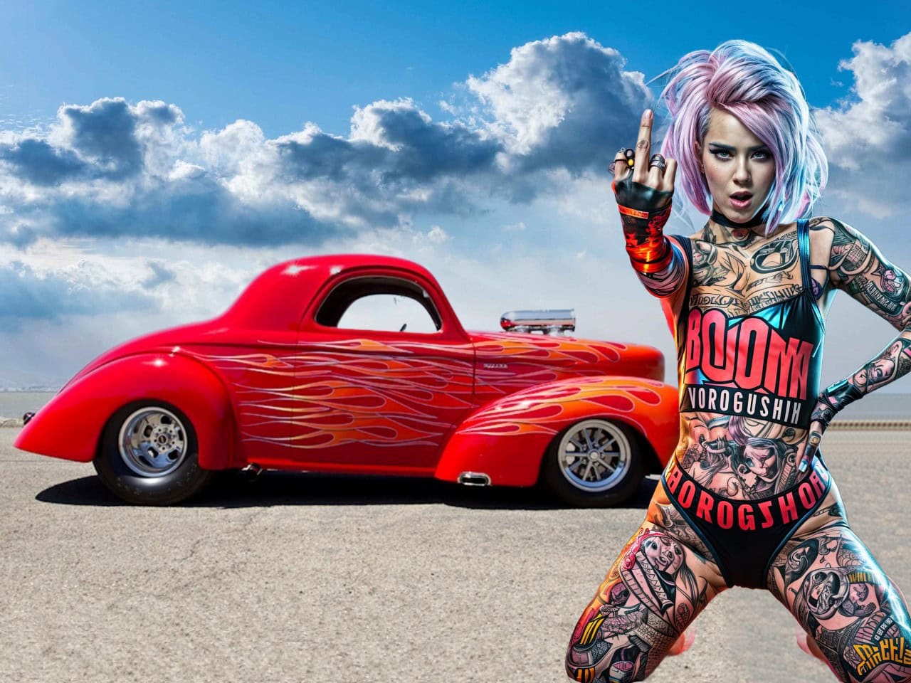 Et comme je n’en ai plus rien à f… ni de comptes à rendre (sauf au fisc qui surveille) j’en viens enfin au Hot Rod Willys qui illustre cet article… J’y ai ajouté diverses nananas IA pour mon plaisir d’enjoliver… Voici quelques lignes de commentaires sur ce Hot Rod de 100.000 $ : C’est un “Pro-street 1941 Willys”, construit entre 2000 et 2004 par “Outlaw châssis”… Ce qui vous fait une belle jambe… Cette bête est motorisée par par un V8 468ci construit de A à Z par “BBC Engineering” dont vous n’en avez rien à f…. Le compresseur est un BDS équipé de 2 carbus Holley quadruples corps (rien à f… idem).