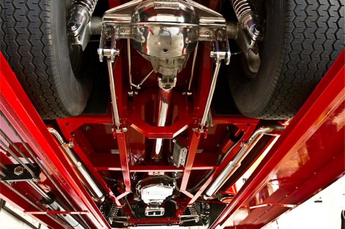 Tant qu’à vous donner des informations inutiles, sachez que les collecteurs sont de chez “Dominator Street Rods”… que la boîte turbo 400 est manœuvrée par un levier “B&M”… que le châssis est “hors-la-loi” 100% maison avec des pièces “Superide Independent” de chez “Heidt”… que la bête dispose de quatre freins “Wilwood” avec des étriers “Aérospace” et des amortisseurs “Alden”… que les pneus arrière sont des “Mickey Thompson” 15 x 15 avec jantes 33 x 21,5… que le pont quick-change en aluminium poli est un “Currie” en 9 pouces… que la pile à combustible fait 15 gallons… et que tous les tuyaux sont en acier inoxydable.