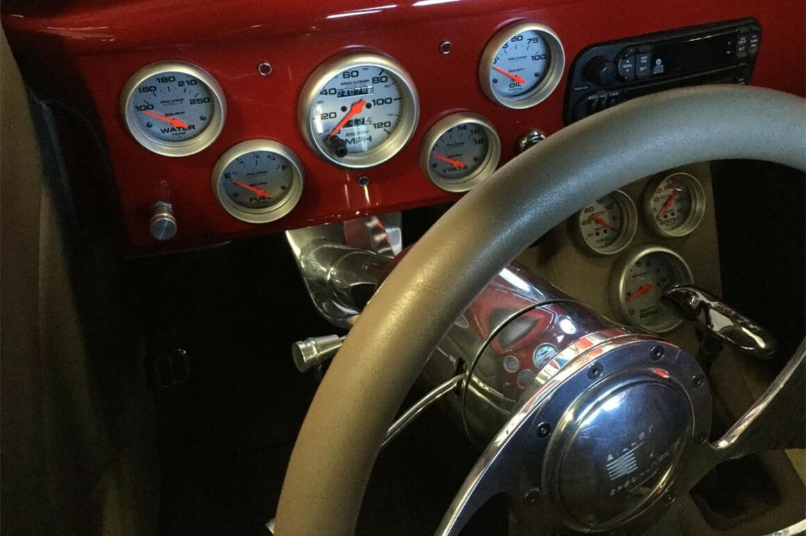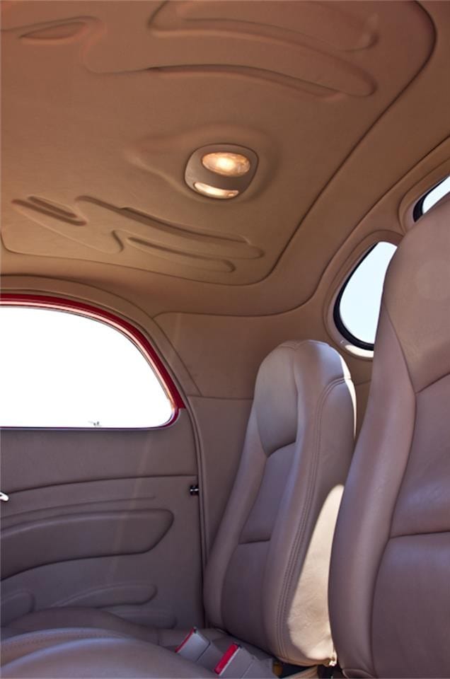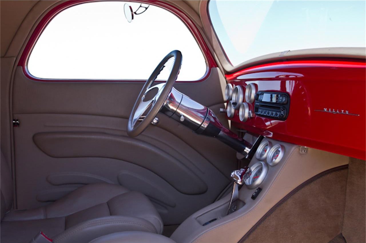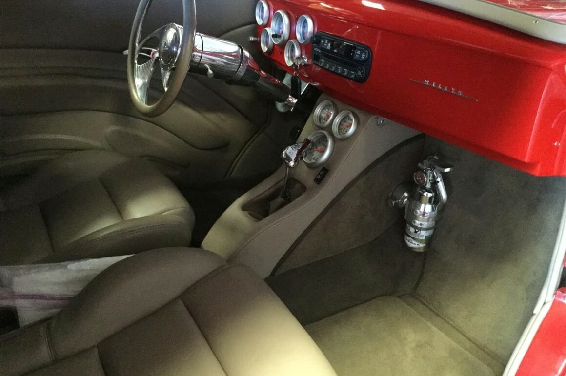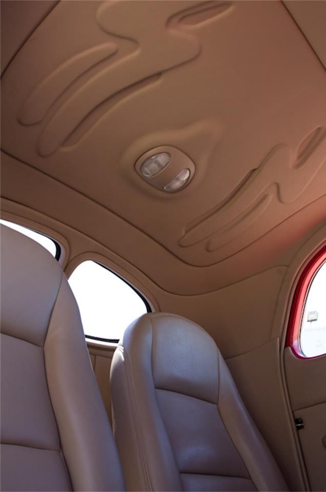 Je me dois toutefois vous écrire que la finition est “extrême”… que la peinture “rouge coquelicot” comporte un exceptionnel travail de flamming effectué par “Mild to Wild”, avec un Ghost très cool d’aigles cachés dans les flammes… que l’intérieur a été réalisé façon design par “Portage Trim” avec des sièges Dodge Viper modifiés… que la colonne de direction est une “I- Did-it – Polishad Aluminium” avec volant “Billet Specialties” et que les compteurs viennent de chez “Autometer”, tandis que les “poppers” des portes et les fenêtres sont électriques à distance et que beaucoup de 1er prix ont été remportés ! Rien à f…