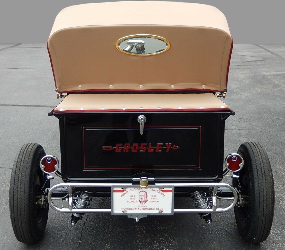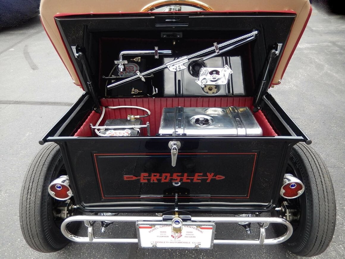 Remarquez que la rainure de la ligne de caractère sur le côté de la voiture faisait partie de la conception de la trémie à charbon d’origine. Dans les années ’70 et ’80 Tim Freshley a changé la coque du radiateur et les phares, et a peint la voiture en bleu. Puis dans les années 80 il a peint la voiture en rouge et a placé d’autres jantes et de nouveaux phares. Puis un moteur NOS Crosley récupéré d’un générateur de surplus de l’armée a été installé..