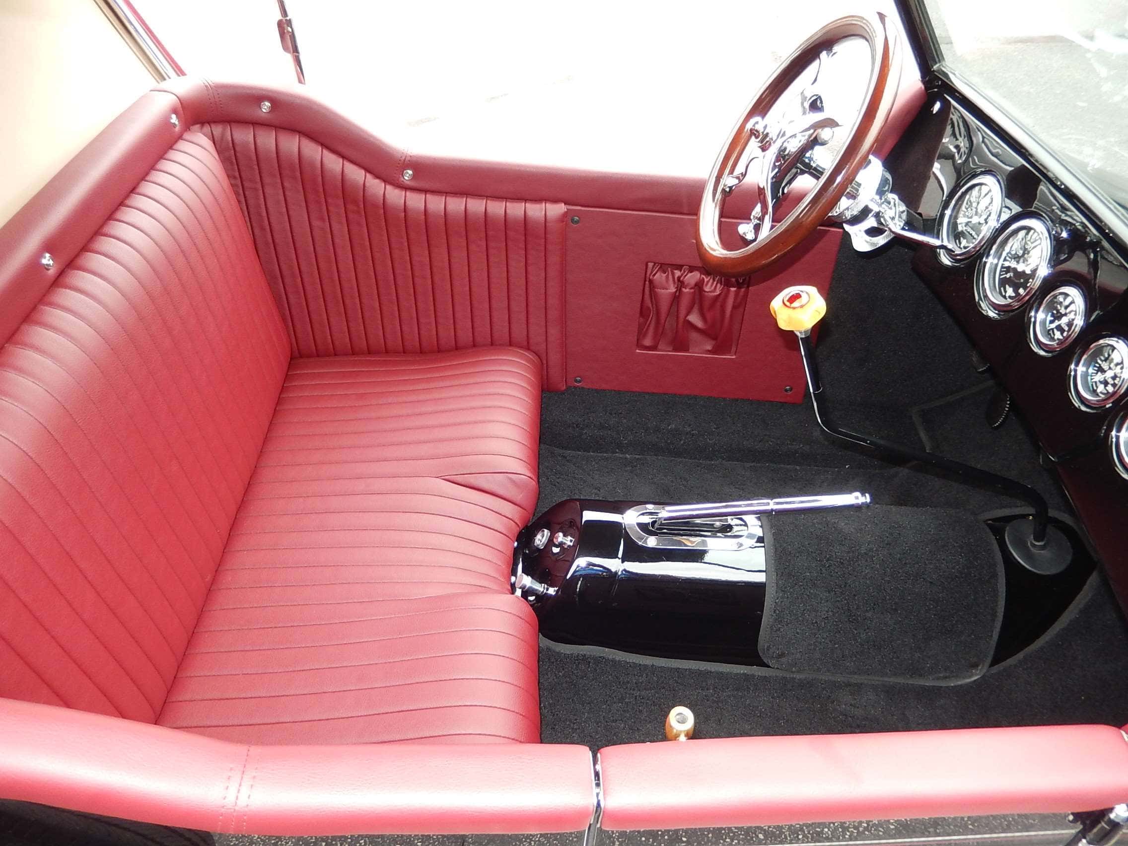 La sellerie intérieure et du coffre a été réalisée en cuir bordeaux. Le T’Bucket ne dispose que d’une seule porte côté passager, d’un système de compteurs complet et d’un volant sut colonne inclinable Fatman. Une colonne de direction originale a été modifiée et les leviers qui étaient les commandes d’accélérateur et d’allumage ont été convertis en étrangleur et en feux de signalisation…