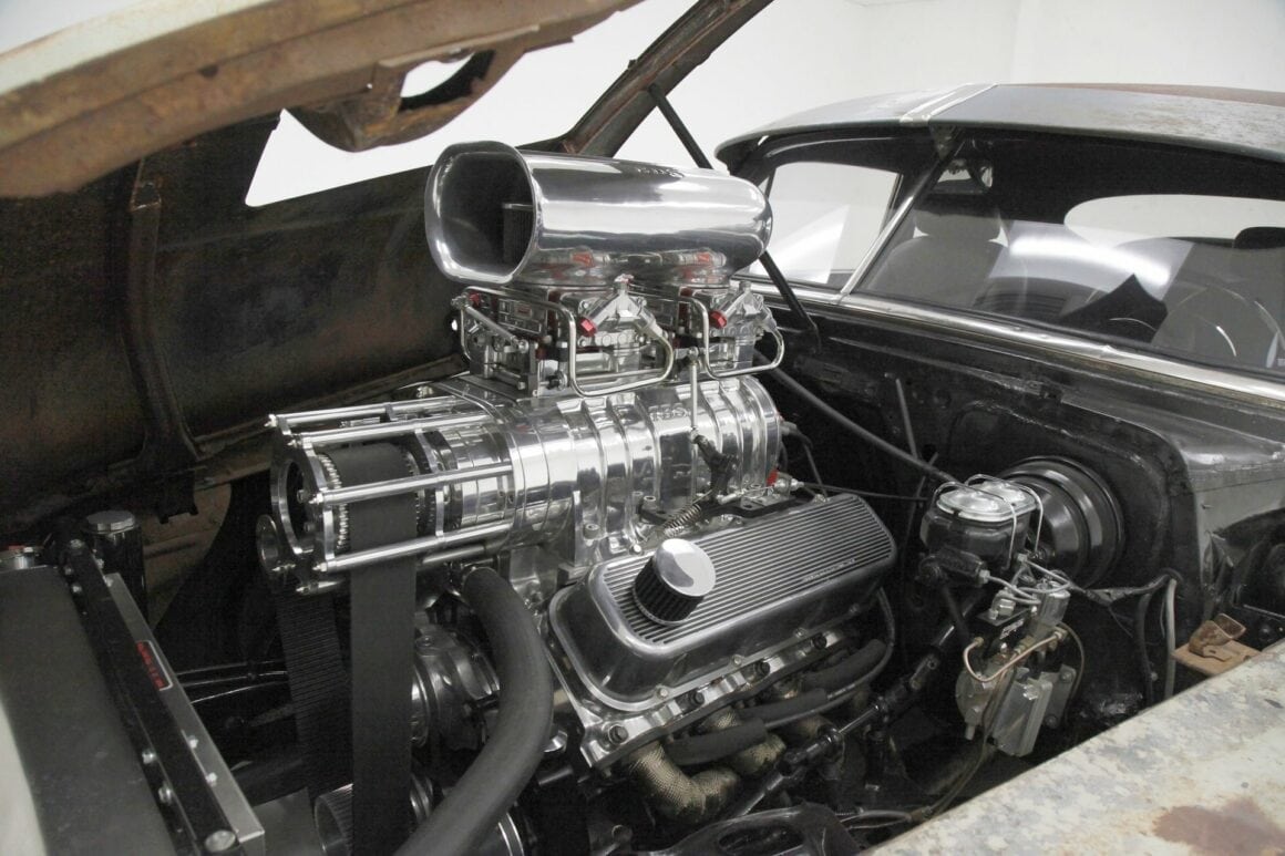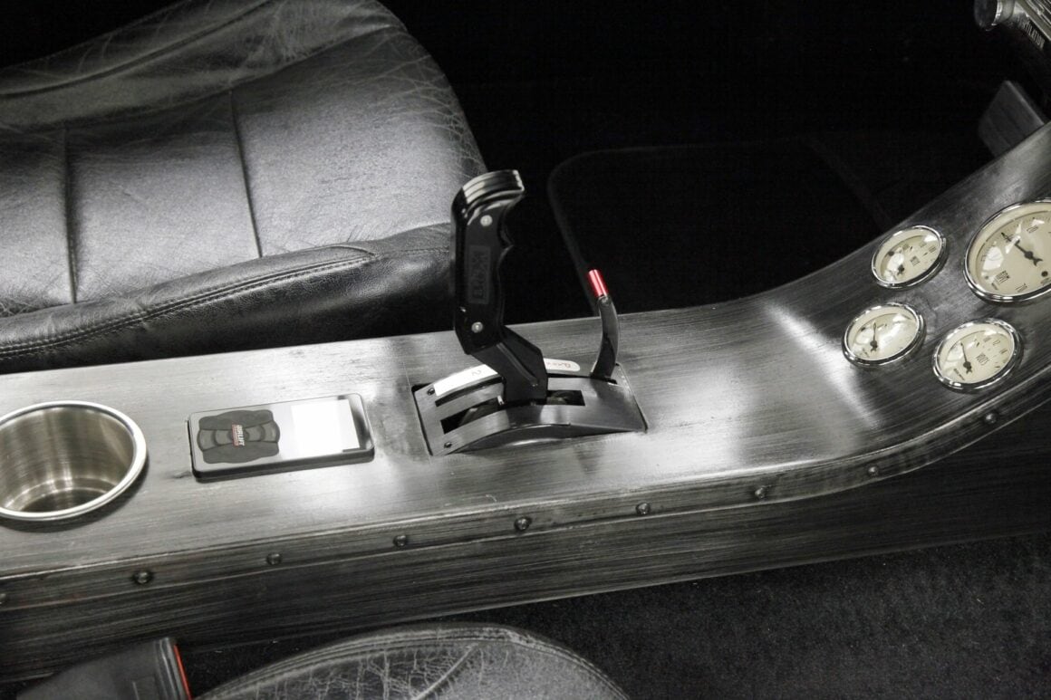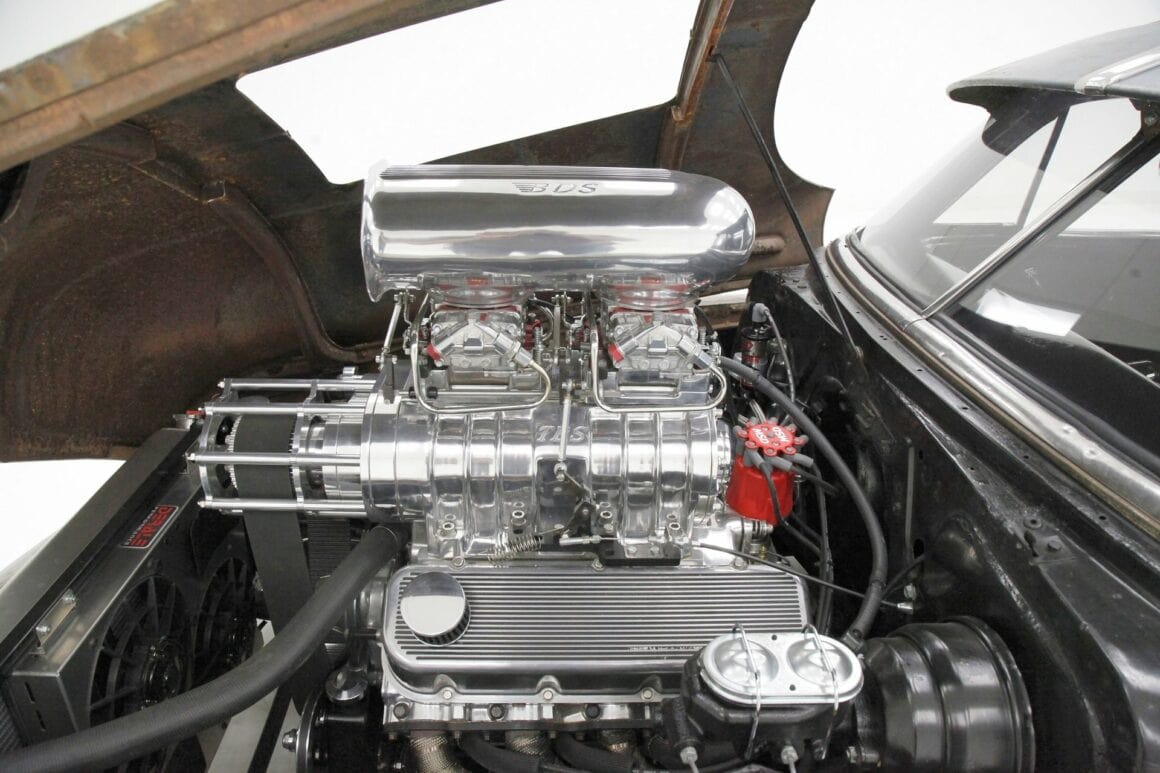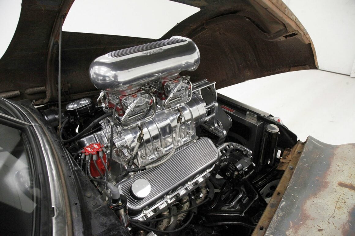 La banquette arrière a été retirée et à sa place se trouve une étagère. Une belle moquette noire étonnement propre) recouvre les planchers et une console en zébré noir et argent court entre les sièges tenant en respect le levier de vitesses B&M Pro Stealth, le contrôleur d’air et 4 compteurs AutoMeter “antiques”. Un tableau de bord en métal noir semble flotte dans le vide de l’au-dessus (sic !) à l’avant et est orné d’une foule de compteurs, d’une radio et d’un groupe de boutons aux usages abscons, le tout en chrome. Une jolie garniture de toit noire incurvée “serrée” est la touche de déglingué de tout cet intérieur rétro-moderne. Le V8 496ci V8 amélioré par Big Al’s Toybox, produit 840cv avec du 93 octane, réside sous le capot de style charnière du cercueil. Il est surmonté d’un compresseur type 871 avec une paire de carburateurs Quickfuel 4 corps. Ce moulin monstre dispose d’une boîte automatique TH400 à 3 vitesses construite avec un corps de soupape manuelle inversée derrière elle. À l’arrière, (littéralement), se trouve un essieu arrière Ford de 9 pouces avec un engrenage de 3,90.