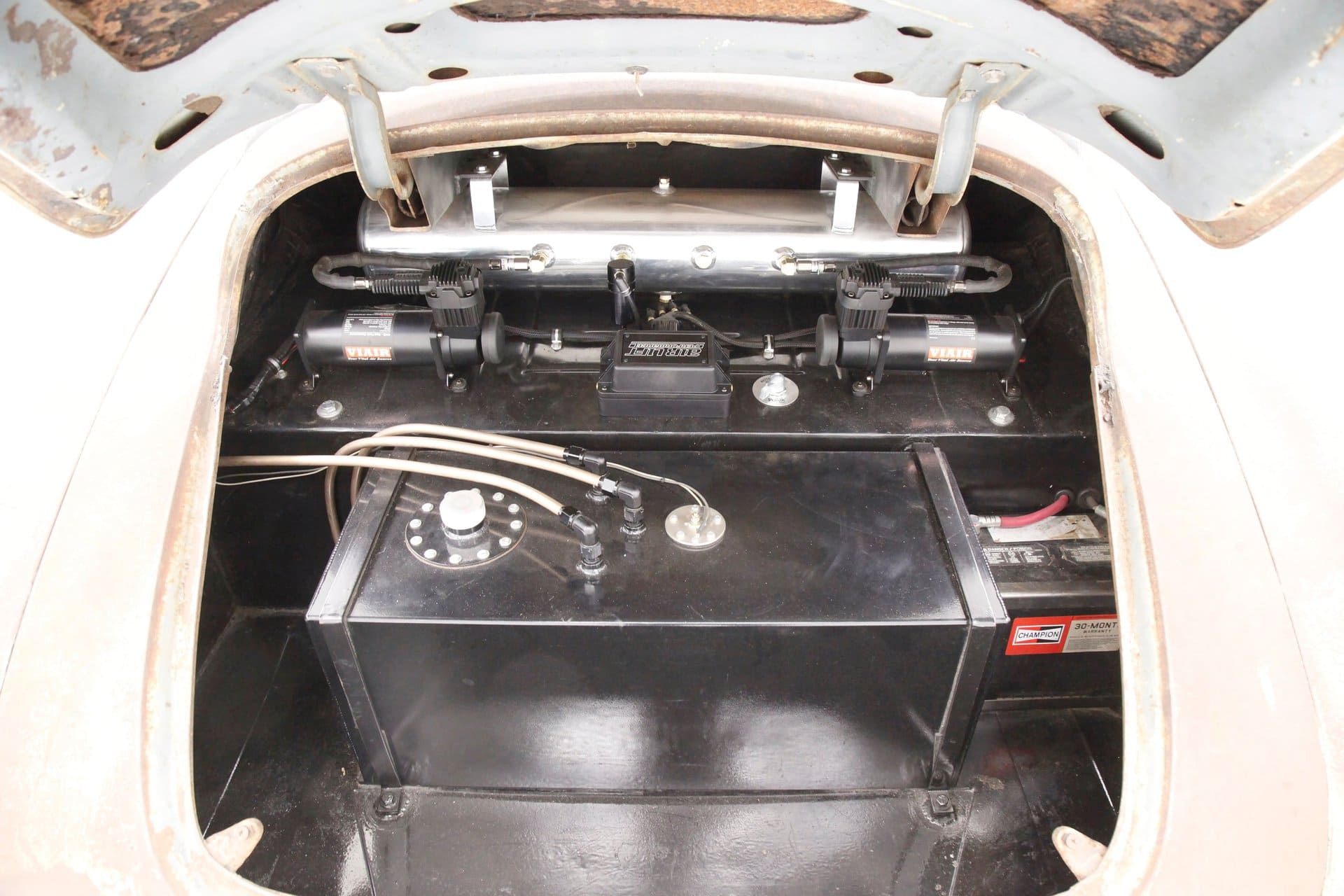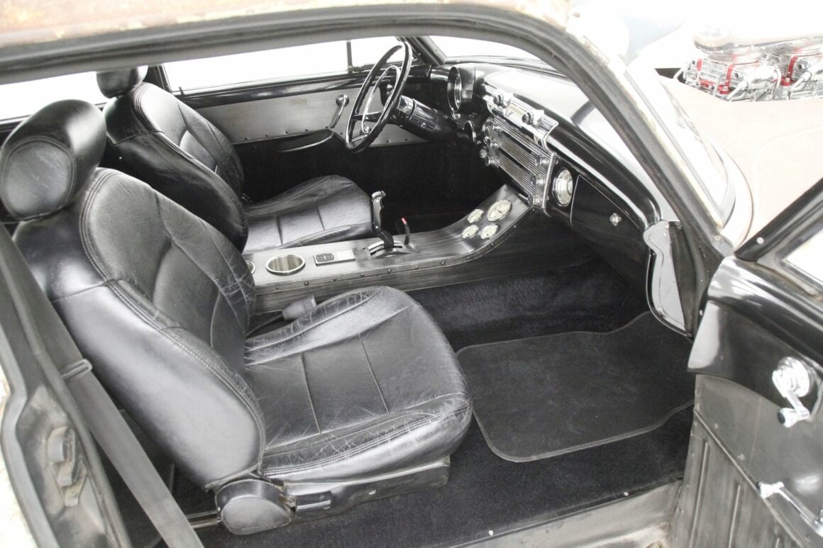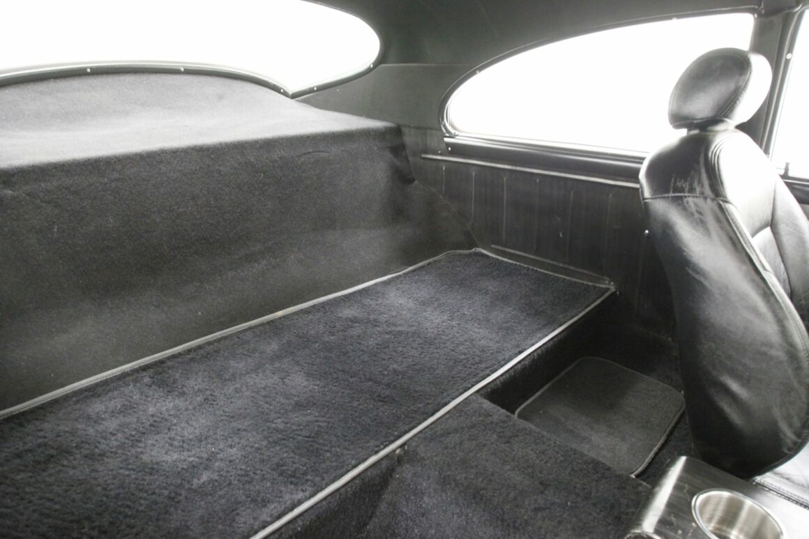 La banquette arrière a été retirée et à sa place se trouve une étagère. Une belle moquette noire étonnement propre) recouvre les planchers et une console en zébré noir et argent court entre les sièges tenant en respect le levier de vitesses B&M Pro Stealth, le contrôleur d’air et 4 compteurs AutoMeter “antiques”. Un tableau de bord en métal noir semble flotte dans le vide de l’au-dessus (sic !) à l’avant et est orné d’une foule de compteurs, d’une radio et d’un groupe de boutons aux usages abscons, le tout en chrome. Une jolie garniture de toit noire incurvée “serrée” est la touche de déglingué de tout cet intérieur rétro-moderne. Le V8 496ci V8 amélioré par Big Al’s Toybox, produit 840cv avec du 93 octane, réside sous le capot de style charnière du cercueil. Il est surmonté d’un compresseur type 871 avec une paire de carburateurs Quickfuel 4 corps. Ce moulin monstre dispose d’une boîte automatique TH400 à 3 vitesses construite avec un corps de soupape manuelle inversée derrière elle. À l’arrière, (littéralement), se trouve un essieu arrière Ford de 9 pouces avec un engrenage de 3,90.