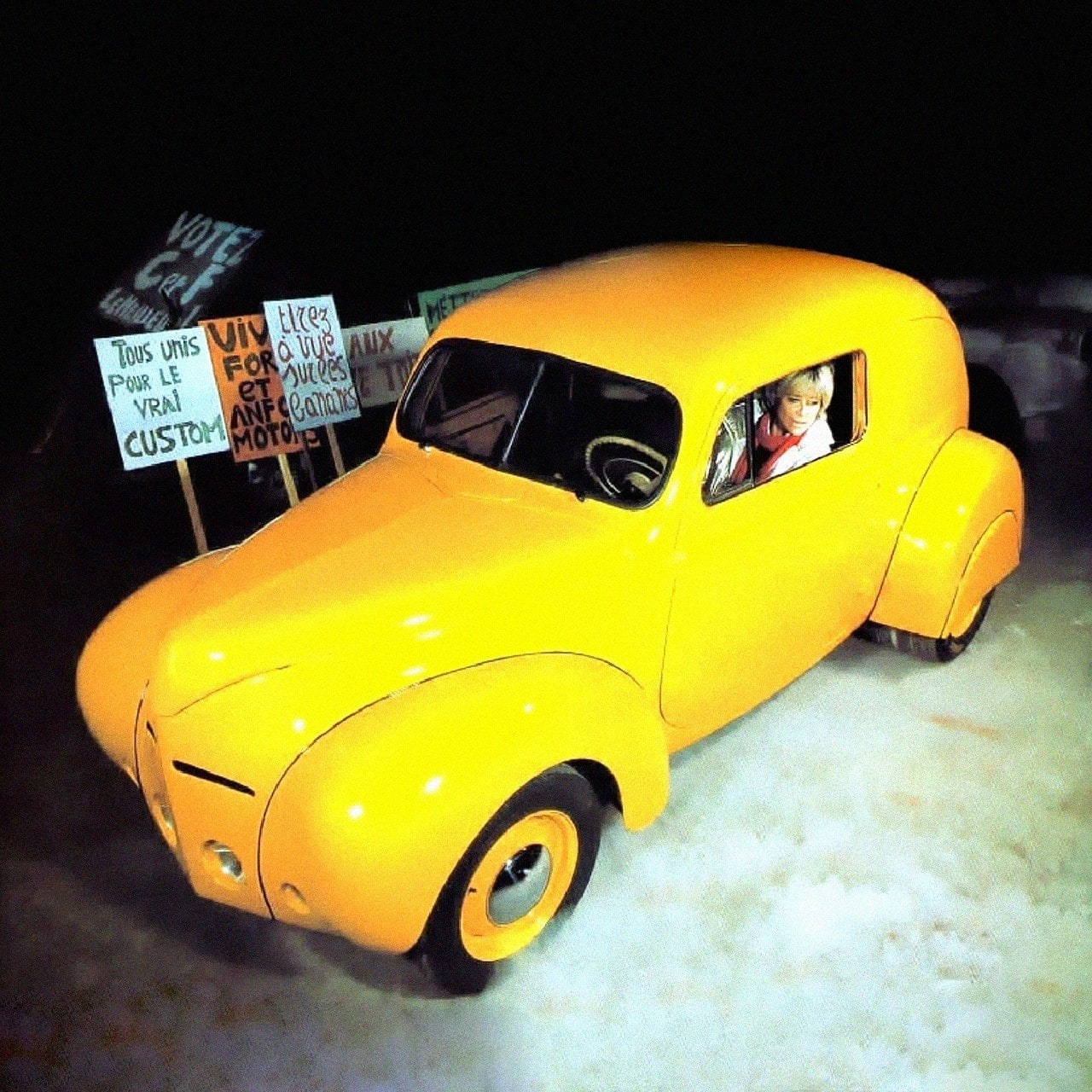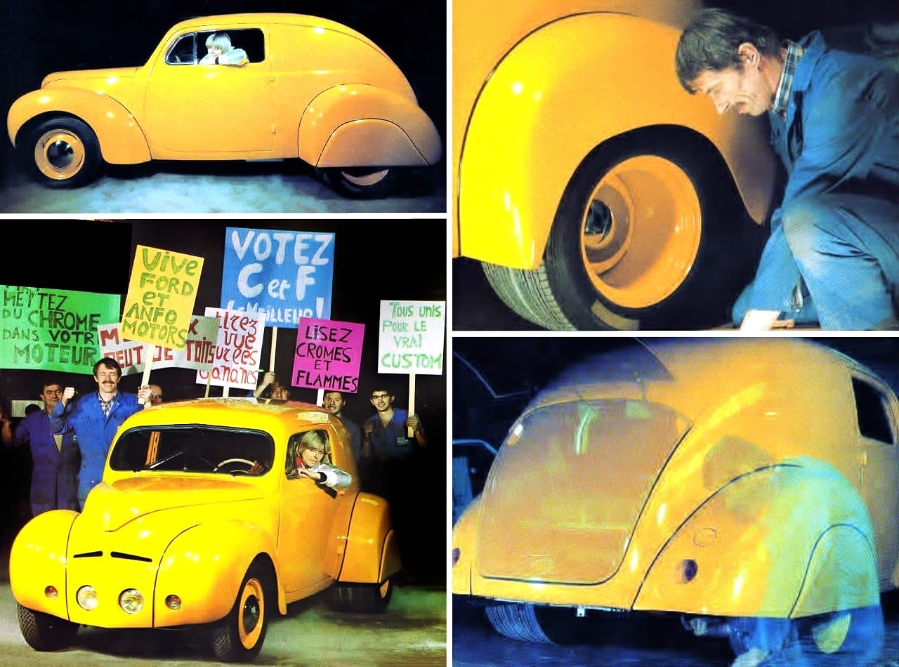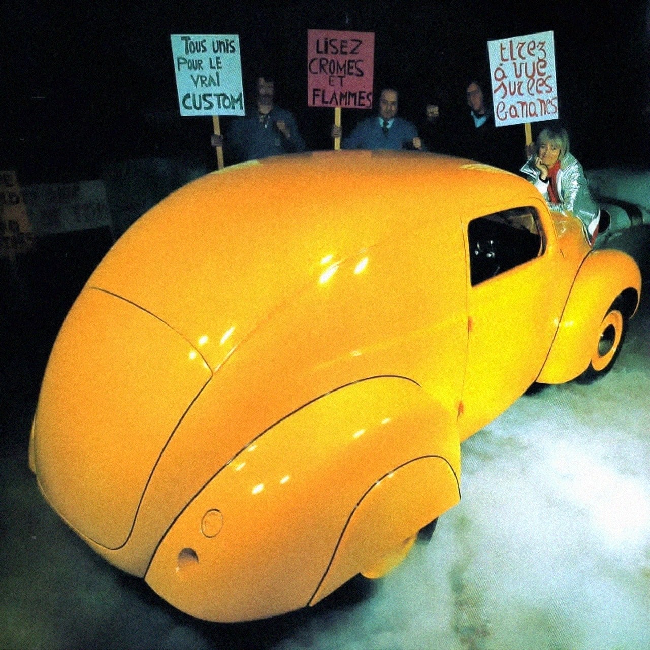 Pourtant pour pousser le bouchon le plus loin possible, les trois engins avaient été peints dans le même jaune, histoire de capter l’attention, et de donner une touche d’uniformité de Façon à ce que les 3 engins symbolisent parfaitement le magazine Chromes&Flammes…, j’étais même occupé a préparer la remise en peinture jaune de l’Oldsmobile ’48, du Tricycle V-12 et du Hot-Rod C-Cab “Novel-T”, lorsque je me suis rendu compte du peu d’intérêt de ces transformations auprès du public français, qui continuait dans la voie des rnural’s et des Peugeot 203 avec feux de toit !