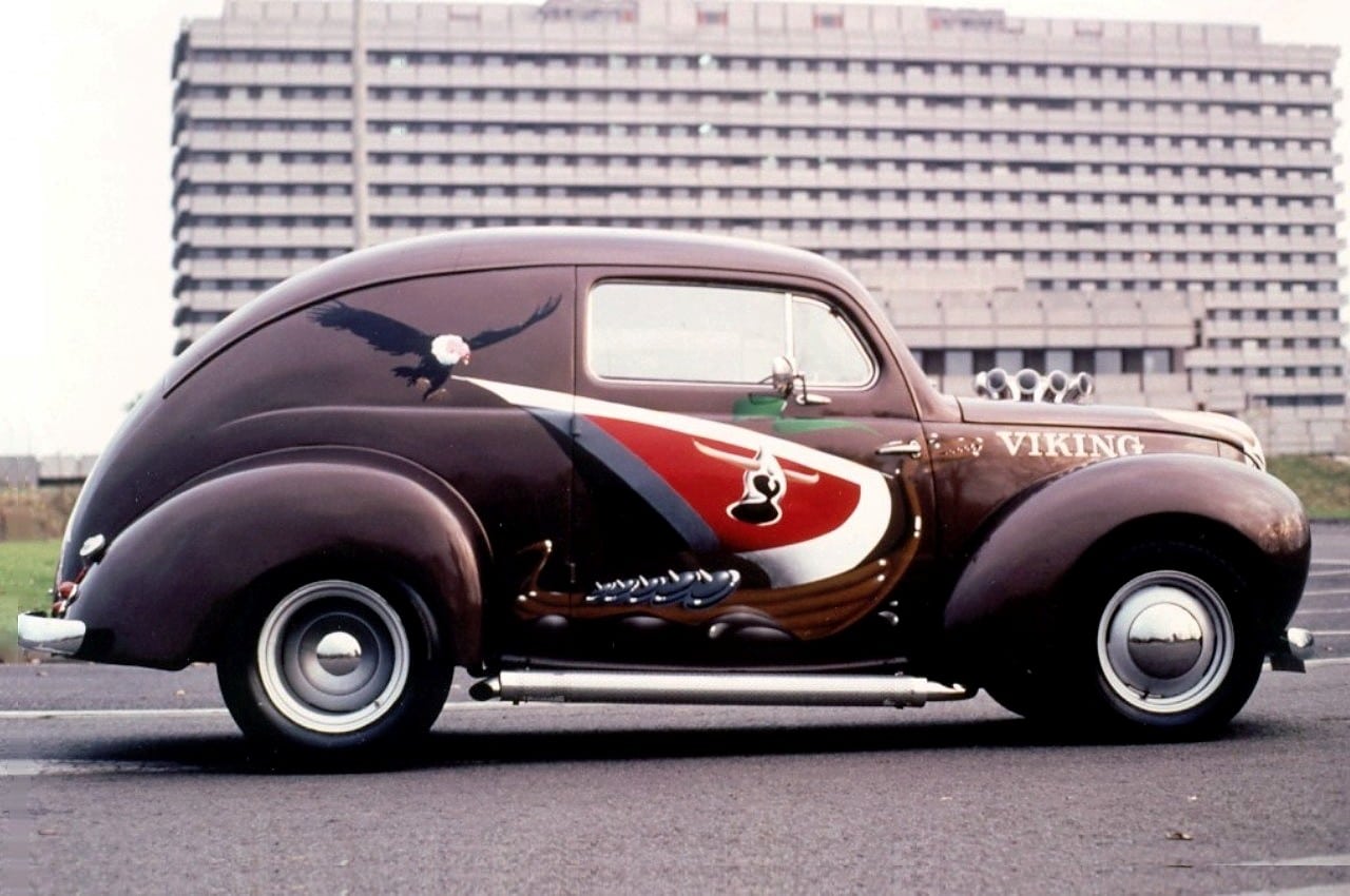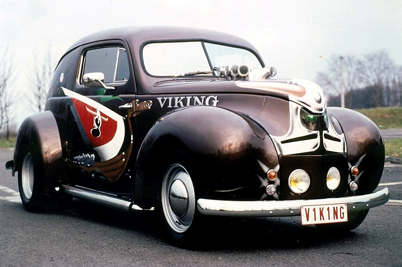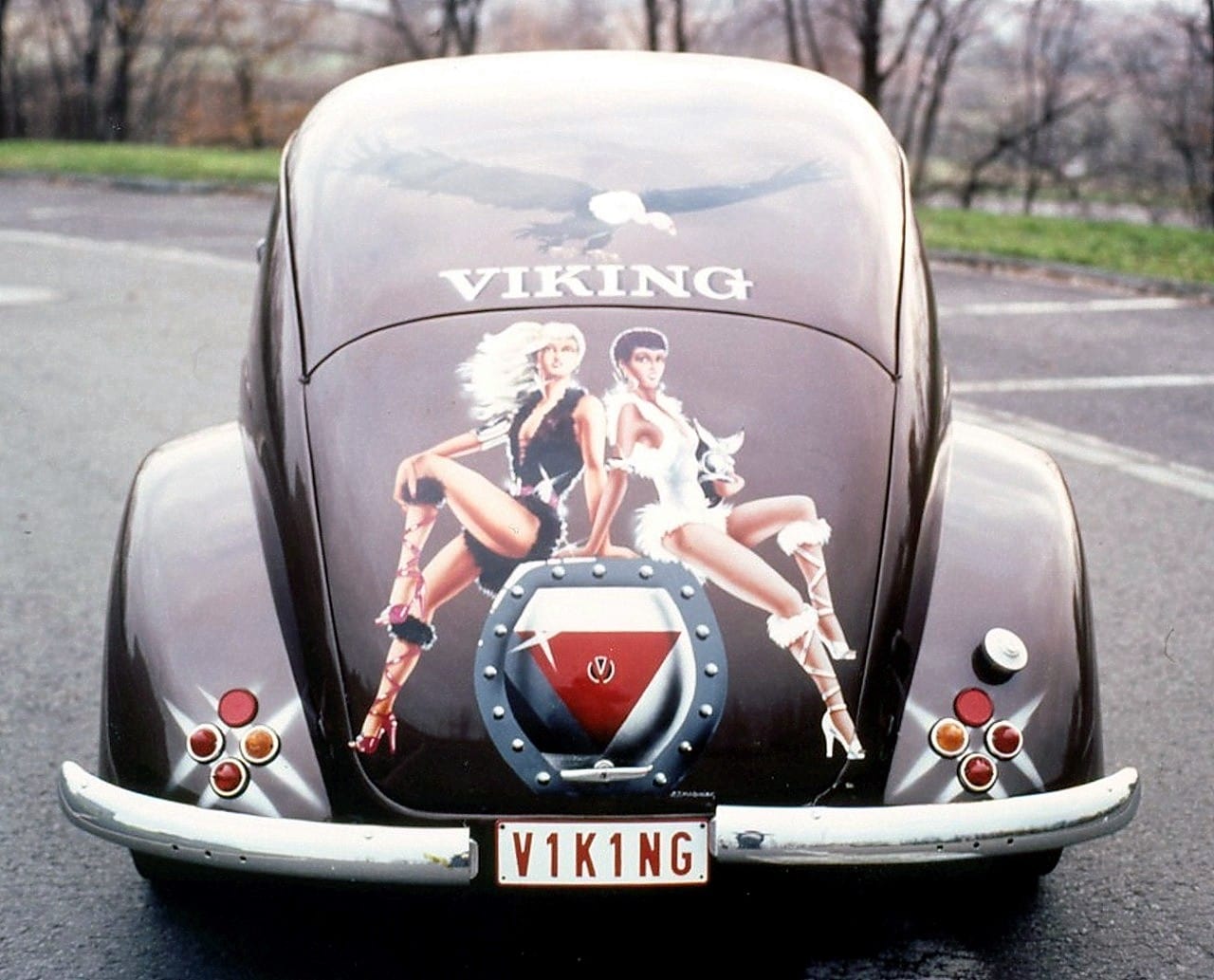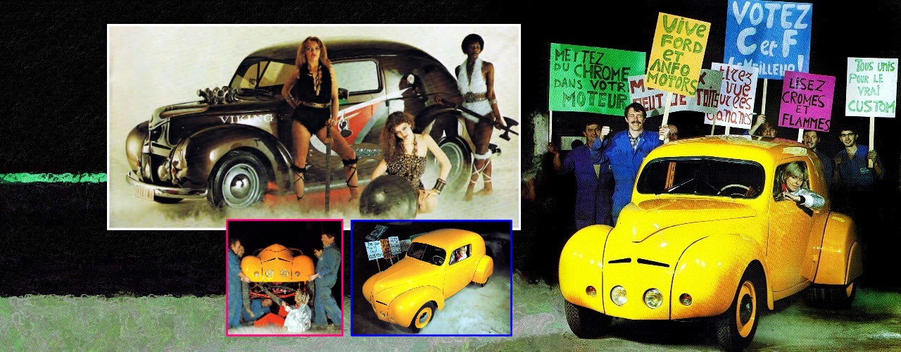 Ils sont re-publiés dans www.GatsbyOnline.com, est à l’origine du Custom en Europe Continentale. Cette Taunus, a débuté avec une décoration dans le thème de la saga des Vikings, avec Drakkar, dragons et femmes vêtues de peaux de bêtes…, tout un programme…, elle fut la vedette en couverture et poster dans le tout premier numéro de Chromes&Flammes qui s’appelait alors “Pretty-Car”… Je suppose que c’est en partie à cause de cela, que toutes les décorations dites “murales” dans le milieu du Custom français sont devenues ce qu’elles sont… Mais reconnaissez-moi toutefois d’avoir le premier voulu aller de l’avant en jetant les décors antiques, tout comme les quincailleries inutiles, dans la poubelle de l’histoire du Custom…