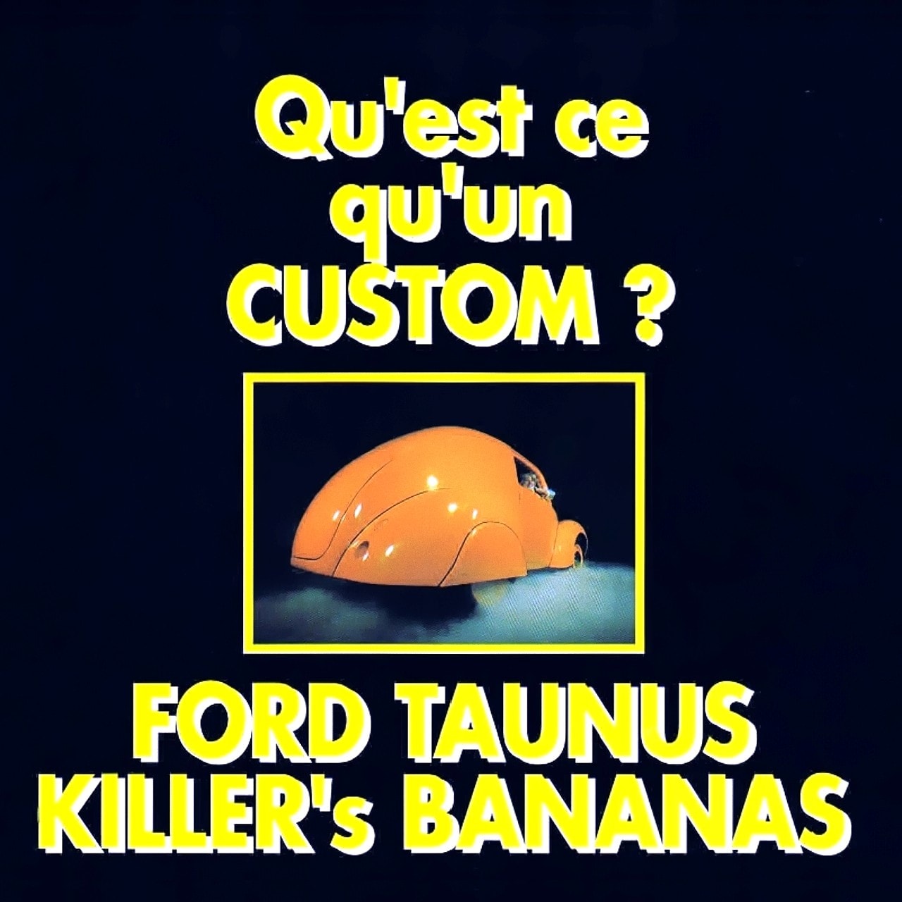 Quelques voitures d’aspect tout à fait conventionnel étaient dotées de moteurs V8 très puissants, ce qui, dans un innocent coupé Ford produisait un mélange suffisamment détonnant pour coiffer sur le poteau tout impudent qui osait venir les snober…, la recette était simple: un moteur qui fait décoller une caisse lourde, placé dans une caisse plus légère…, c’était à manier avec prudence, un mélange explosif ! Pour illustrer cet article et en revenir aux Custom’s des débuts de Chromes&Flammes en France, je vous présente un des 10 grands mythes automobiles du monde du Custom français des années ’80, à savoir la très curieuse Ford Taunus Killer’s Bananas, qui, aux cotés, de la fameuse Oldsmobile’48 décrite en long et en large dans quelques articles…