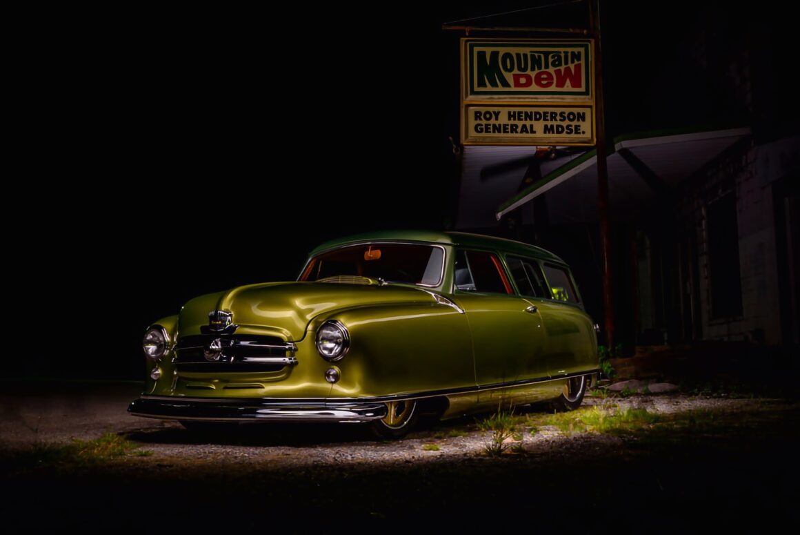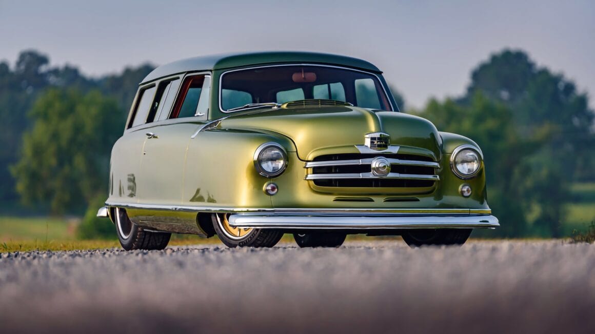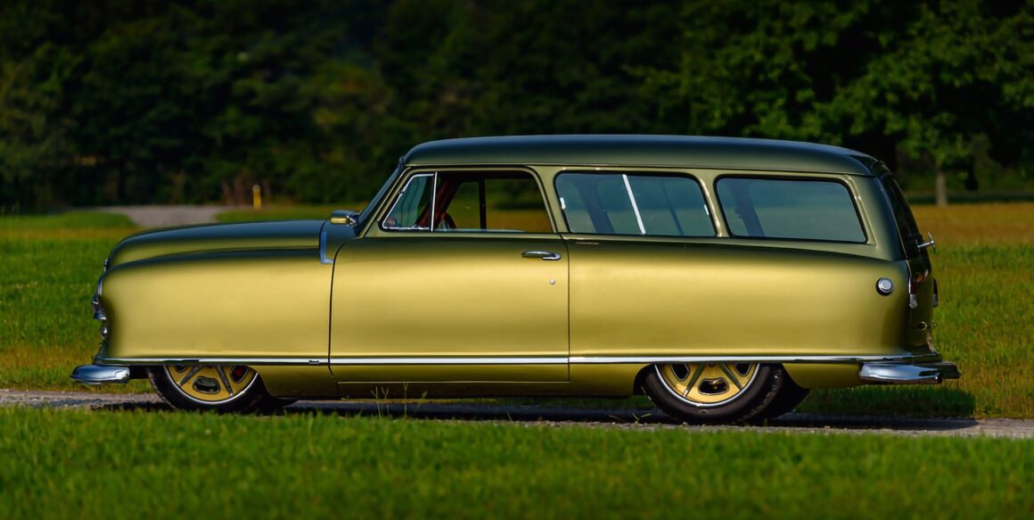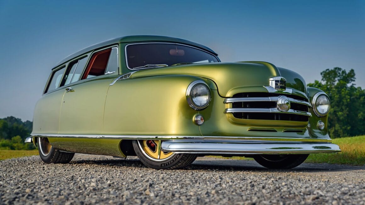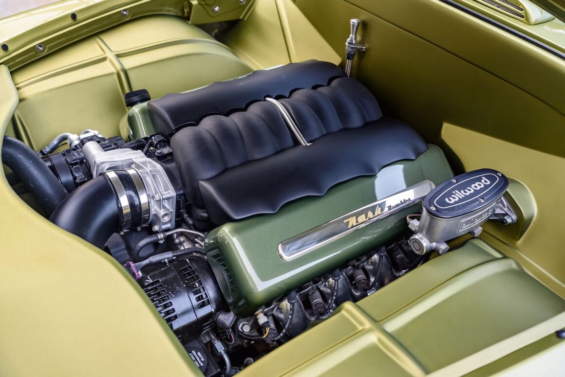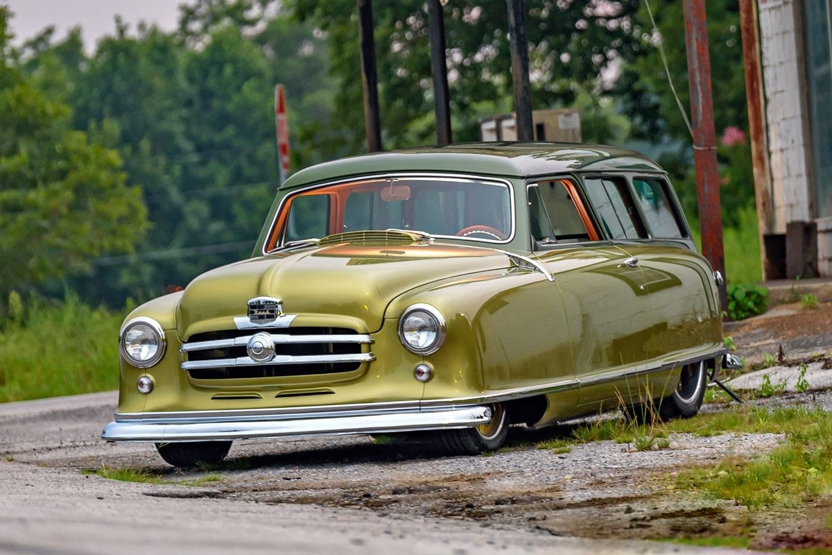 J’en cite en vrac quelques ‘unes telles que “les bacs des roues”, les garnitures inférieures sur mesure et le pare-chocs arrière moulé autour d’embouts d’échappement ovales de Cadillac. La peinture verte bicolore personnalisée de la Nash est exactement celle des dessins d’époque de Fred Hardee, ici elle provient de BASF Diamont et le look surréaliste a été complété par des jantes “Hot Rods by Boyd” en bronze teinte “centenaire” brossé.