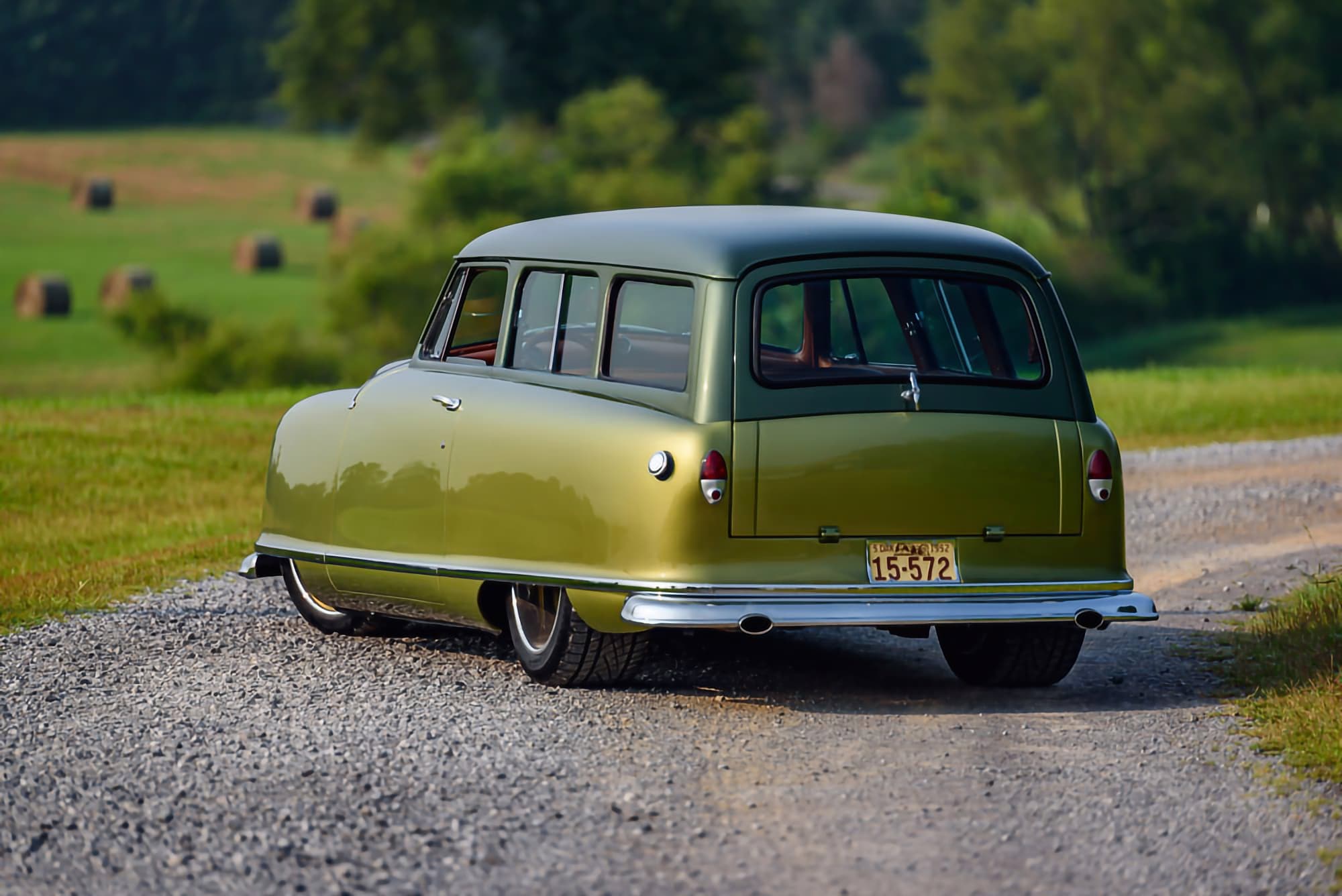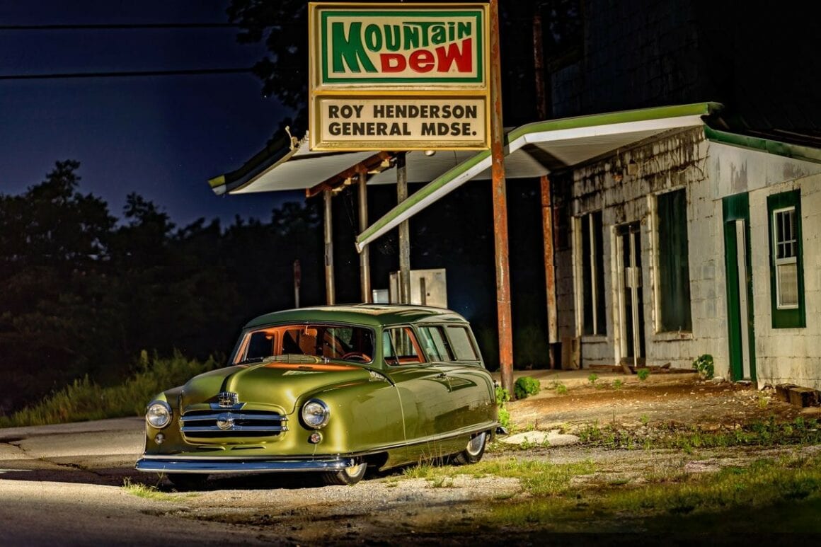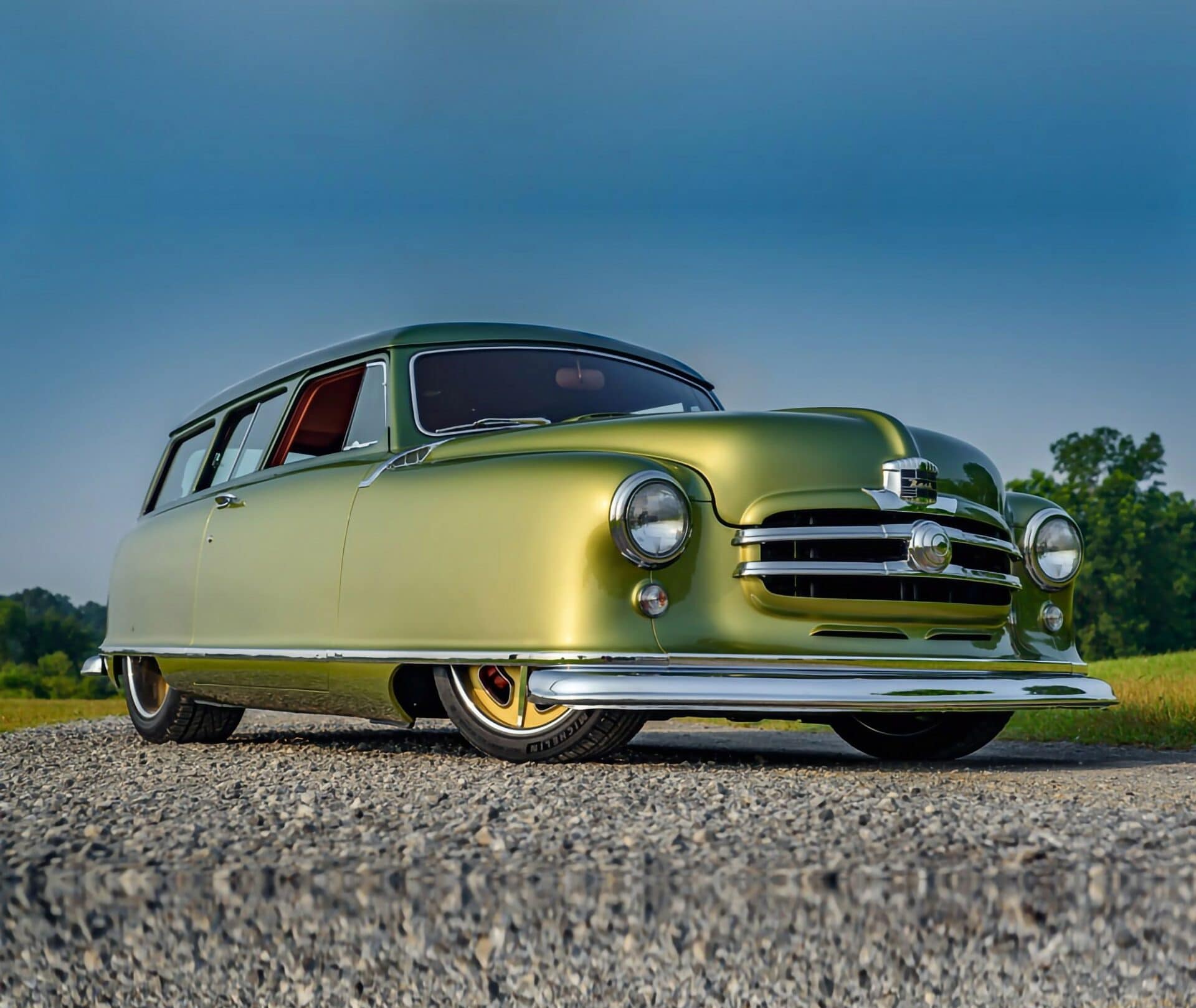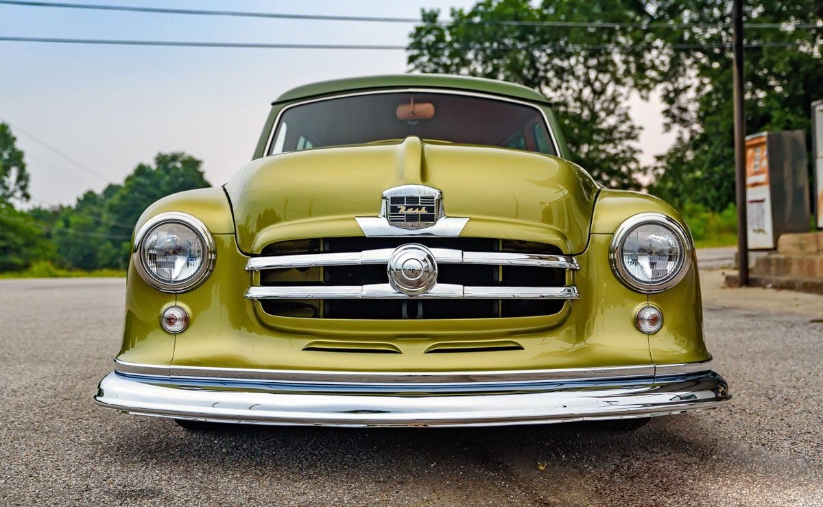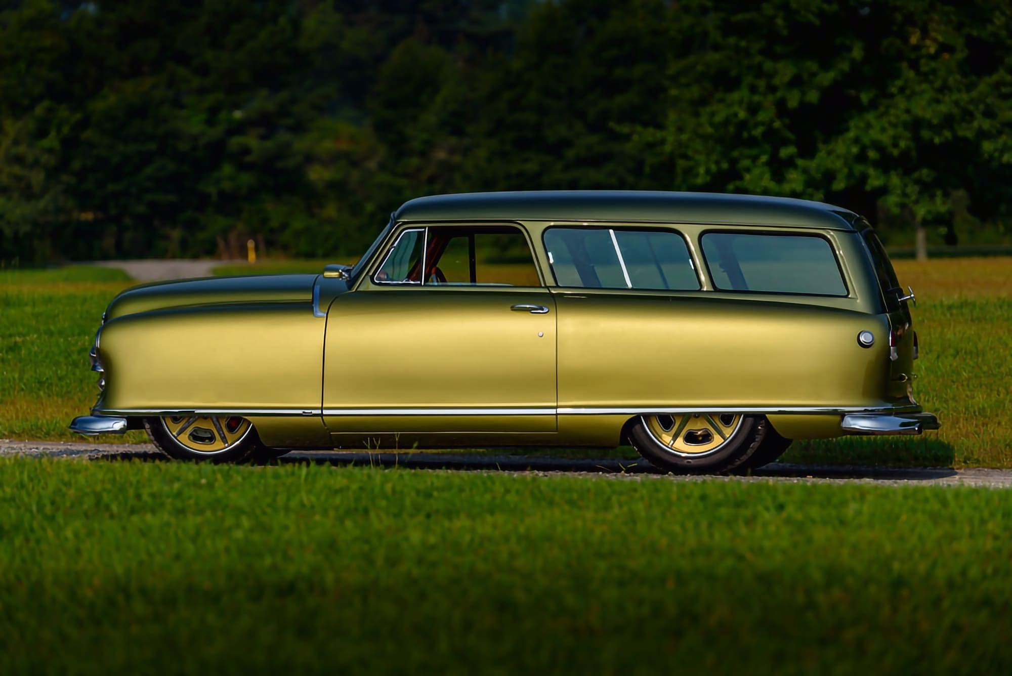 J’en cite en vrac quelques ‘unes telles que “les bacs des roues”, les garnitures inférieures sur mesure et le pare-chocs arrière moulé autour d’embouts d’échappement ovales de Cadillac. La peinture verte bicolore personnalisée de la Nash est exactement celle des dessins d’époque de Fred Hardee, ici elle provient de BASF Diamont et le look surréaliste a été complété par des jantes “Hot Rods by Boyd” en bronze teinte “centenaire” brossé.