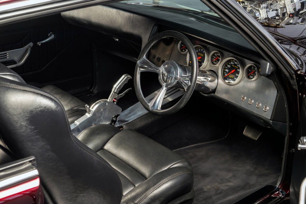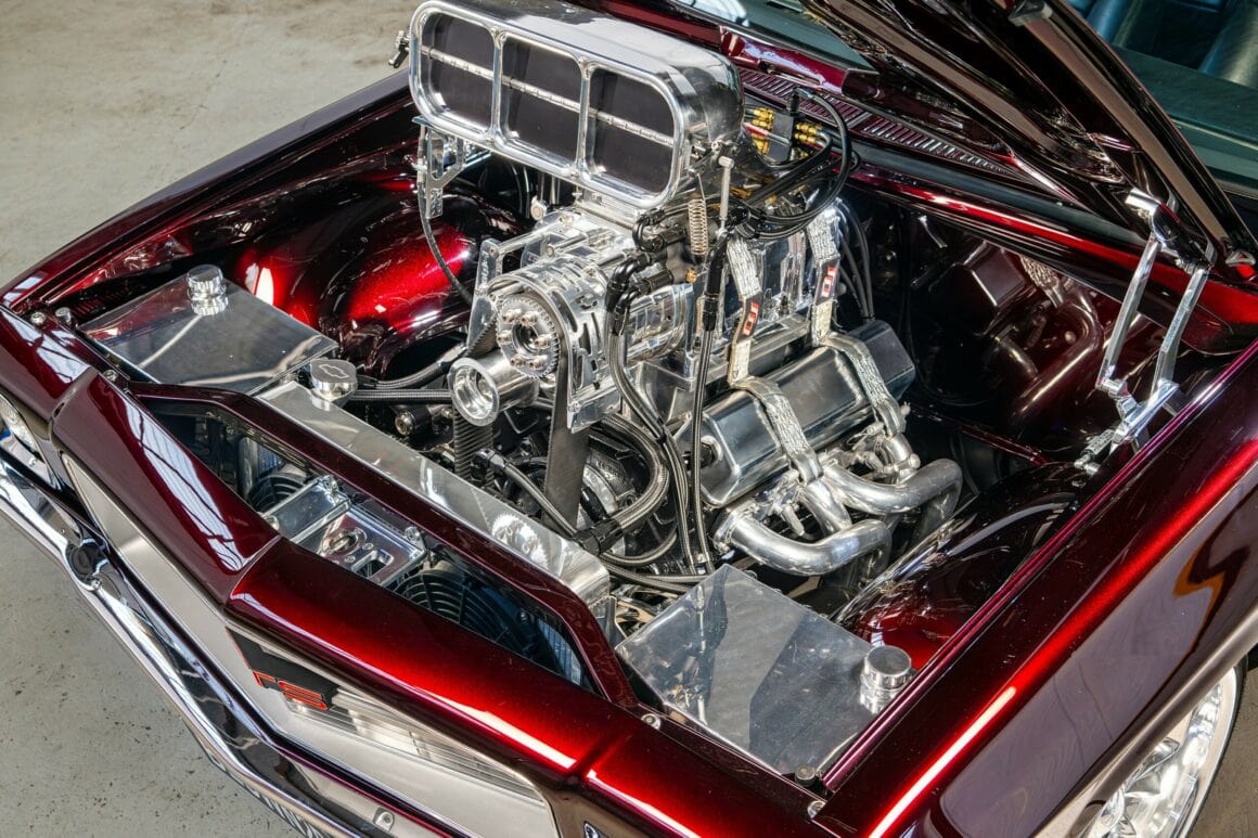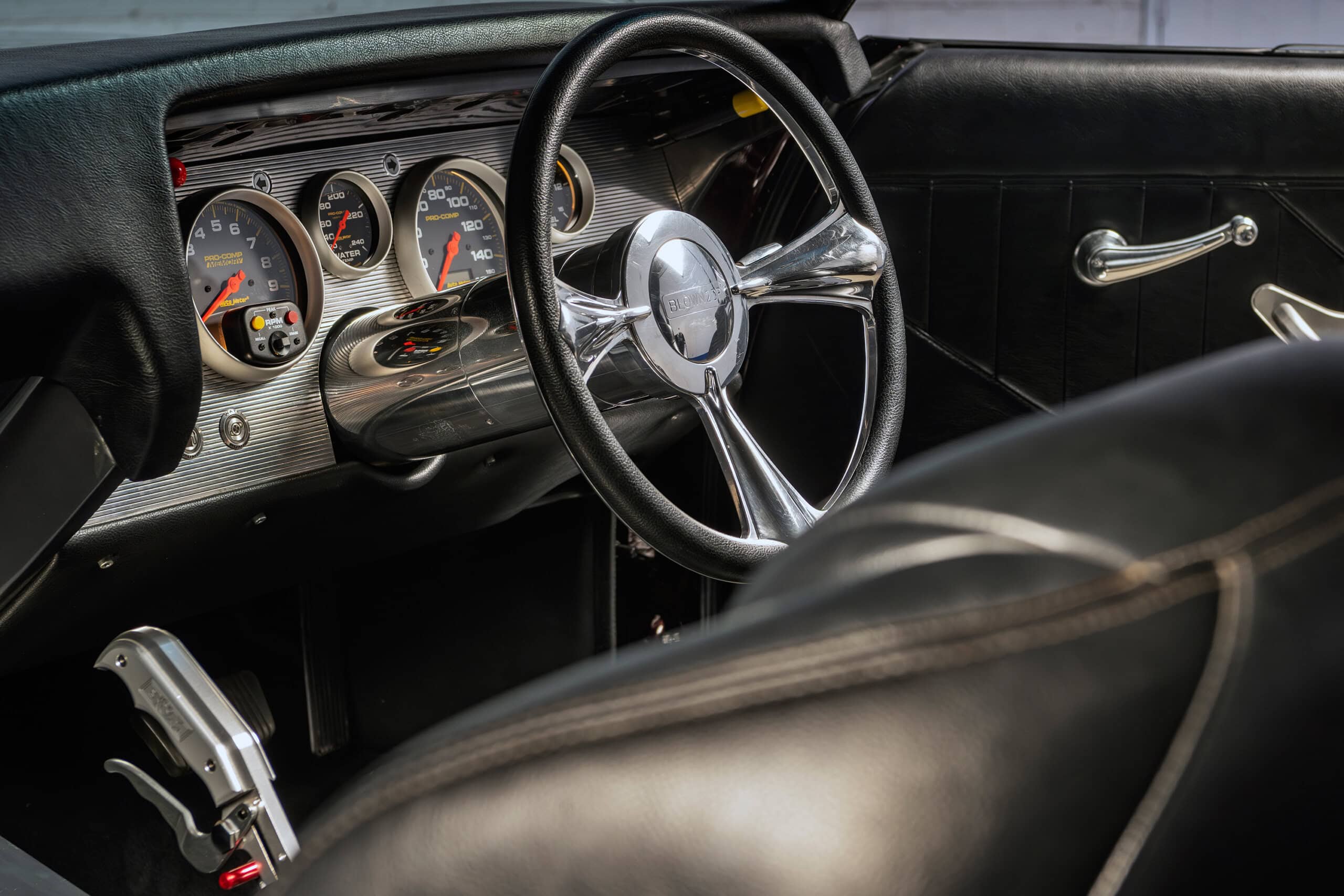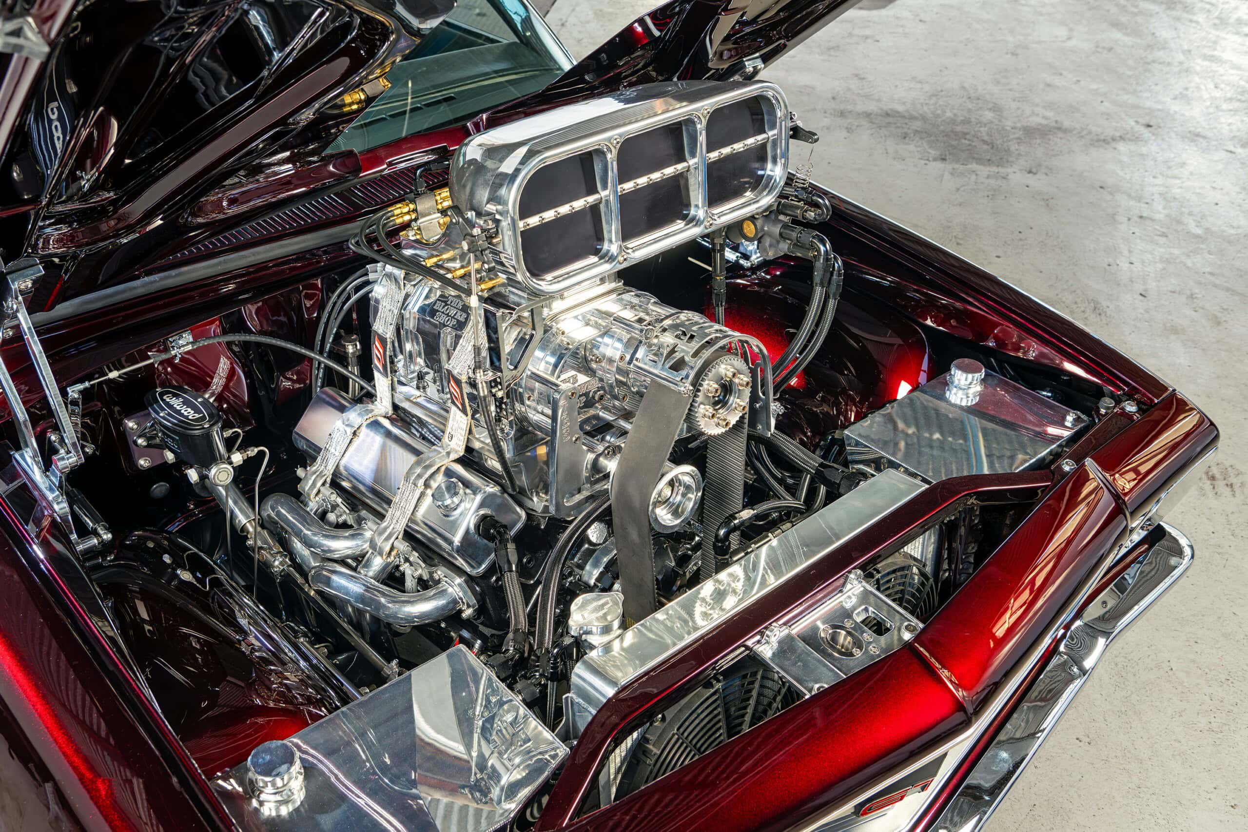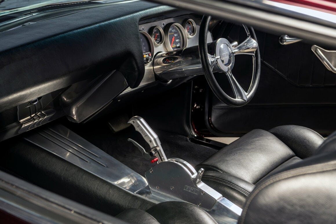 Mais le moteur est le même Chevy 406ci qui arbore maintenant un Fowler avec des papillons à ports-carrés-usinés CNC de chez Myers. Le “donk” d’amélioration était basé sur un bloc Dart Little M également regonflé à 406ci mais rempli de pistons JE, de bielles Scat et de tiges Childs & Albert. C’est essentiellement le même combo qui était dans la voiture lorsque qu’elle a été présenté pour la première fois sous sa nouvelle apparence, bien que le magnifique Blower 6/71 TBS soit maintenant surmonté d’un Fowler XAcuter Falcon de chez Gary Myers. Beaucoup plus d’efforts ont également été consacrés aux détails du compartiment moteur, le V8 portant désormais des cache-culbuteurs en billette, de plus l’ancien servofrein chromé et le maître-cylindre ont été remplacés par une unité Wilwood.