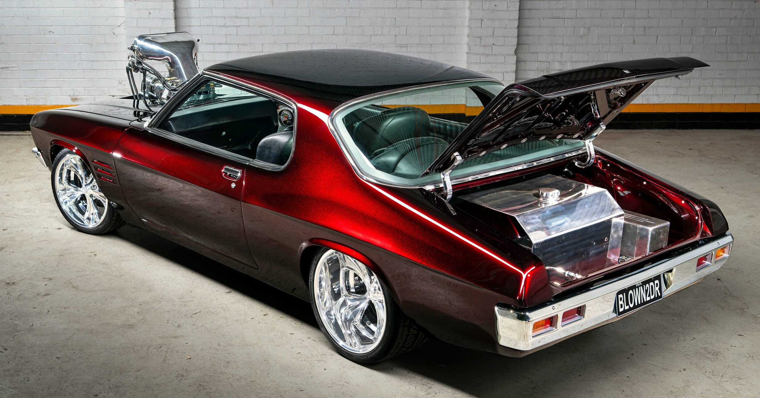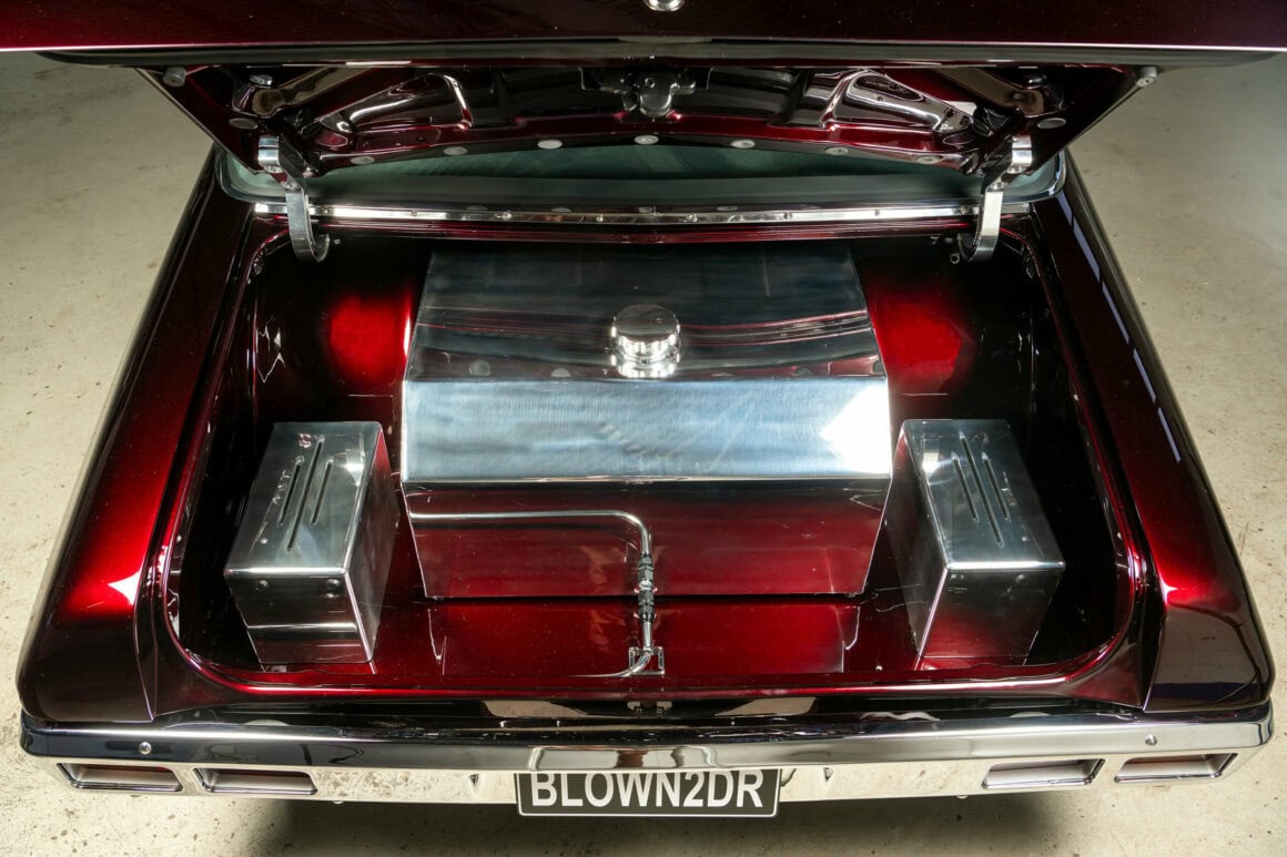 Les raccords anodisés rouges et bleus sont maintenant noirs. Tous les éléments en alliage ont été rehaussés d’un éclat miroir grâce à la magie de Kustom Chrome. Le coffre mérite le détour d’être vu…. Certes, Noddy ne portera plus d’Eskies ou de transats à l’arrière, mais la combinaison de la peinture Brandywine et de l’aluminium poli est incroyable. Des améliorations ont également été apportées à l’intérieur, qui conserve les sièges CV8 Monaro, mais la banquette arrière a été modifiée pour s’adapter et une coque en fibre de verre monobloc a été fabriquée pour la doublure de toit. D’autres composants usinés CNC ont été ajoutés à l’intérieur, avec un nouvel insert à ailettes pour le groupe de jauges/compteurs, tandis que le levier de vitesses à cliquet B&M repose désormais sur un support sur mesure, qui cache également le câble sortant de l’arrière.
