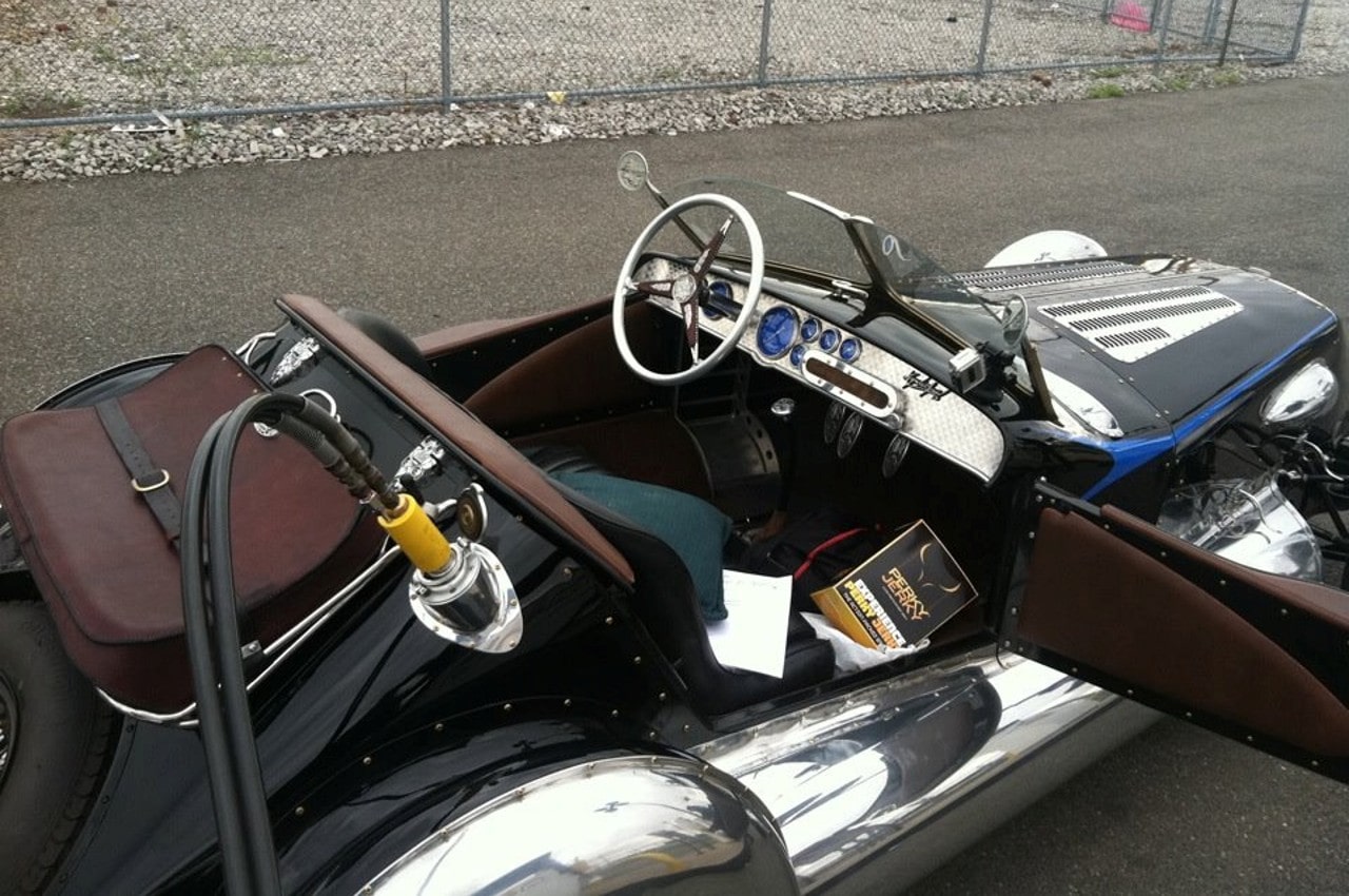 Vous avez peut-être remarqué les grands éléments chromés sur les deux côtés de la voiture… ils sont en fait les réservoirs de Gaz Naturel “GNC” et ils servent aussi en tant que raidisseurs du châssis (sic !) tout en offrant de quoi parcourir une portée totale de plus de 700 miles. La carrosserie a été entièrement fabriquée des nobles mains/paluches de JT Nesbitt à partir d’aluminium… et l’intérieur a été créé sur mesure. Malheureusement ou heureusement selon que vous aimez où détestez le résultat final, JT Nesbitt n’a pas l’intention de mettre son Roadster Magnolia Special en production, donc ce fut et c’est et sera définitivement le premier et le dernier exemplaire que vous verrez de votre vivant et même à l’infini !