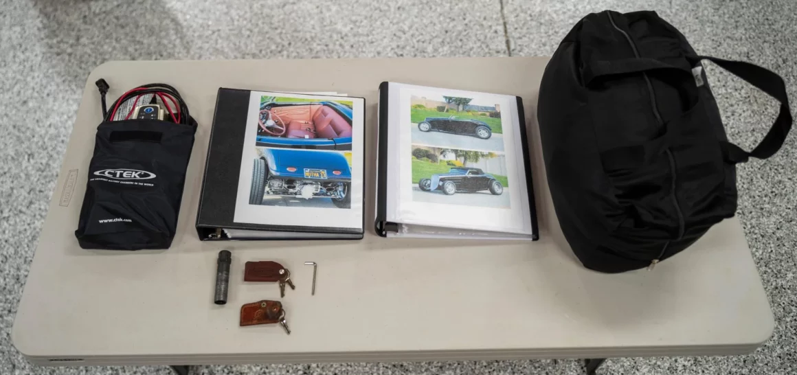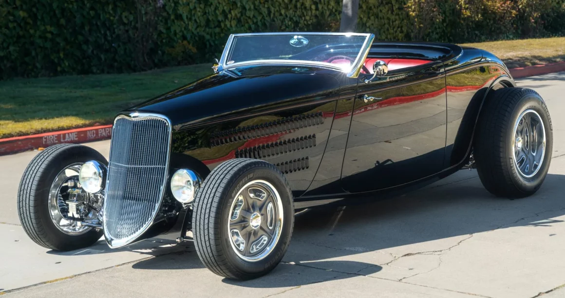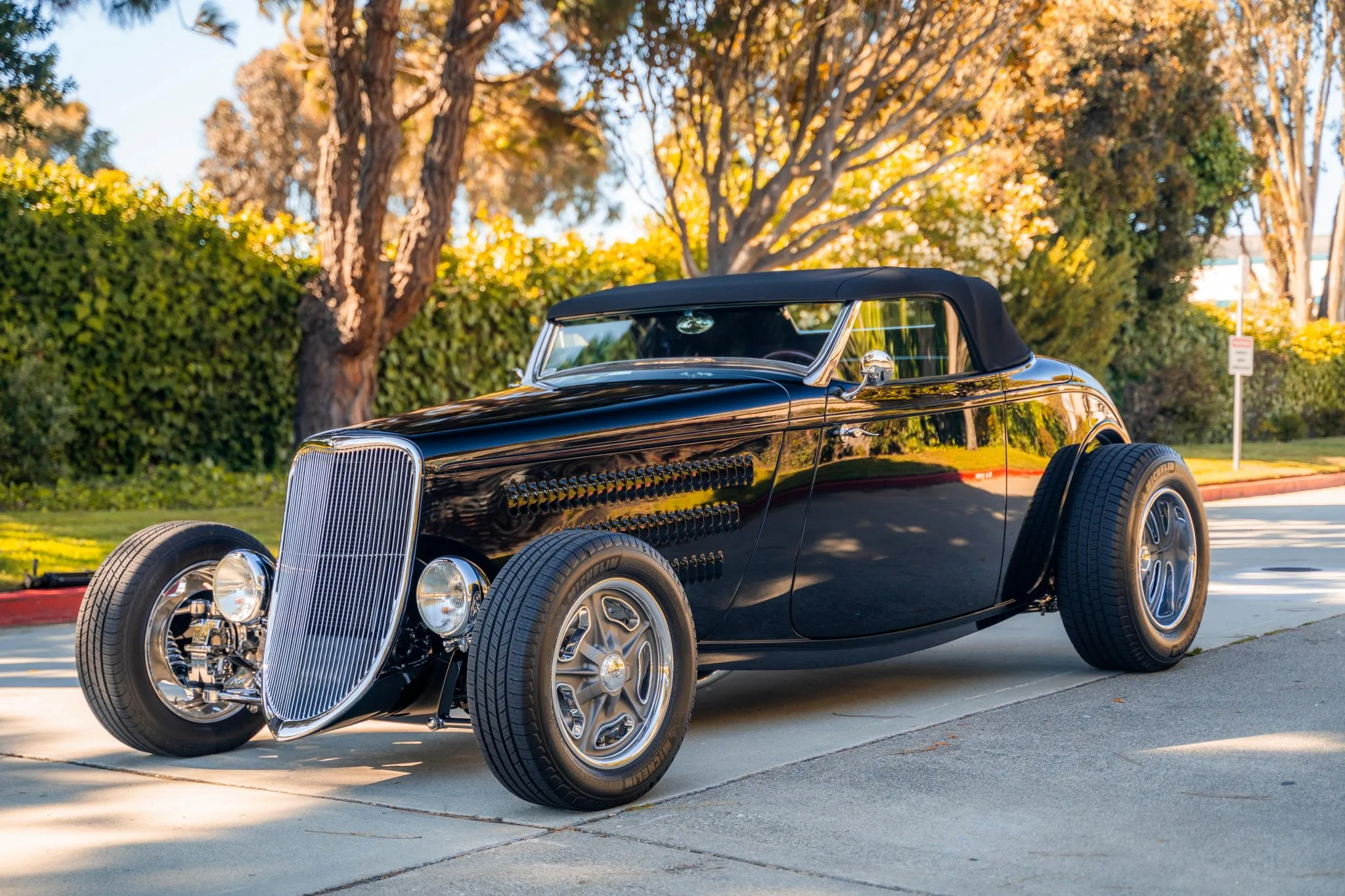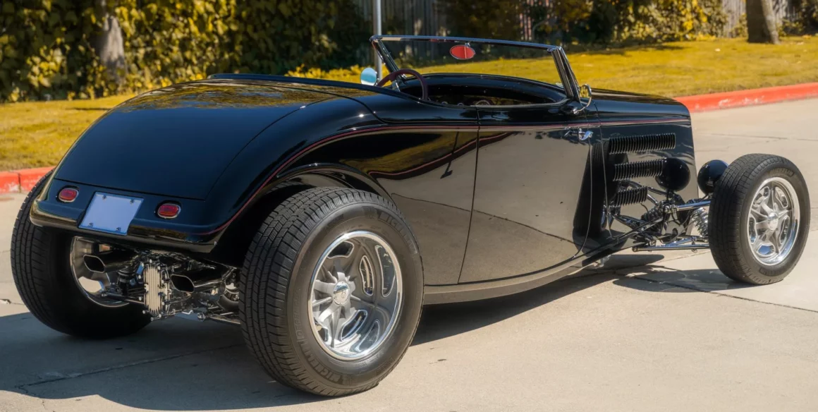Mais il y a aussi une direction assistée électrique, une climatisation Vintage Air, des vitres électriques et des compteurs Classic Instruments. Produite par l’American Speed Company de Détroit, dans le Michigan, la carrosserie de ce Hot Rod Speed’33 est fabriquée en acier de calibre 18 et dispose d’un cadre de pare-brise intégré en acier inoxydable ainsi que de portes qui pivotent sur des charnières dissimulées. Sid Chavers a fourni la capote de cet exemplaire.
