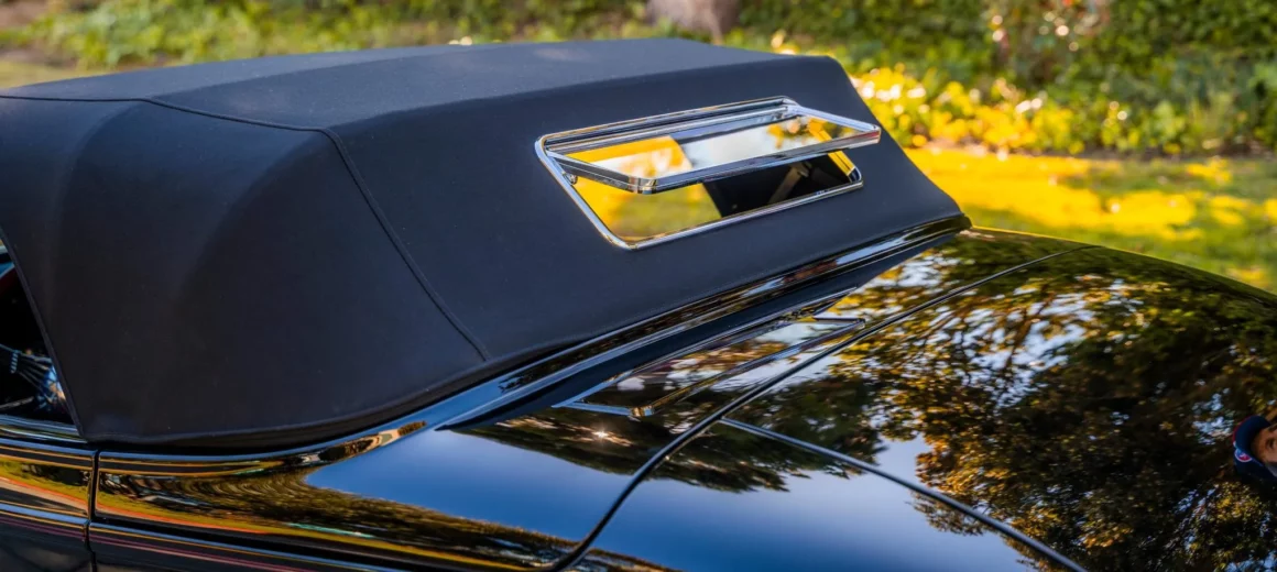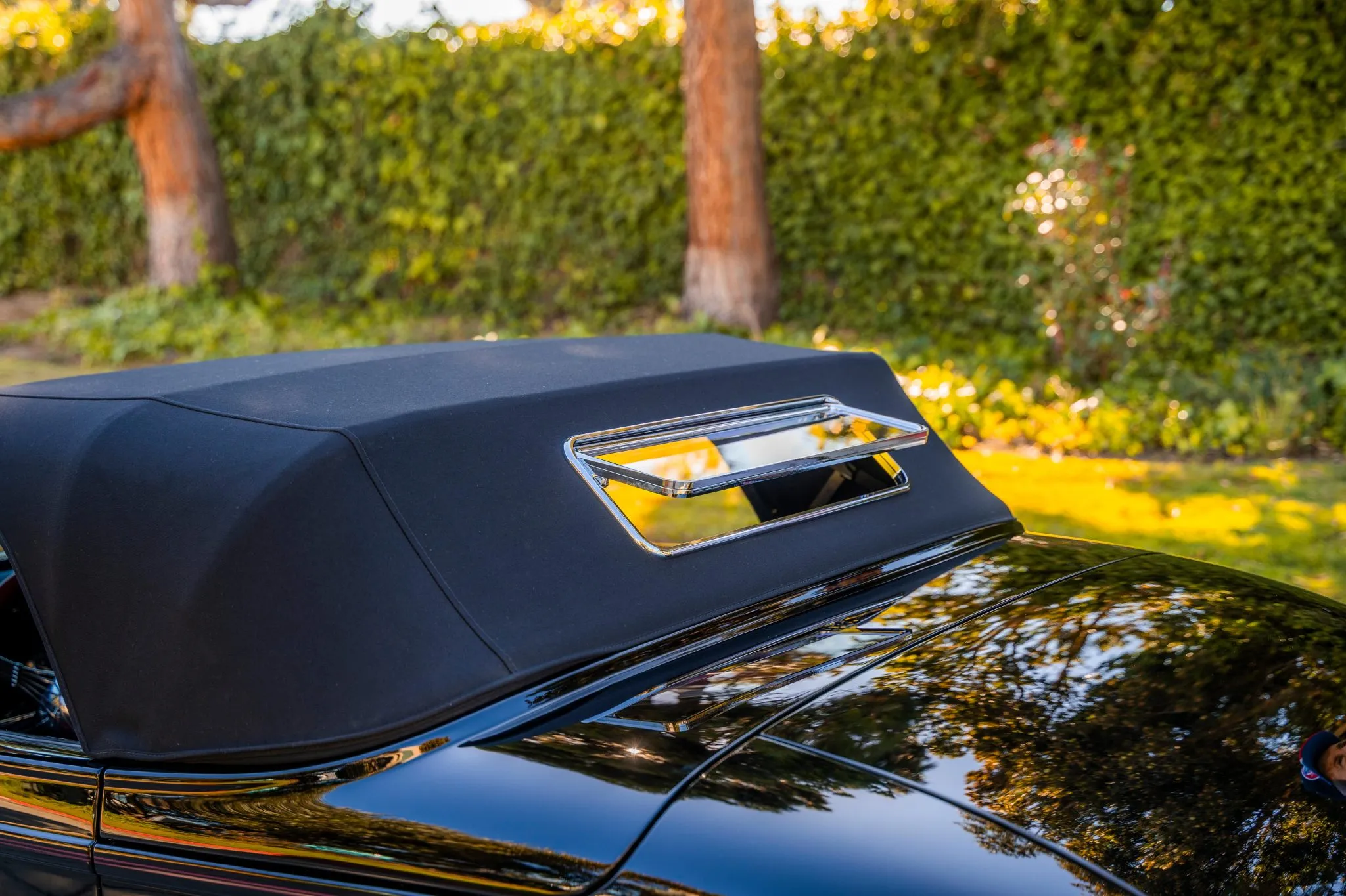 Elle intègre une lunette arrière CoolSlot et se range sous un panneau de tonneau à double charnière. Darryl Hollenbeck de Vintage Color Studio à Concord, en Californie, a appliqué la peinture noire, qui est accentuée par des touches marron le long de la ligne de caractère. Parmi les autres détails, les panneaux latéraux du capot à persiennes, les baquets de phares de la couleur de la carrosserie, les rétroviseurs latéraux doubles et un carter de sécurité arrière…