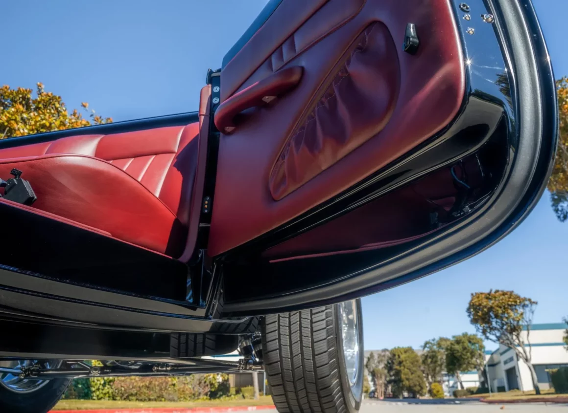 La puissance de freinage est fournie par des freins à disque aux quatre roues utilisant des rotors Wilwood de 12 pouces tout autour. Un système UniSteer-Electra-Steer assiste la direction à crémaillère. La sellerie en cuir marron a été cousue chez Sid Chavers Company et est complétée par des ceintures abdominales de couleur assortie et des tapis liés. Des porte-gobelets rétractables sont intégrés dans le coussin de siège inférieur, et ce n’est pas tout…