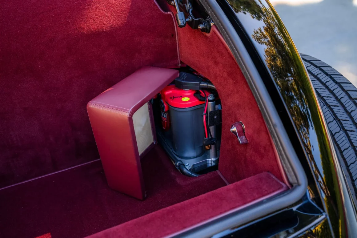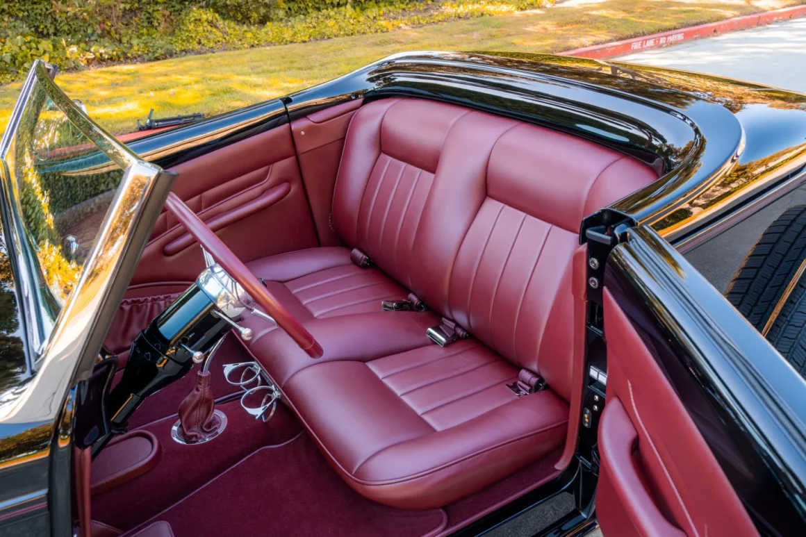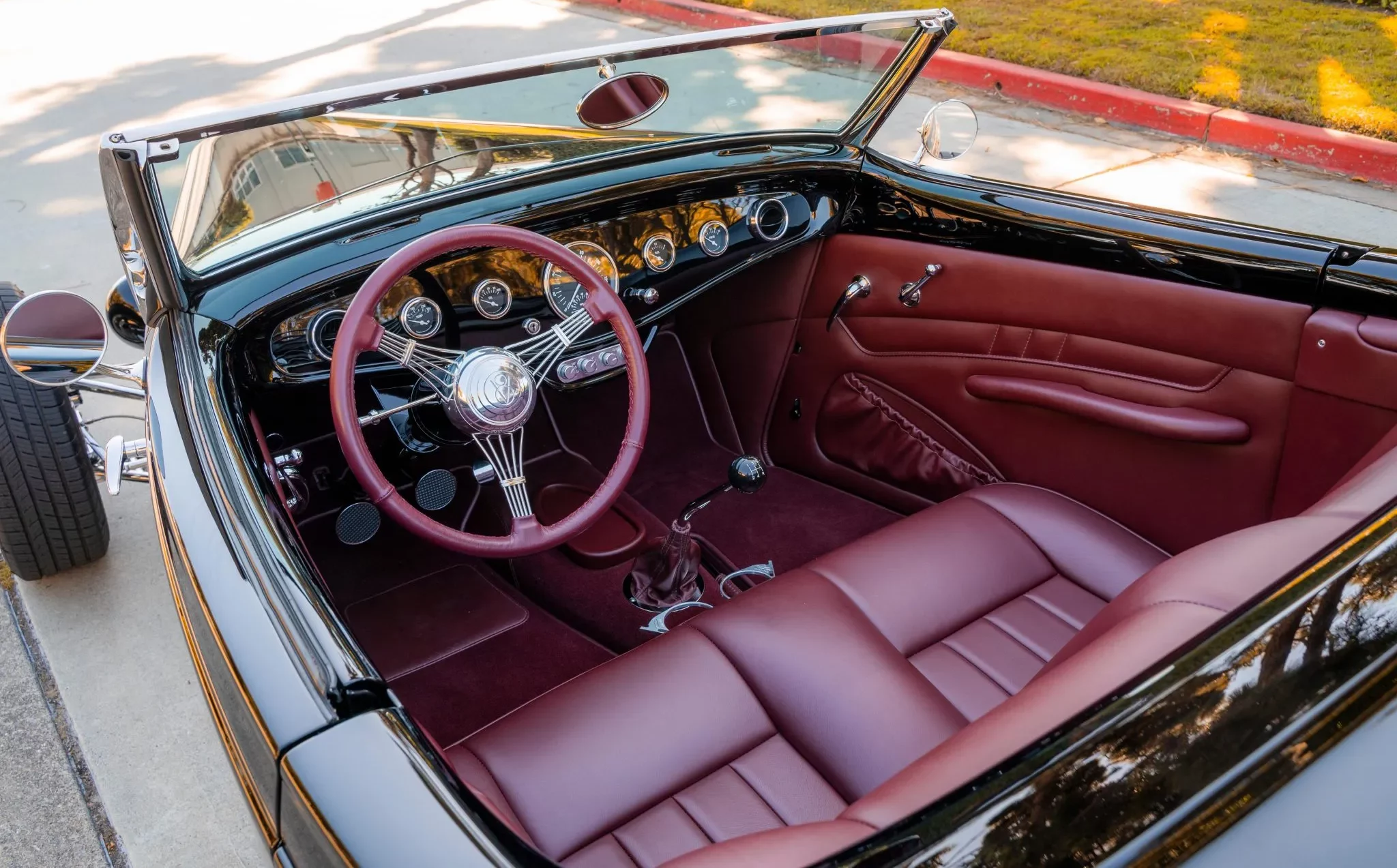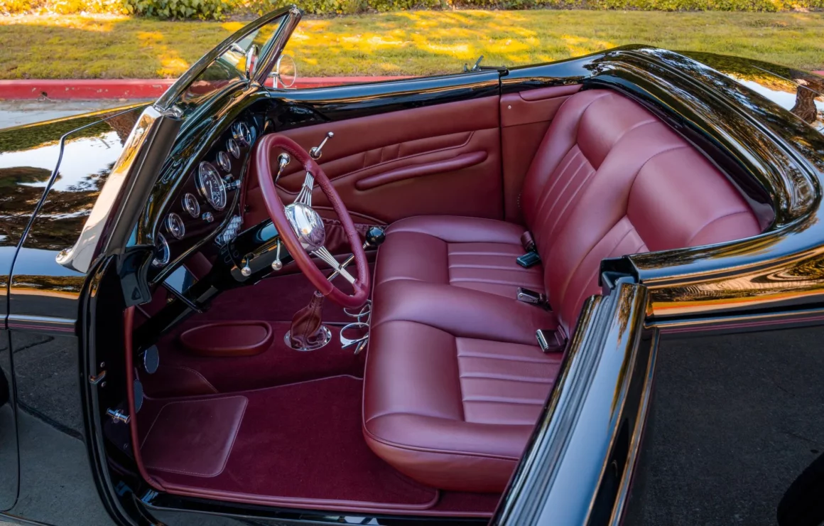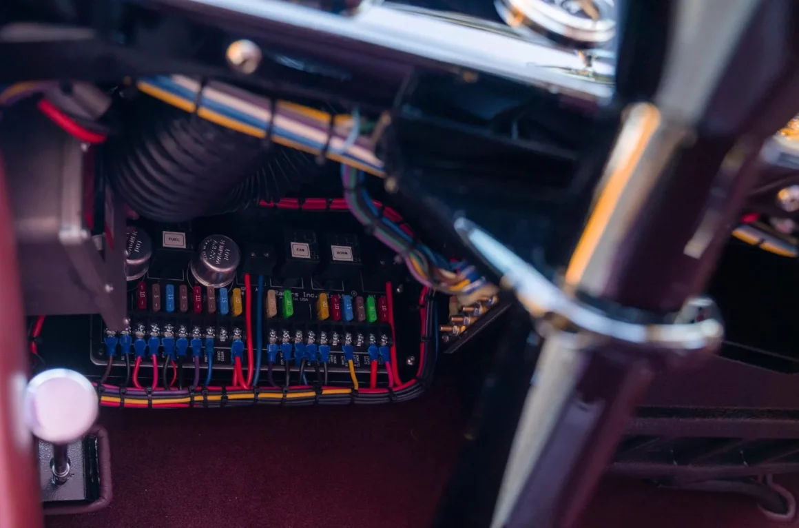 Le système de climatisation Vintage Air est doté d’un panneau poli à quatre boutons. La voiture est équipée de vitres électriques, et des leviers de déverrouillage pour le coffre et le couvre-tonneau sont intégrés dans le montant de la porte du conducteur. Un système audio compatible Bluetooth a été installé, et un panneau de câblage Racers Black-Box est monté sous le tableau de bord. Le volant de style banjo provient de chez Juliano’s… Waouww !