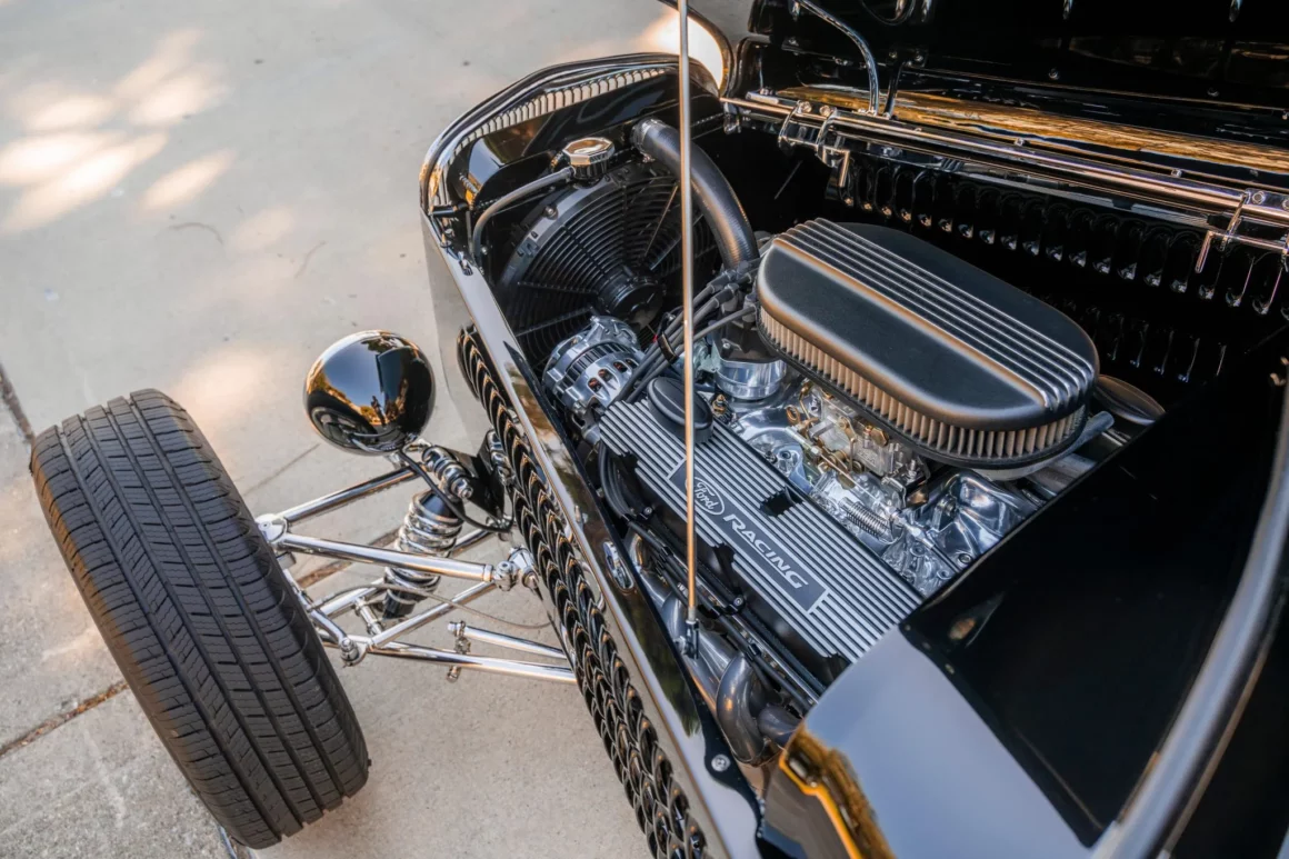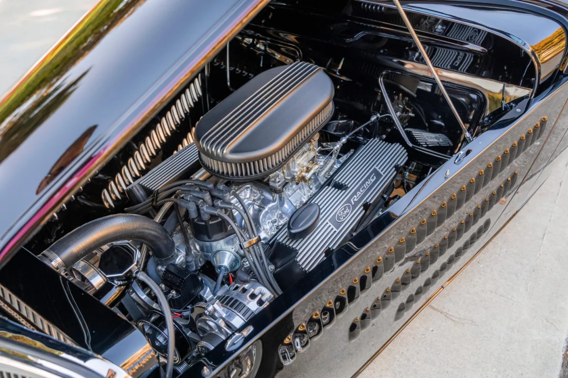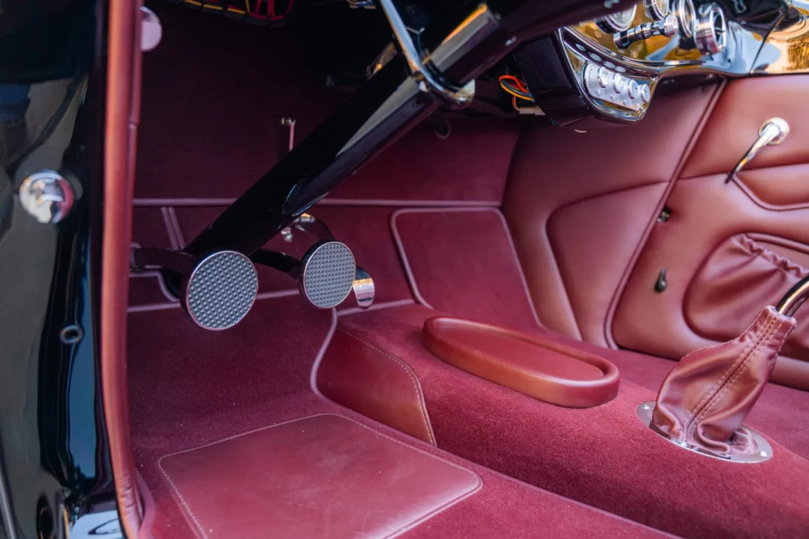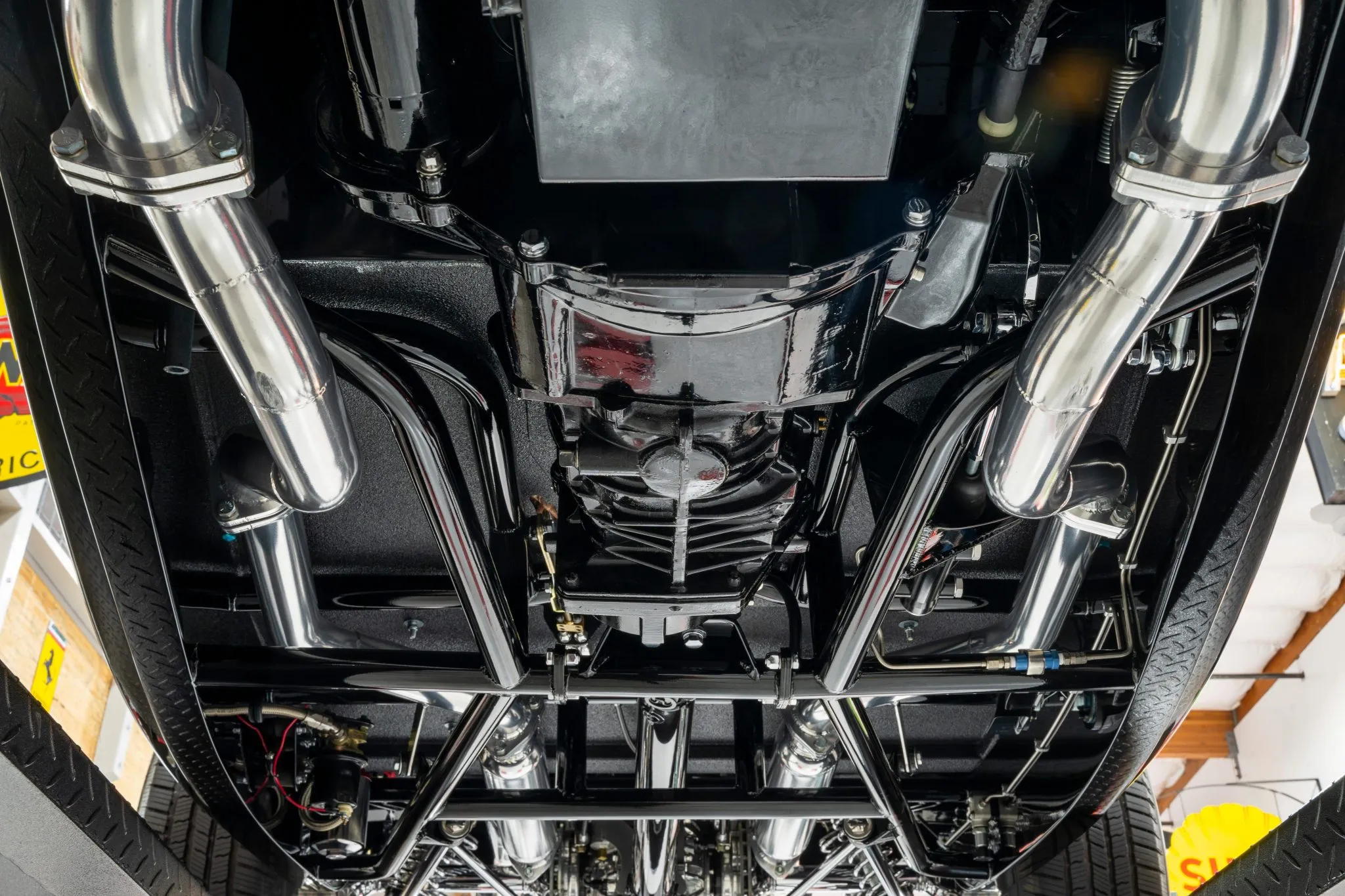 Elle provient de chez Kugel Komponents (ainsi que de freins à disques aux quatre roues)… La puissance provient d’un V8 Ford Racing 302ci associé à une transmission manuelle à cinq vitesses Tremec et à une partie arrière à changement rapide Winters. La voiture a été peinte en noir par Darryl Hollenbeck, et l’intérieur a été garni de cuir marron par Sid Chavers. Parmi les autres points forts de la construction, des jantes Budnik de diamètre décalé…