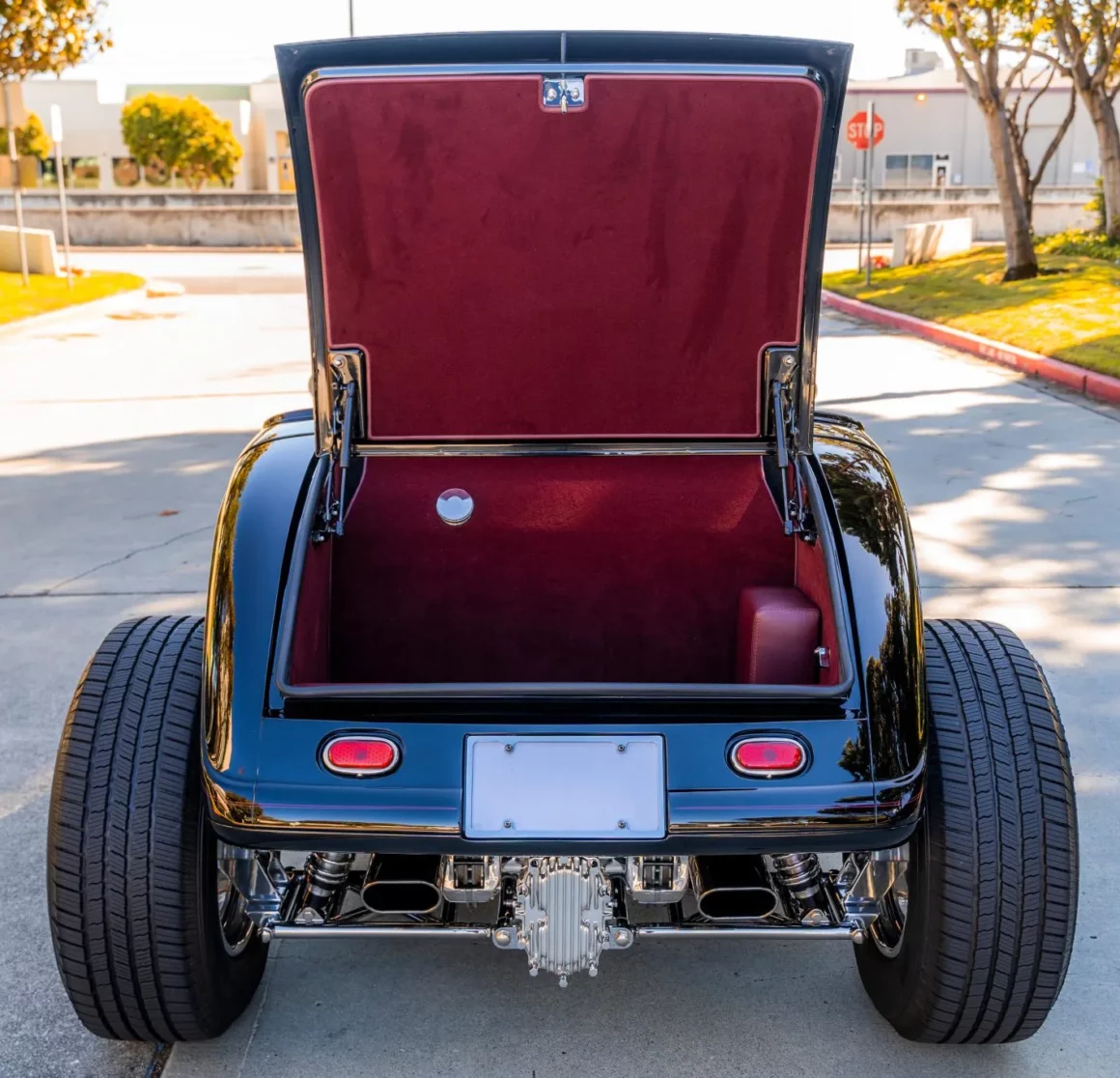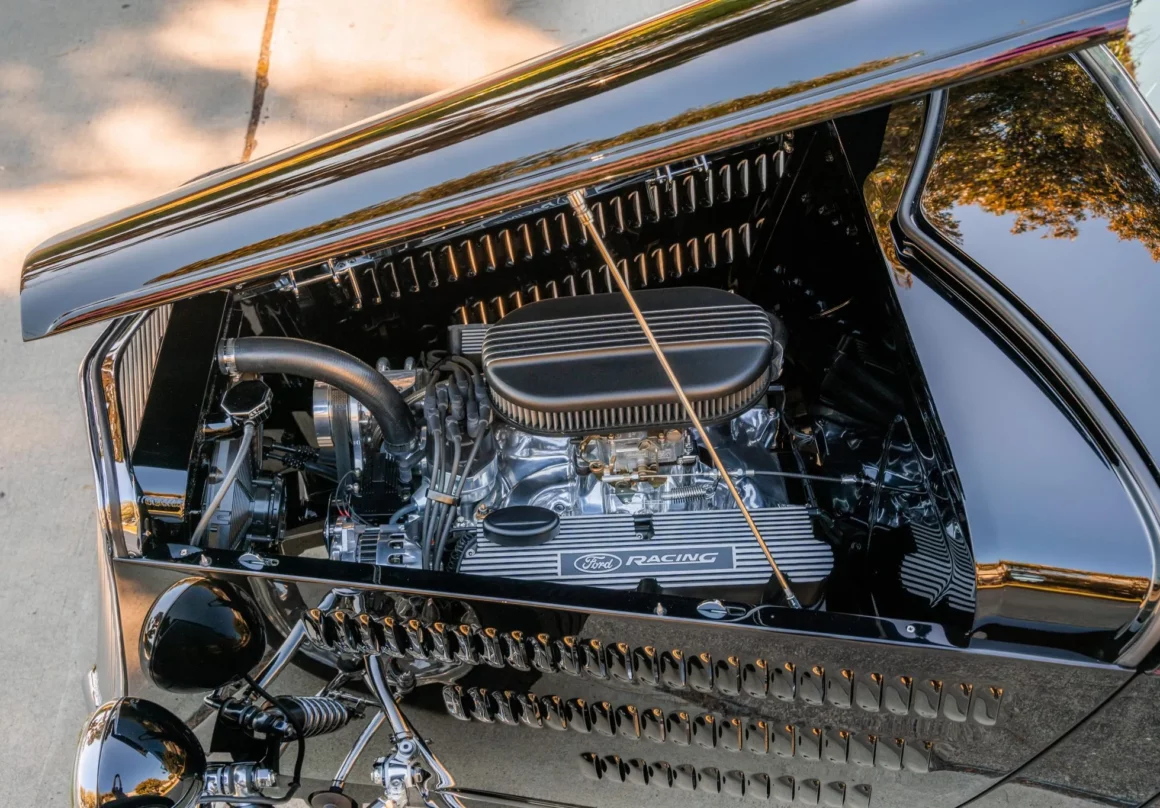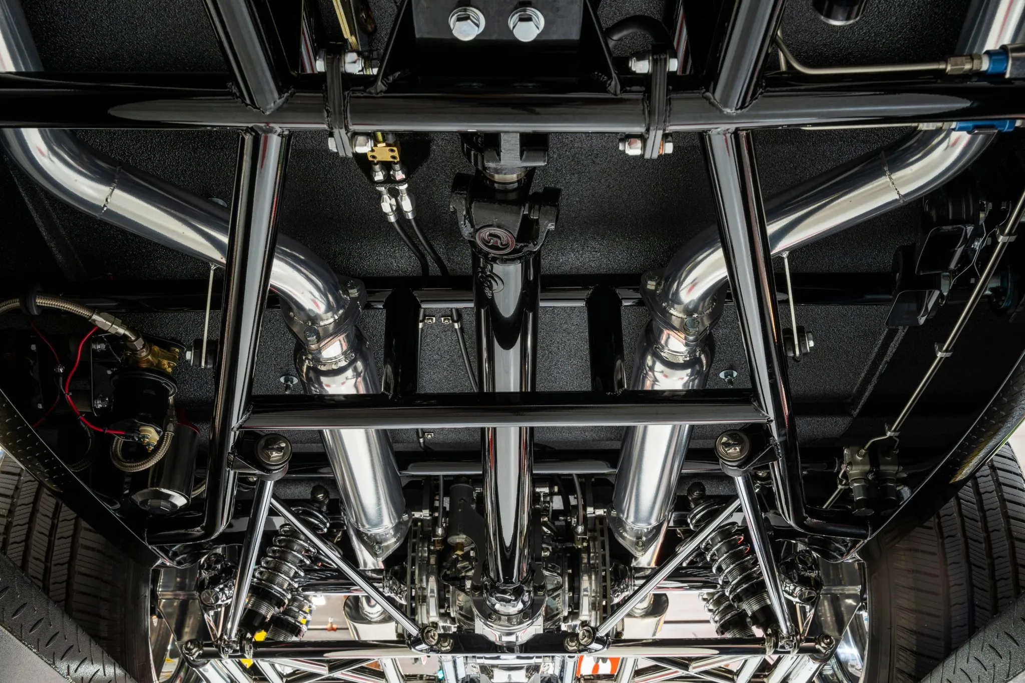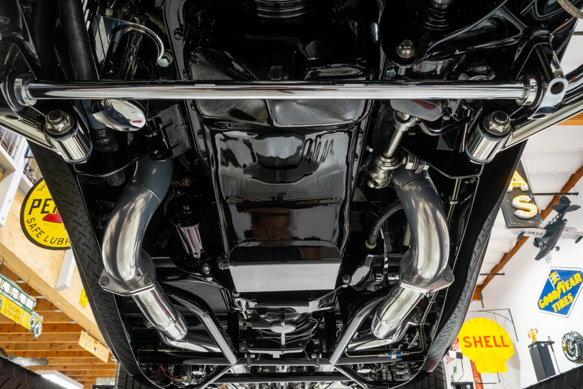 Elle provient de chez Kugel Komponents (ainsi que de freins à disques aux quatre roues)… La puissance provient d’un V8 Ford Racing 302ci associé à une transmission manuelle à cinq vitesses Tremec et à une partie arrière à changement rapide Winters. La voiture a été peinte en noir par Darryl Hollenbeck, et l’intérieur a été garni de cuir marron par Sid Chavers. Parmi les autres points forts de la construction, des jantes Budnik de diamètre décalé…