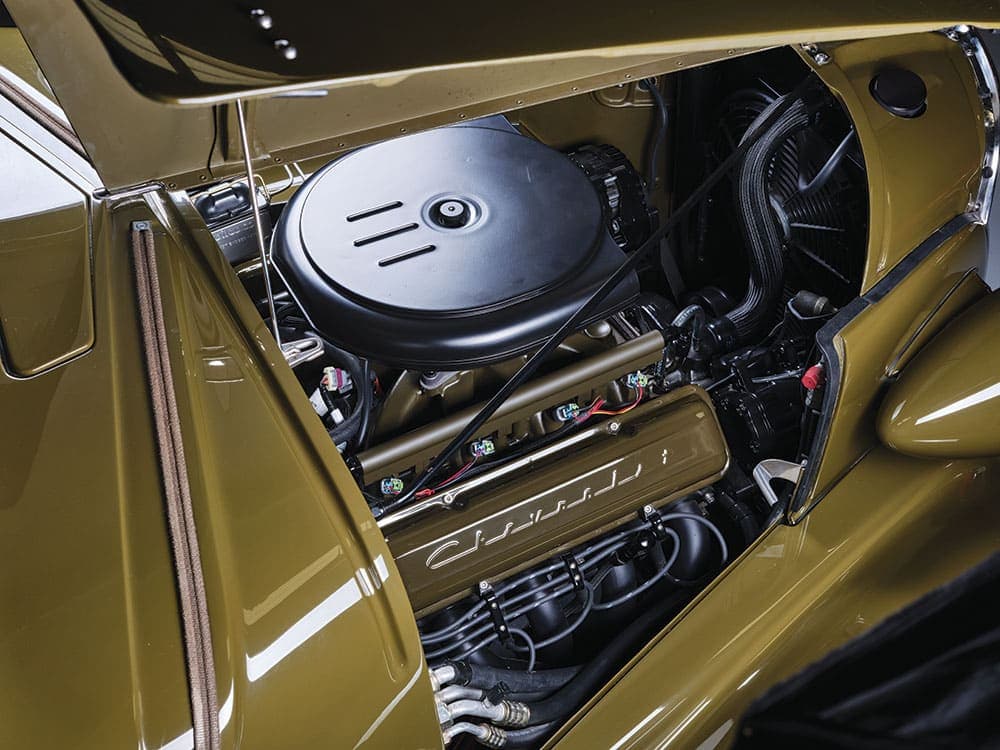 L’une des astuces a été d’utiliser des cache-soupapes Chevrolet vintage avec le populaire script Chevrolet peint pour correspondre à la carrosserie. Le filtre à air satiné est également d’apparence vintage et achemine l’air vers le corps de papillon Holley Terminator qui fait partie du système d’alimentation en carburant et de gestion du moteur. La connexion au reste du système électrique est réalisée grâce à l’utilisation de la batterie Optima RedTop dans le coffre.