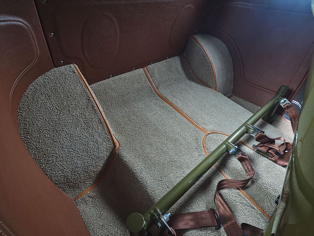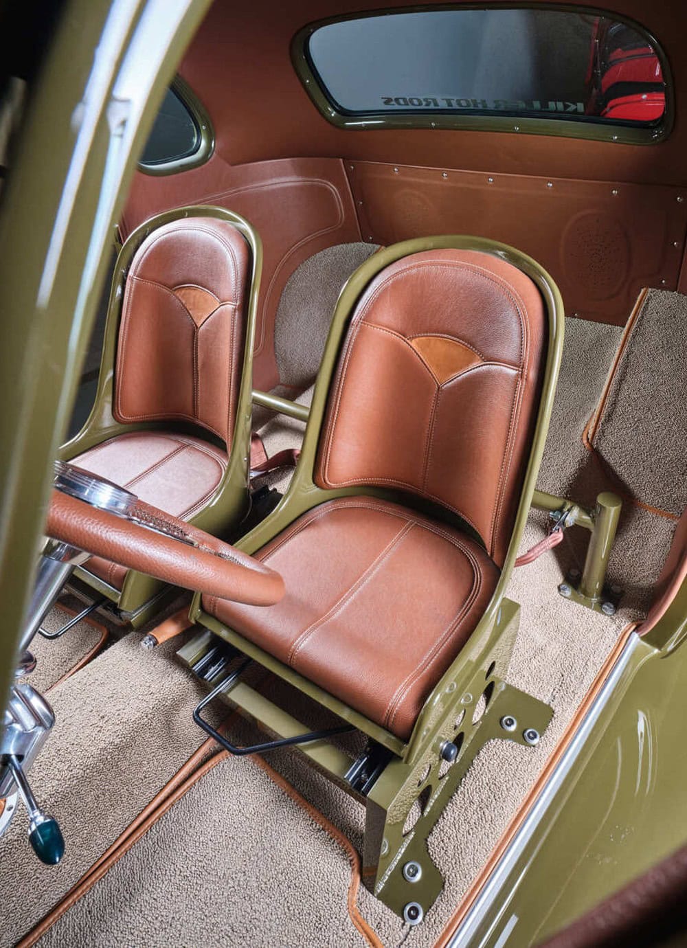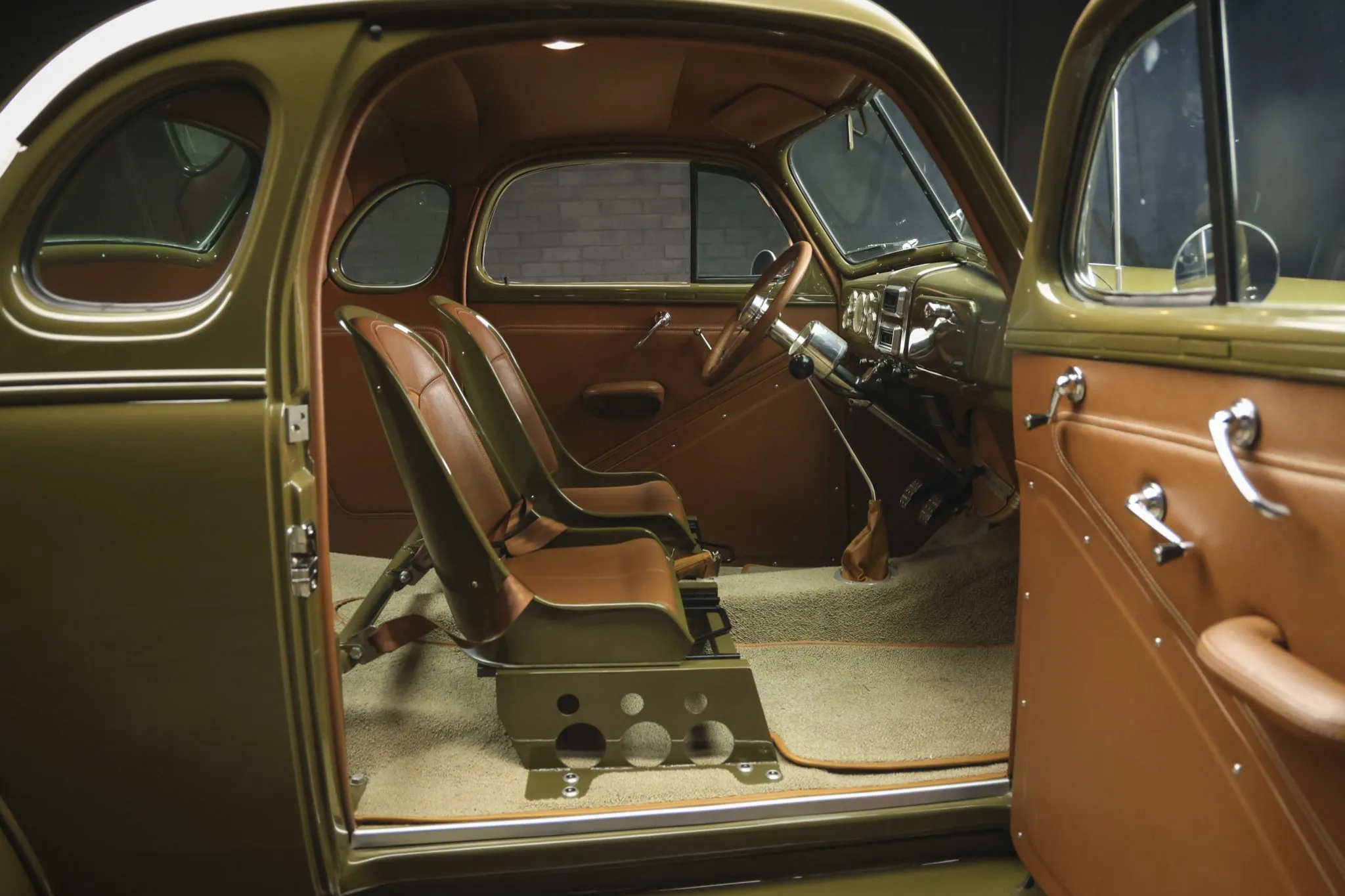 L’intérieur est entièrement personnalisé avec un moteur Speedway, une colonne de direction et des jauges d’instrument classiques. À l’intérieur, vous pouvez voir l’influence “large” du Hot Rod en comparaison du Coupé d’affaires de la fin des années’30. Le tableau de bord d’usine a été modifié par KHR&C et à partir de là, équipé de compteurs Classic Instruments, d’un système de climatisation Old Air Hurricane avec commandes cachées…