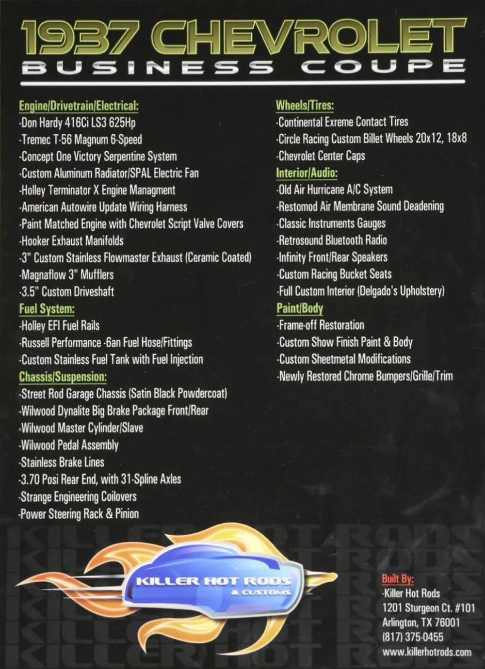 J’en reviens aux Hot Rod’s… Lorsque le nom de votre magasin est “Killer Hot Rods & Customs” (KHR&C), et que vous vivez à Arlington, au Texas, il ne fait aucun doute que vous allez construire des Hot Rods scandaleux et pas transformer une Aronde en Omlet Baveuzzz… Putain ! Une apparence distinctive, beaucoup d’expertise et une puissance abondante. C’est le cas du coupé d’affaires Chevrolet’37 que vous voyez en illustration de cet article.