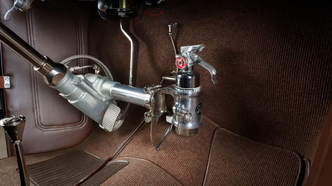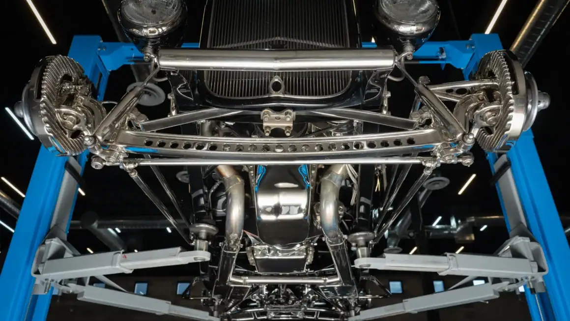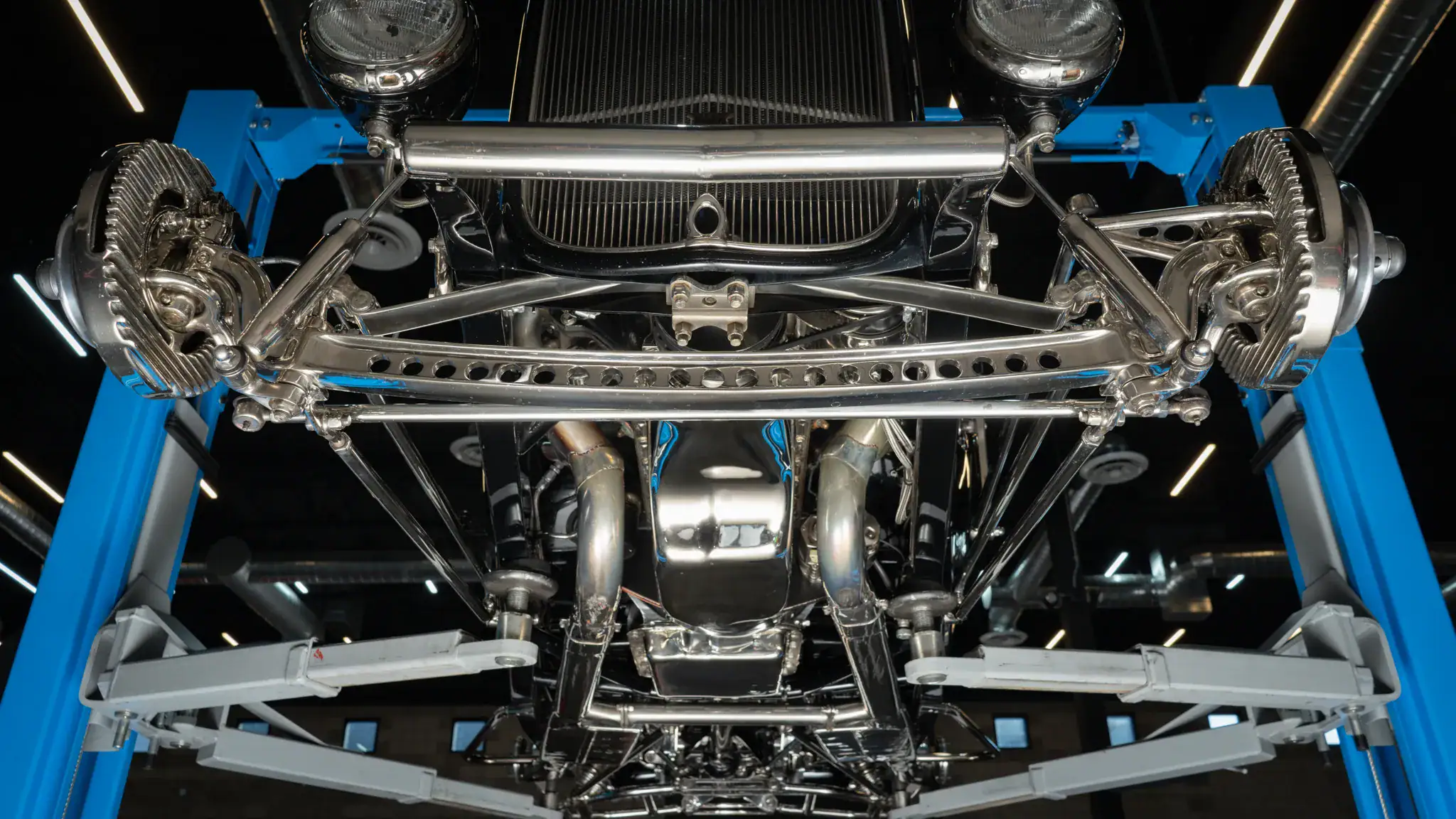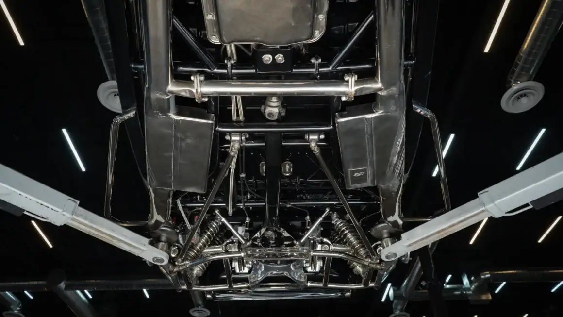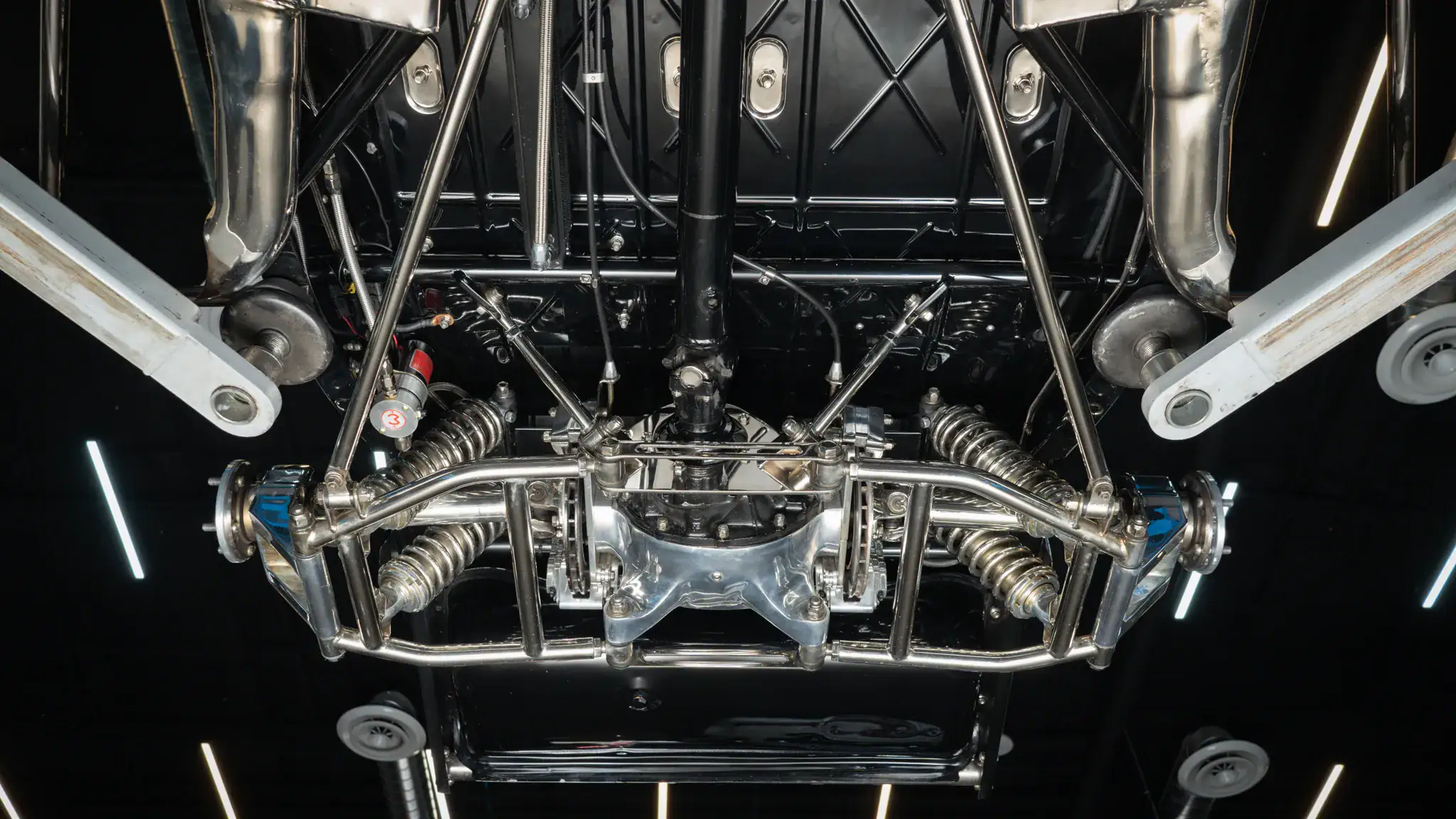 L’essieu avant est un Pete and Jake et l’arrière dispose d’un Quick-change Heidts. Un système de direction assistée basé sur une ex voiture de sprint, un boîtier de direction GM et des jantes de style artillerie ont été utilisés. Les collecteurs sont liés à un système d’échappement double avec des silencieux SpinTech. L’intérieur brun a été réalisé par AZ Street Rods, et la voiture dispose également d’un pare-brise SO-CAL Speed Shop Duvall, d’un toit Carson, d’un capot à persiennes et de phares de style guide.
