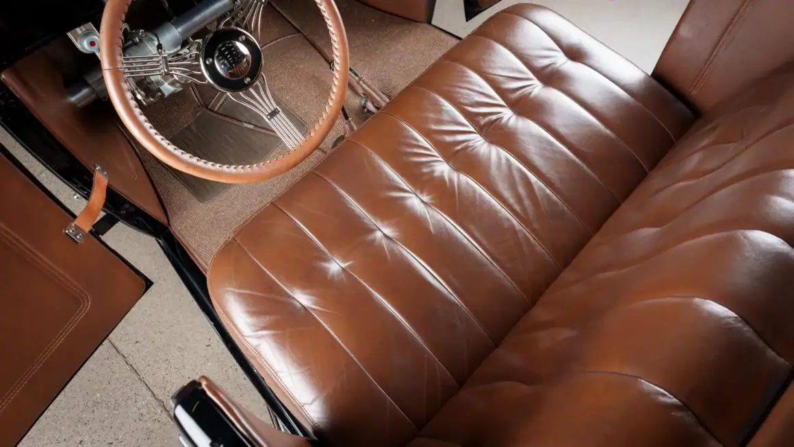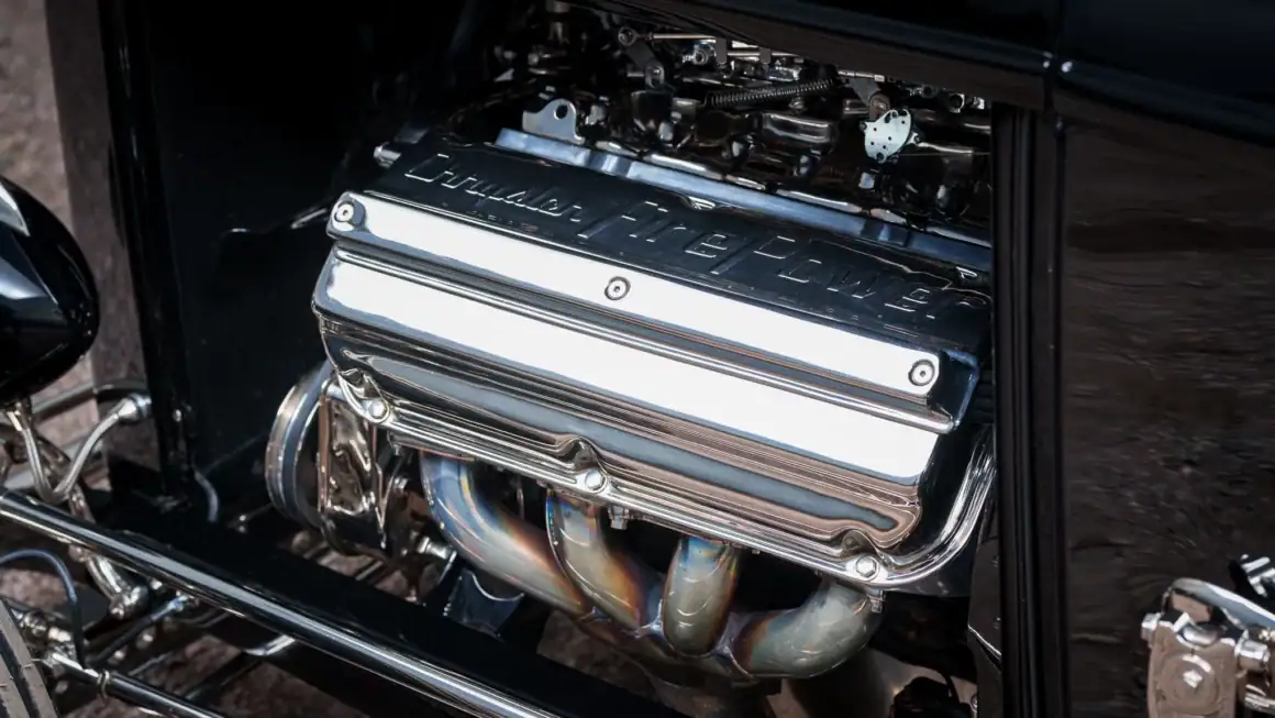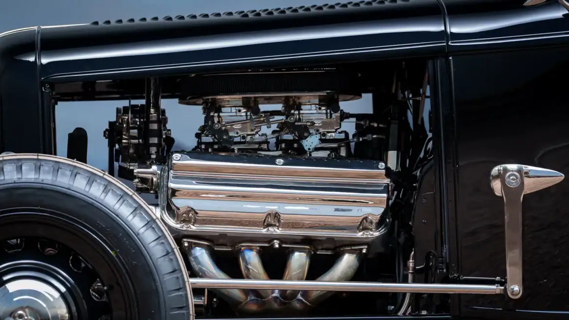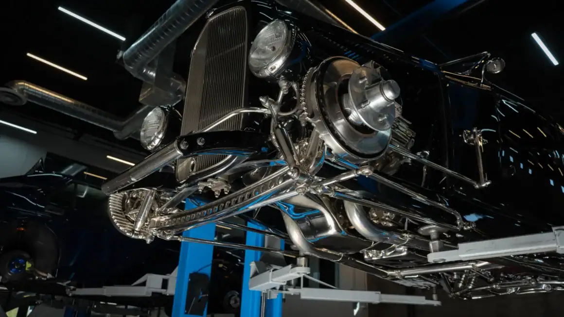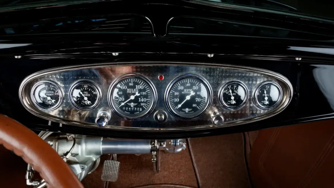 L’essieu avant est un Pete and Jake et l’arrière dispose d’un Quick-change Heidts. Un système de direction assistée basé sur une ex voiture de sprint, un boîtier de direction GM et des jantes de style artillerie ont été utilisés. Les collecteurs sont liés à un système d’échappement double avec des silencieux SpinTech. L’intérieur brun a été réalisé par AZ Street Rods, et la voiture dispose également d’un pare-brise SO-CAL Speed Shop Duvall, d’un toit Carson, d’un capot à persiennes et de phares de style guide.