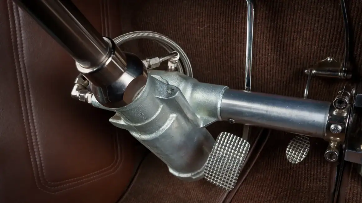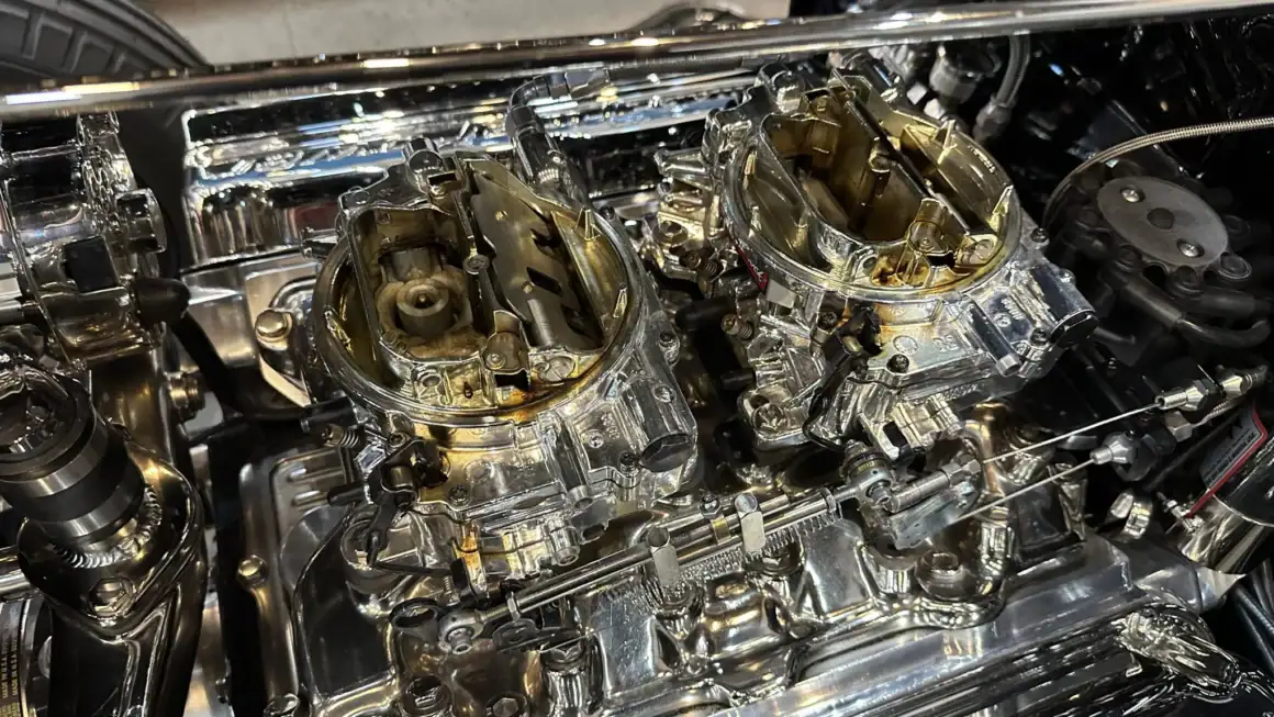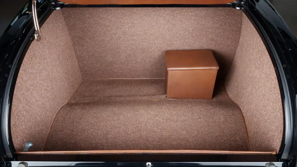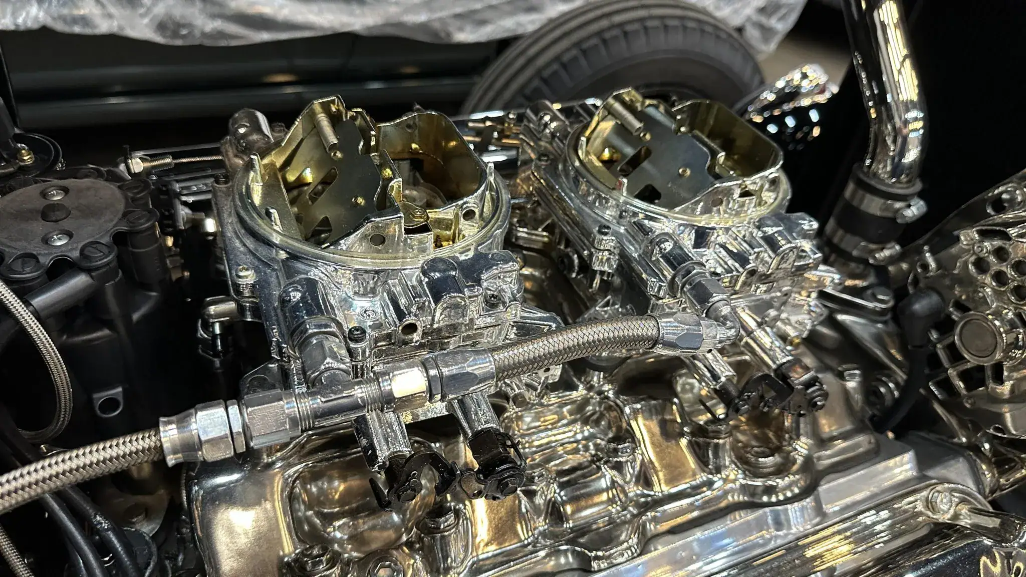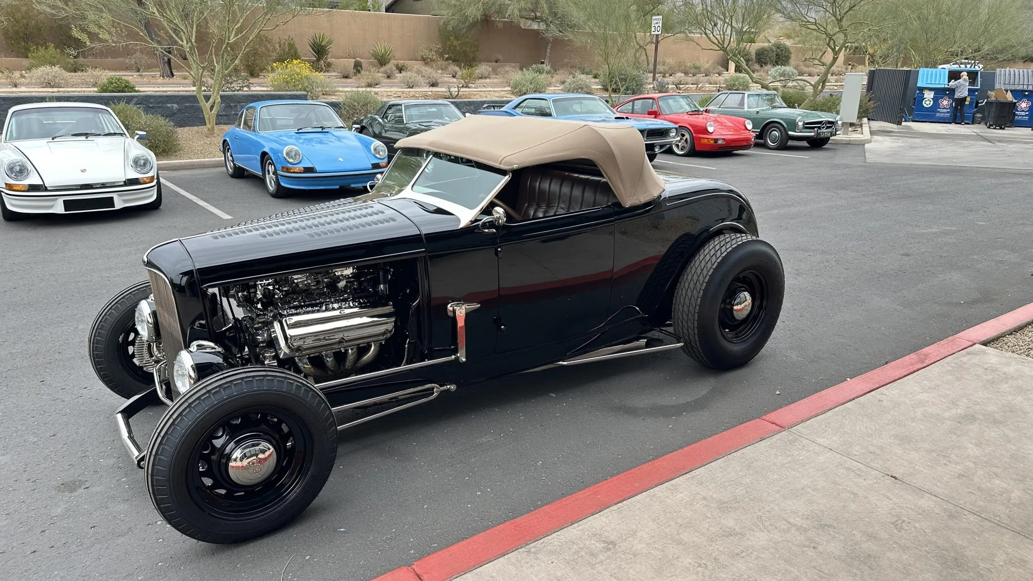 L’essieu avant est un Pete and Jake et l’arrière dispose d’un Quick-change Heidts. Un système de direction assistée basé sur une ex voiture de sprint, un boîtier de direction GM et des jantes de style artillerie ont été utilisés. Les collecteurs sont liés à un système d’échappement double avec des silencieux SpinTech. L’intérieur brun a été réalisé par AZ Street Rods, et la voiture dispose également d’un pare-brise SO-CAL Speed Shop Duvall, d’un toit Carson, d’un capot à persiennes et de phares de style guide.