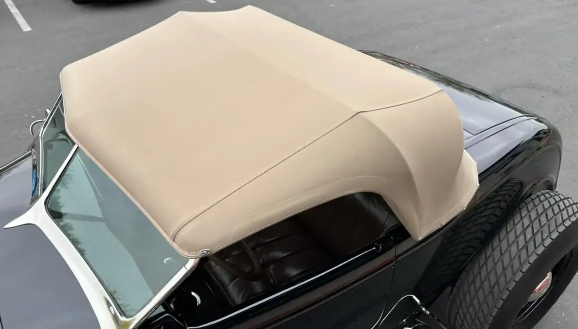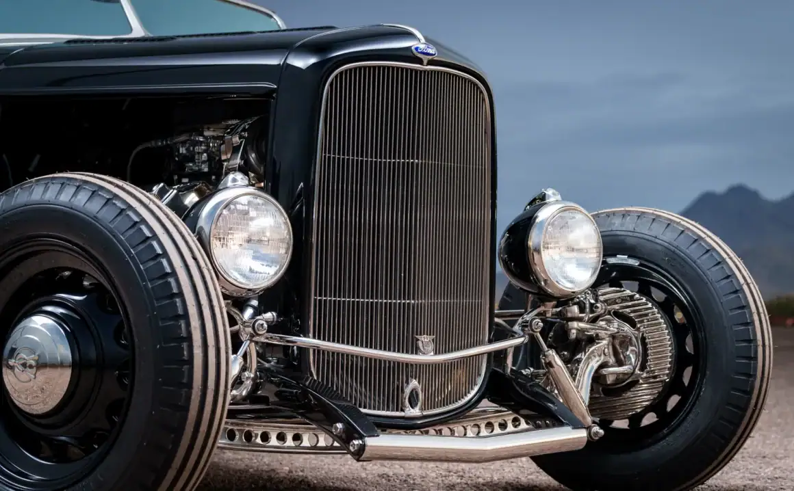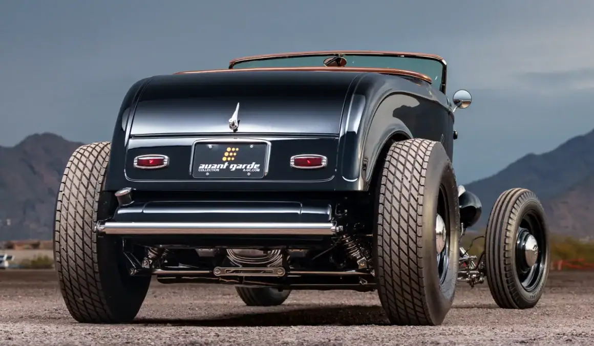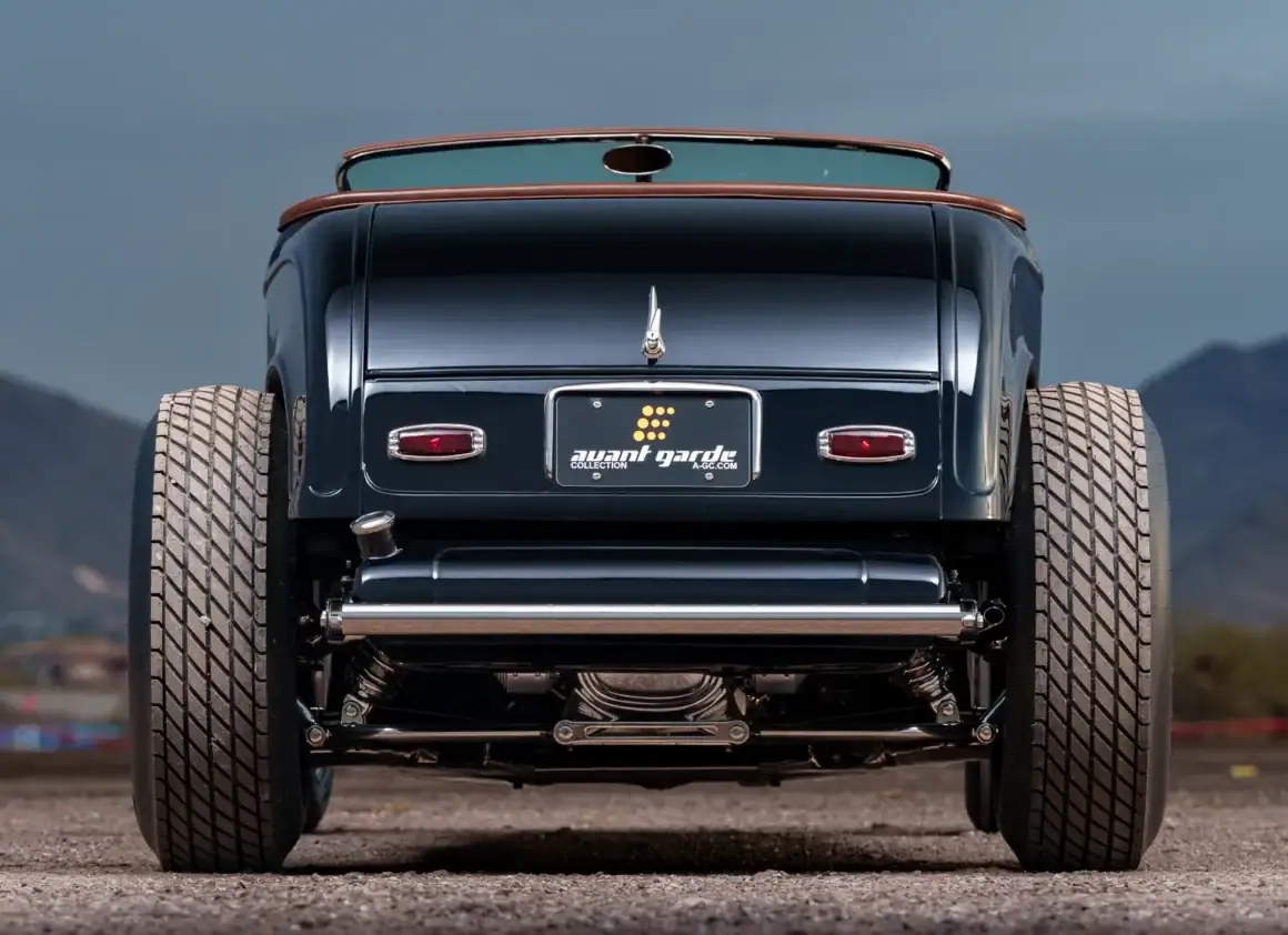 Ce Highboy ’32 est pourvu d’un Title de l’Arizona attestant “à l’américaine” que c’est un Ford’32 châssis VIN 18397721. La carrosserie Brookville a été peinte en noir, tout comme le châssis modifié façon ’32 est lui aussi un Pete and Jake. Le capot est à persiennes et un pare-brise Duvall de SO-CAL Speed Shop a été utilisé. Des feux de guidage, une barre d’écartement en V et une barre de badge sont installés à l’avant ainsi que des freins à disque aux 4 roues. Les Jantes de style artillerie de 16 pouces ont été montées avec des pneus Coker Firestone décalés (ce qui signifie plus larges à l’arrière qu’à l’avant).