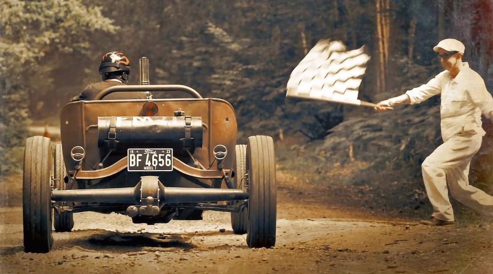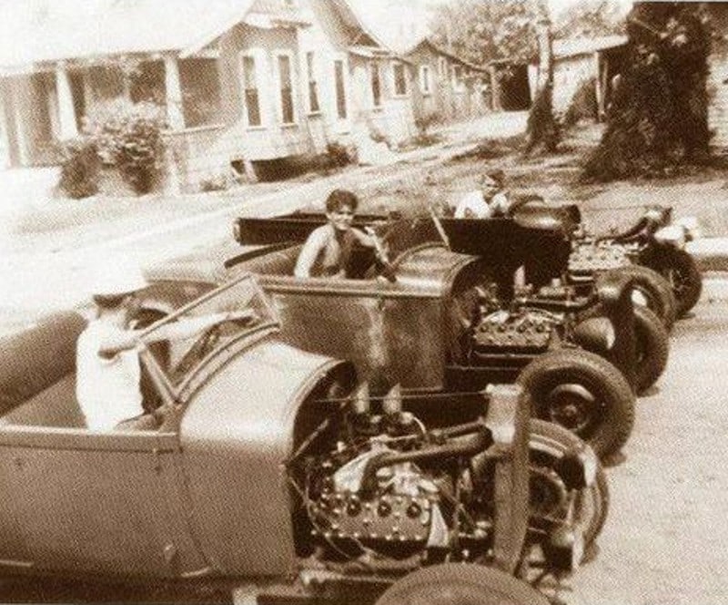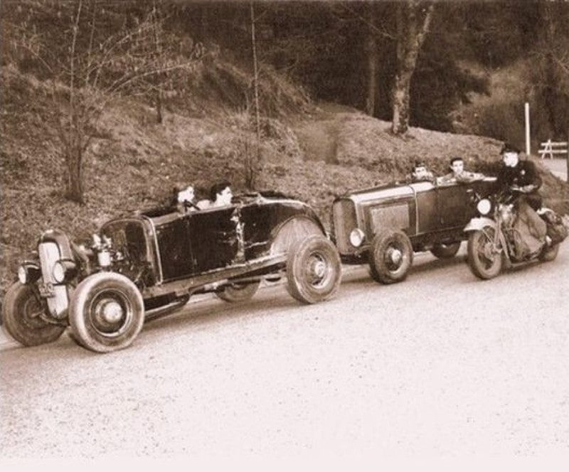 L’histoire des Hot-Rods commence à la jonction des années 1939/1940, un bref temps de la marche du monde où ils n’existaient pas encore ! Ah ! Ah ! Ah ! Vous ne comprenez toujours pas ? C’est pareillement pareil, à l’identique similaire que l’instant “X” où un des milliers de spermatozoïdes éjaculés dans l’extase d’une copulation, féconde l’ovule ! Donc je vous cause de la jonction entre les années trente et quarante, une époque où la Grande Dépression avait changé l’Amérique pour toujours et où une seconde guerre mondiale se profilait dans un avenir sombre. Quelques jeunes hommes du sud de la Californie développaient alors leur propre marque de la Kustom-Kulture automobile (qui va se nommer Hot-Rodding seulement en 1948, début d’après-guerre). Ils étaient généralement pauvres, chanceux s’ils avaient un emploi ou un travail à temps partiel. La plupart des gens vivaient avec leur famille élargie dans de petites maisons, l’argent était rare, leur budget serré ce qui encourageait la créativité et l’inventivité pour sortir des ornières de la vie. Ils parcouraient les décharges à la recherche de vieilles voitures et de pièces et construisaient leur propre version d’une voiture rapide. Ils s’amusaient entre-eux en courses brèves et rapides dans les rues, sur les lacs asséchés du désert de Mojave et partout où ils pouvaient trouver (acheter où voler) une occasion…