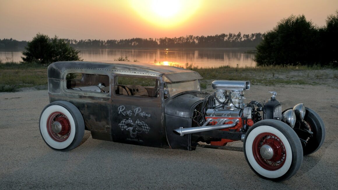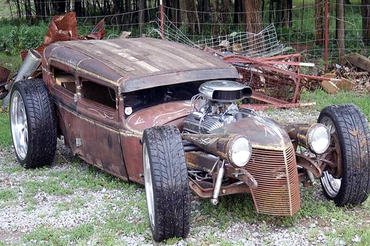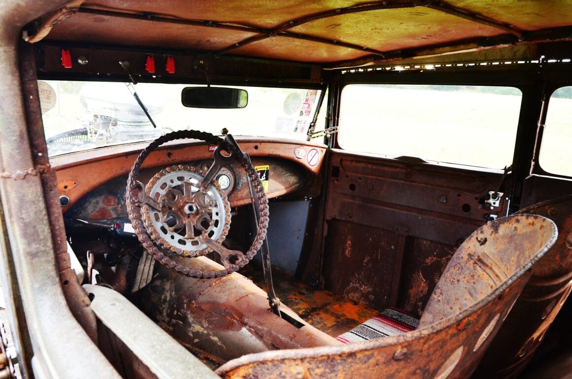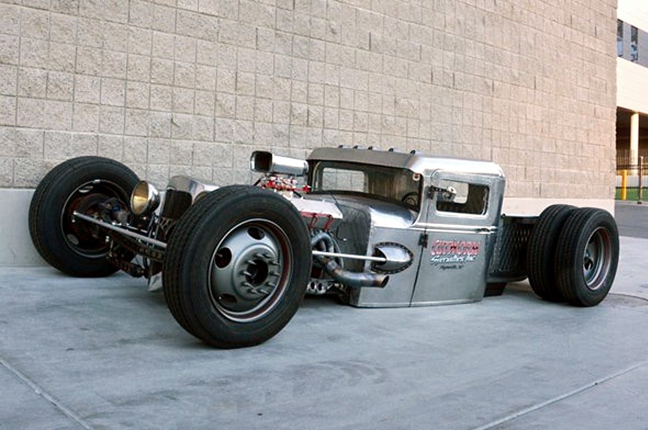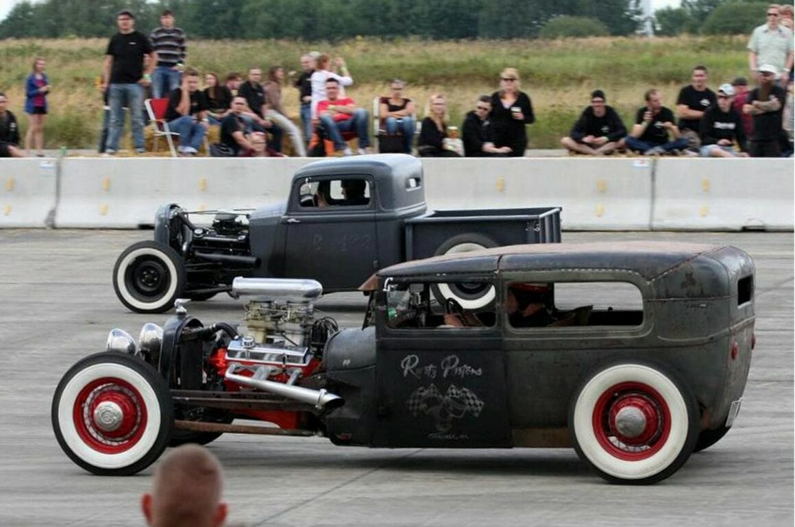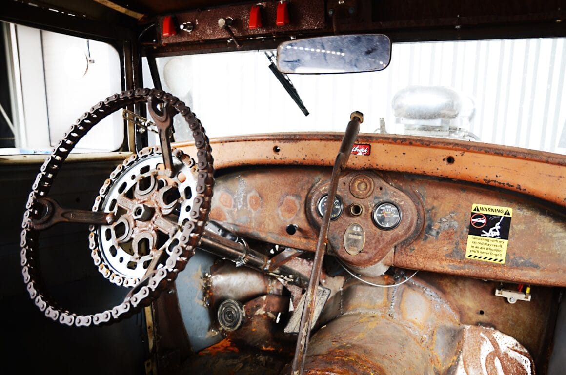 C’est ainsi que les Rat-Rod’s rouillés que vous voyez sur les photos de cet article ont vu le jour. Ce sont les cadavres de vieilles Ford, et le résultat est assez méchant et sacrément en colère. Une des bêtes m’a même mordu, quand j’ai grimpé à l’intérieur, la porte a essayé de me bouffer un doigt. Sale pute ! Et quand je l’ai réveillée de son sommeil cadavérique, elle est devenue encore pire dans l’occasion de la conduire ! Mais cela a suffit pour obtenir un énorme respect, peut-être était-ce même la peur de ce cadavre ? La direction avait en effet un bon quatre centimètres de jeu, ce qui était assez effrayant lorsque couplé avec plusieurs centaines de chevaux dans l’espace où une voiture normale aurait eu un capot. Et puis il y avait aussi les pneus. Vieux, étroits et immensément “coolesques”, mais diaboliques quand il s’agissait de détails tels que l’adhérence ou la traction…