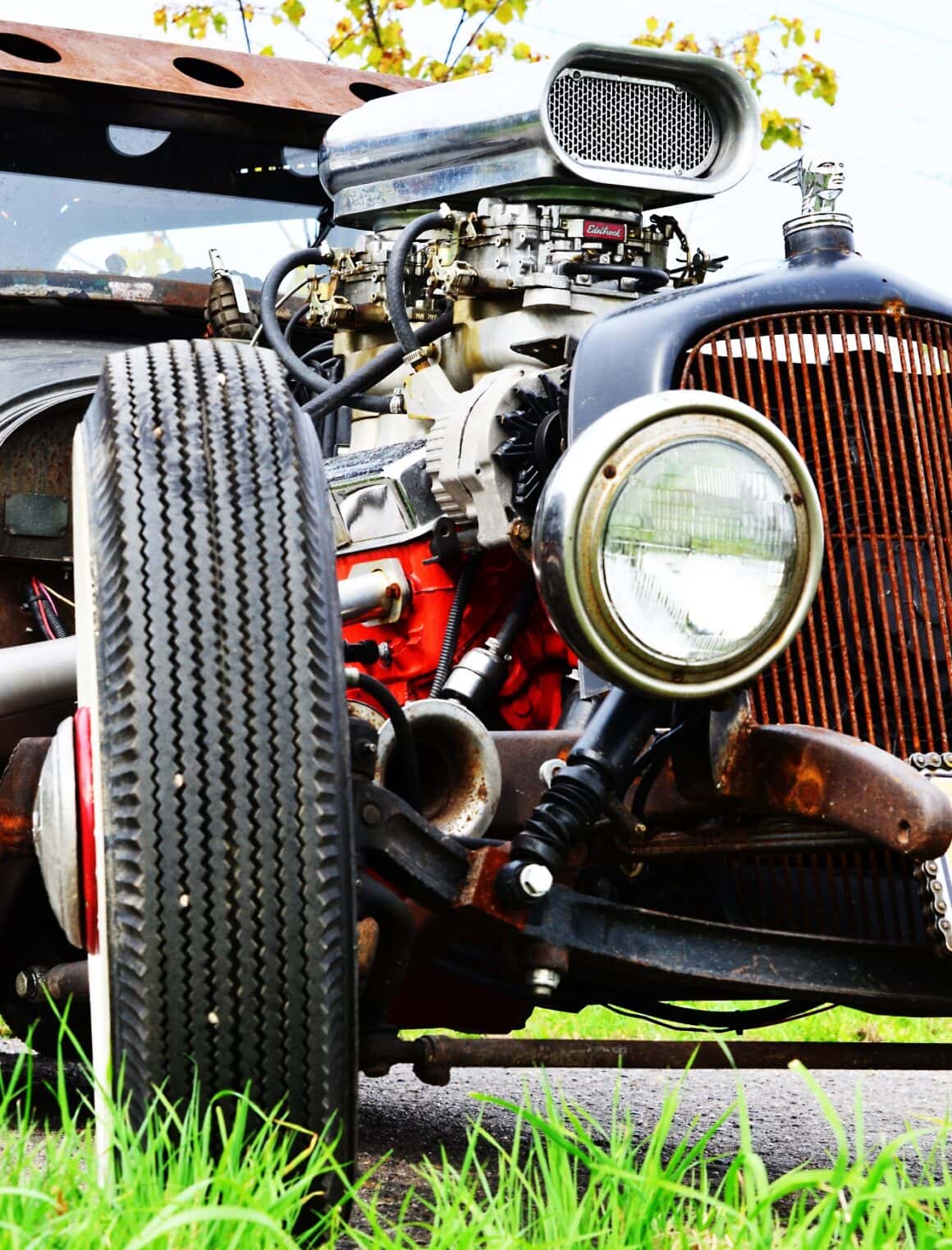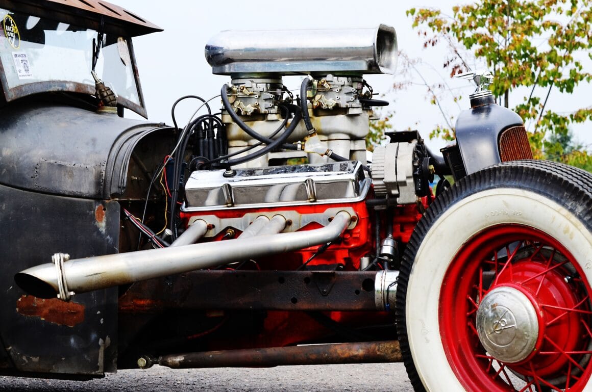 Donc, vous prenez le Sawzall et vous lui faites toutes les choses désagréables qu’un Rat-Rodder ferait. Vous le hachez-fin et le canalisez, le coupez et le sectionnez. Vous jetez toutes les choses inutiles, comme les ailes ou le capot et transformez la bagnole en quelque chose qui vous oblige à placer votre cul essentiellement sur le plancher, juste avec un oreiller en dessous. Il suffit d’obtenir des dossiers façon avion et de les souder en place. Le genre de sièges qui coûtaient peut-être un dollar par pièce dans les casses des années 1950 ! Mais vous faites d’immenses efforts pour les trouver et finissez par payer une tonne d’argent pour eux. Ensuite, vous faites une transplantation cardiaque à votre nouveau-né Frankenstein. Pour en faire un Rat-Rod d’enfer ! Vous aimeriez bien sûr utiliser un Big-Bloc V8 Hemi ? Mais peut-être que vous n’avez pas pu en trouver un, et que vous devez vous contenter d’une petite souris d’un petit bloc Chevrolet à la place.