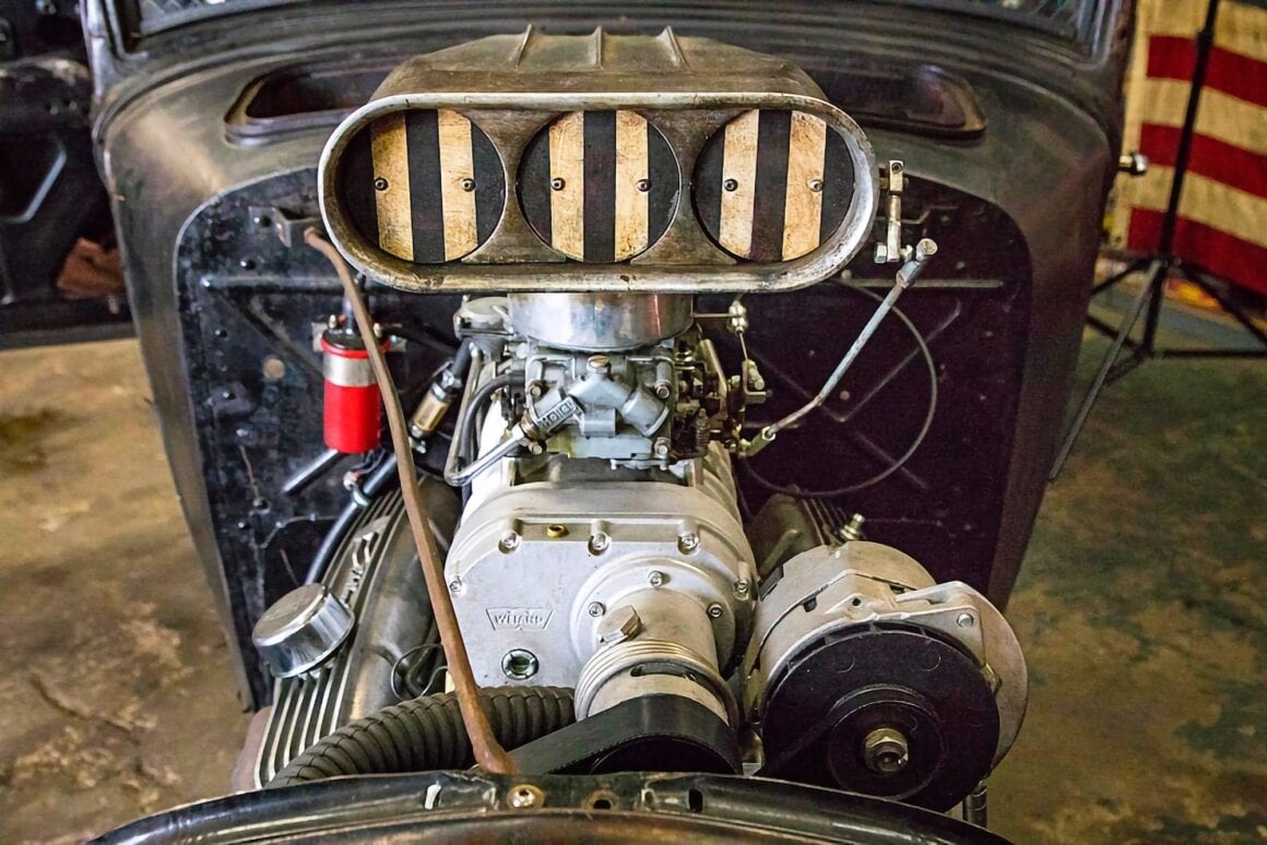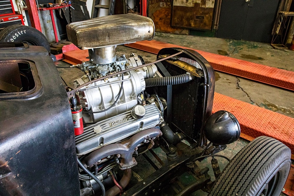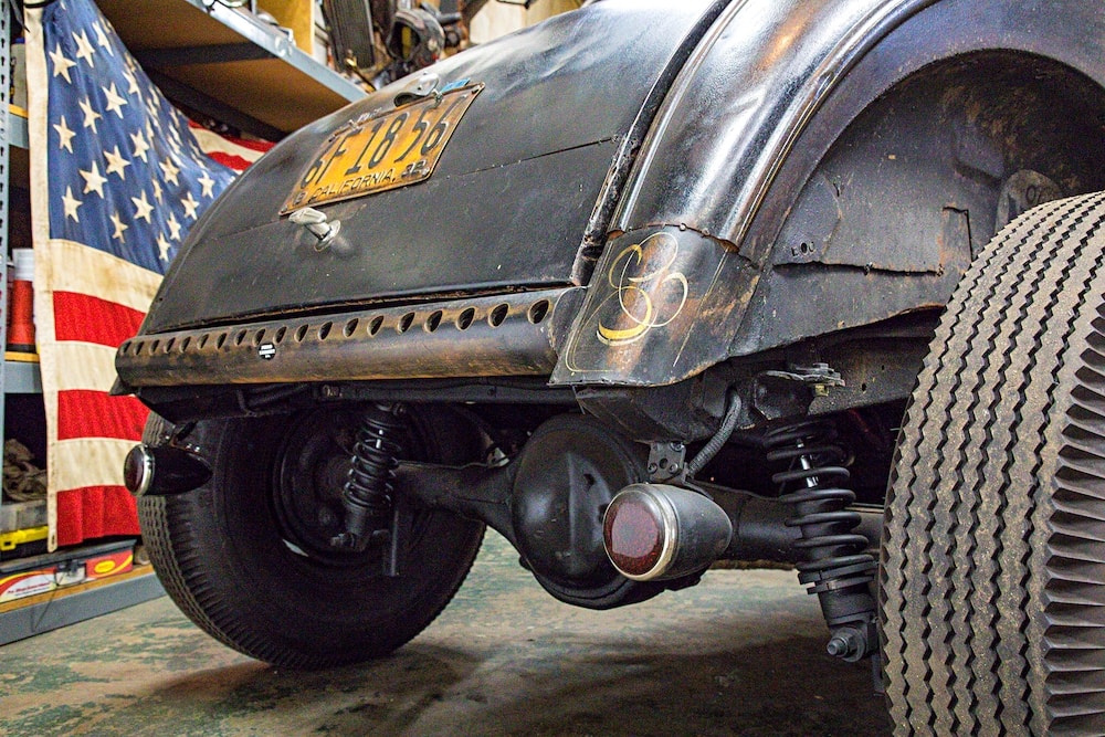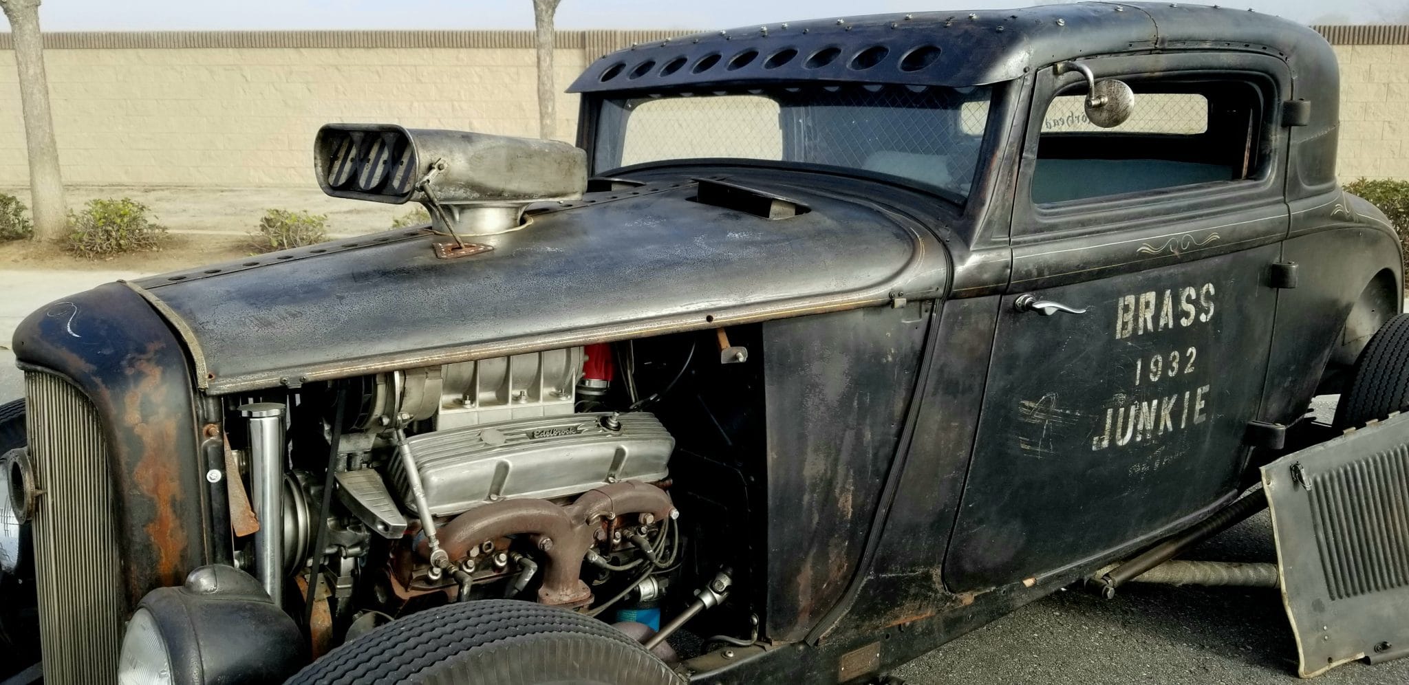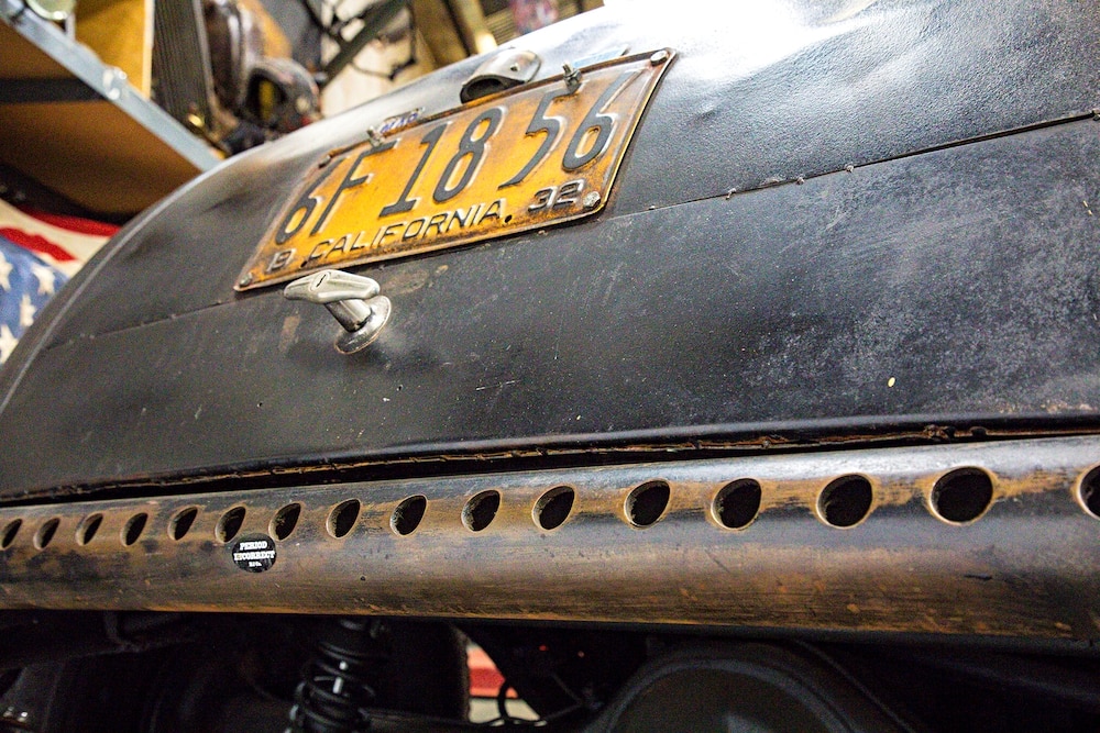 Un Chevy 355ci et un compresseur Weiand ont été négociés chez Matt Hunt en contrepartie d’un surplus de produits pharmaceutiques récréatifs et la boite TH400 était un coup de dés réussi sur Craigslist. Le Holley 750 provient d’un bac à pièces et le pont quick-change 9 pouces date d’un emprunt des années 1970. En trois mois, le ’32 est passé d’être un ensemble de pièces au statut de piège mortel pour jolies surfeuses Californiennes bronzées. Les Rat-Rods ont pourtant une mauvaise réputation, mais l’industrie cinématographique aime exploiter cette impression négative…