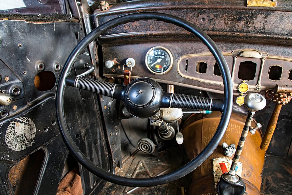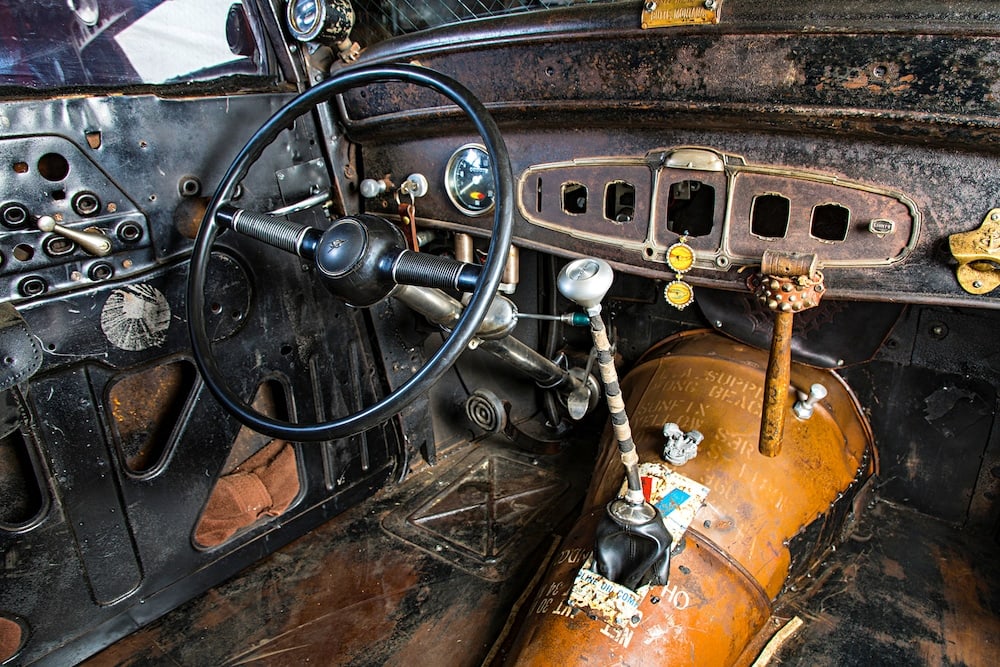 “Est-ce que votre tétanos et votre Covid sont à jour ? “ m’a demandé John Moss, en plaisantant à moitié alors que j’ouvrais la porte de son atelier. J’ai répondu “OUI” en regardant les nombreux bords tranchants rouillés de son Hot-Rat-Rod qui attendaient de m’accrocher la peau. Au volant, la ceinture sous-abdominale, qui est faite de sangles de parachute, était trop serrée et alors que je manipulais le réglage, John m’a dit : “Vous êtes probablement mieux sans la ceinture d’insécurité parce que l’appuie-tête est un réservoir d’essence “… Bon point. J’ai décidé qu’en cas d’accident, je préférerais être jeté à l’écart.
