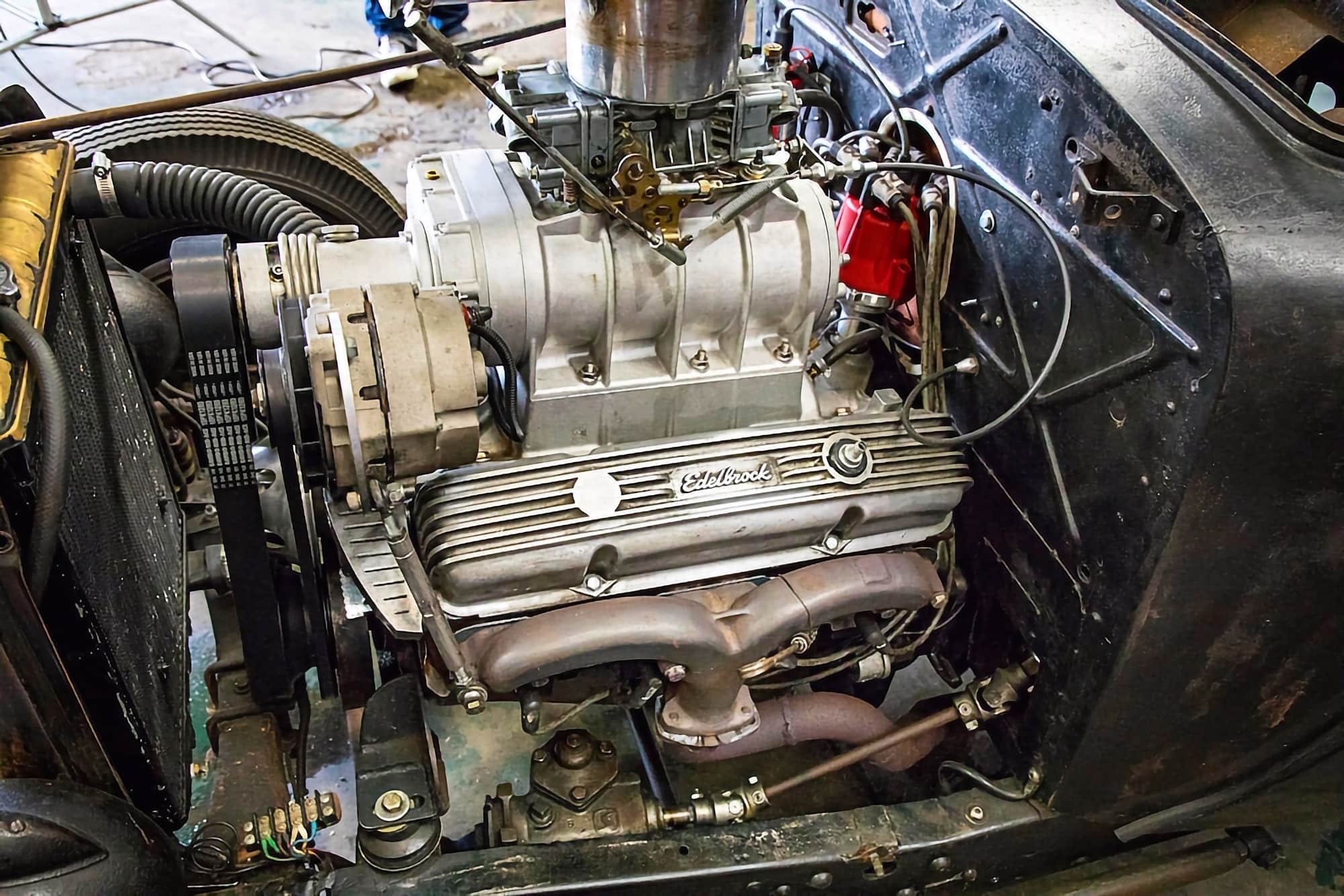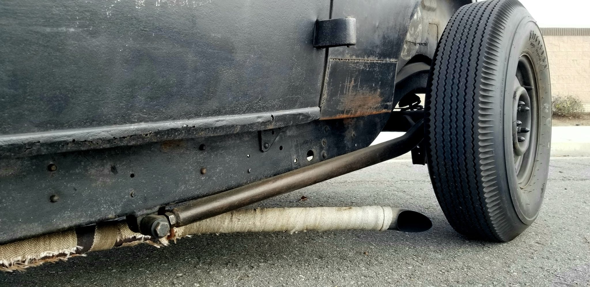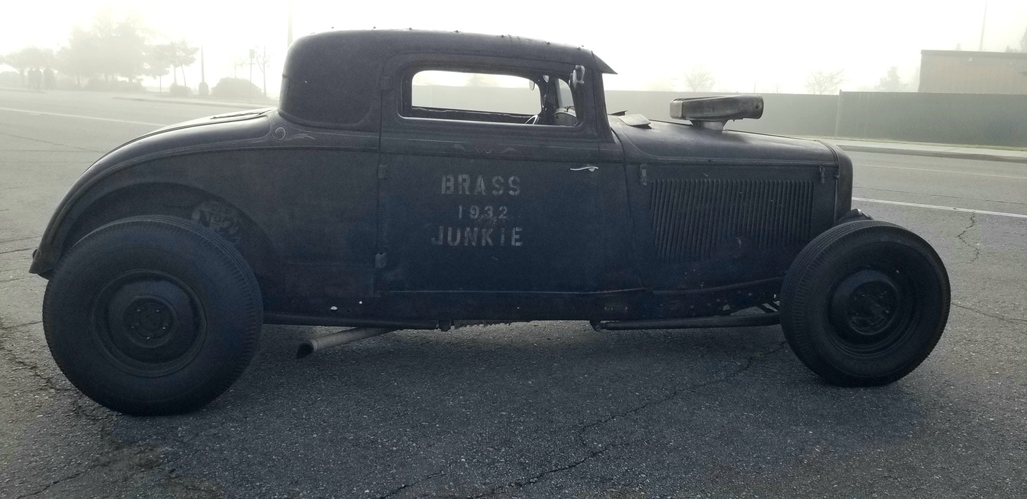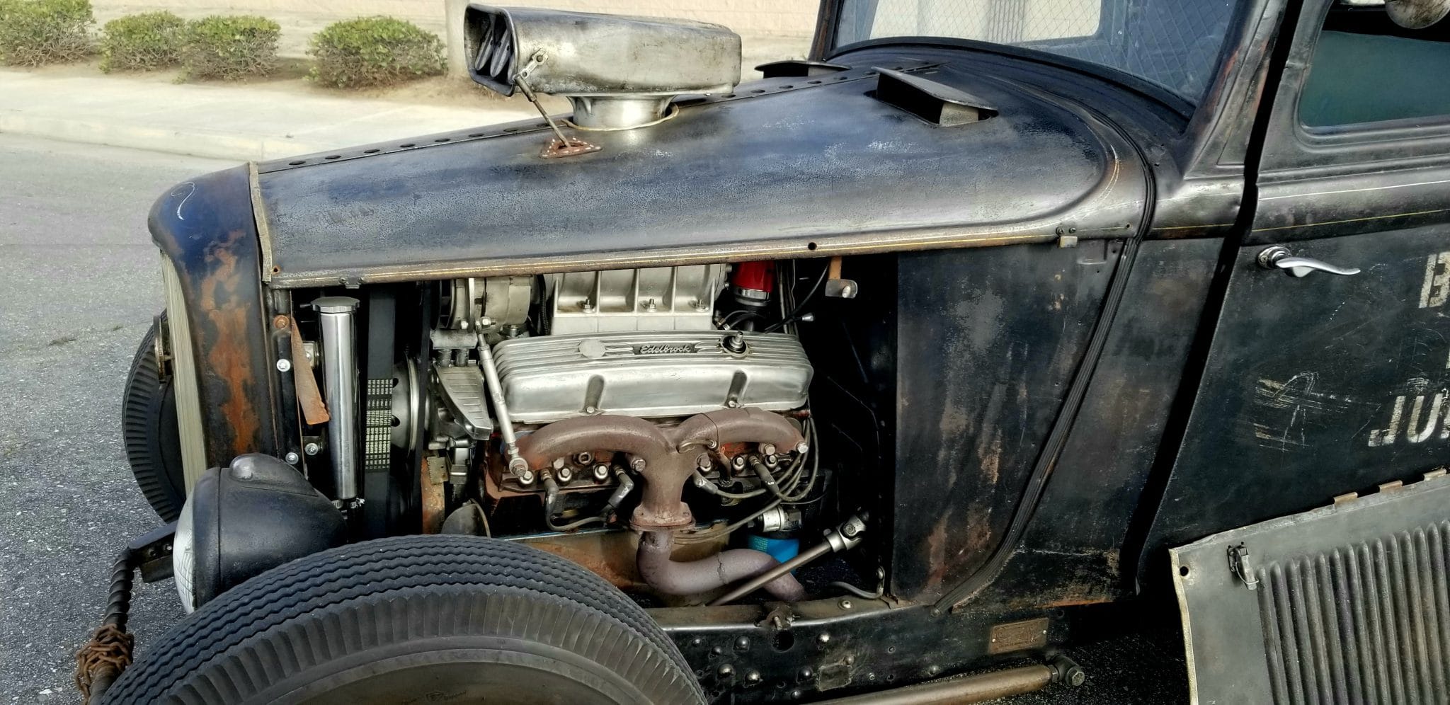 John Moss a acheté une carcasse de Ford B’32 dans la ville voisine de Garden Grove (Californie), à un fabricant passionné de produits pharmaceutiques récréatifs pour 500 $ (comprennent ceux qui se droguent)… À l’époque, c’était juste une carrosserie et un châssis avec un “Title” Californien. Puis il a commencé à rassembler des pièces. John Moss a ajouté des bobines, des triangles, des ressorts et des amortisseurs, a surbaissé et “pincé” le châssis pour l’adapter à ses idées, puis a ajouté des jantes Steelies de 15 AV et 16 pouces AR sur des croûtes Firestone 650/950…