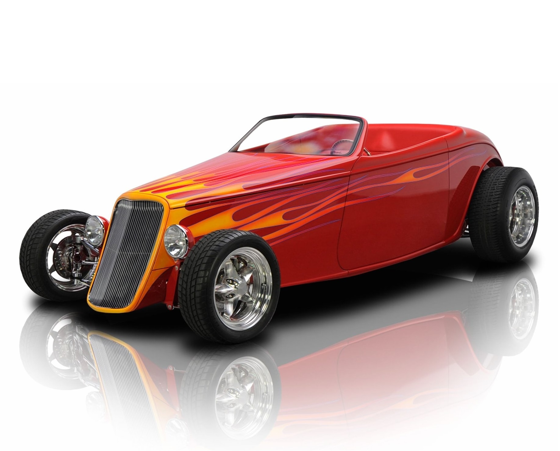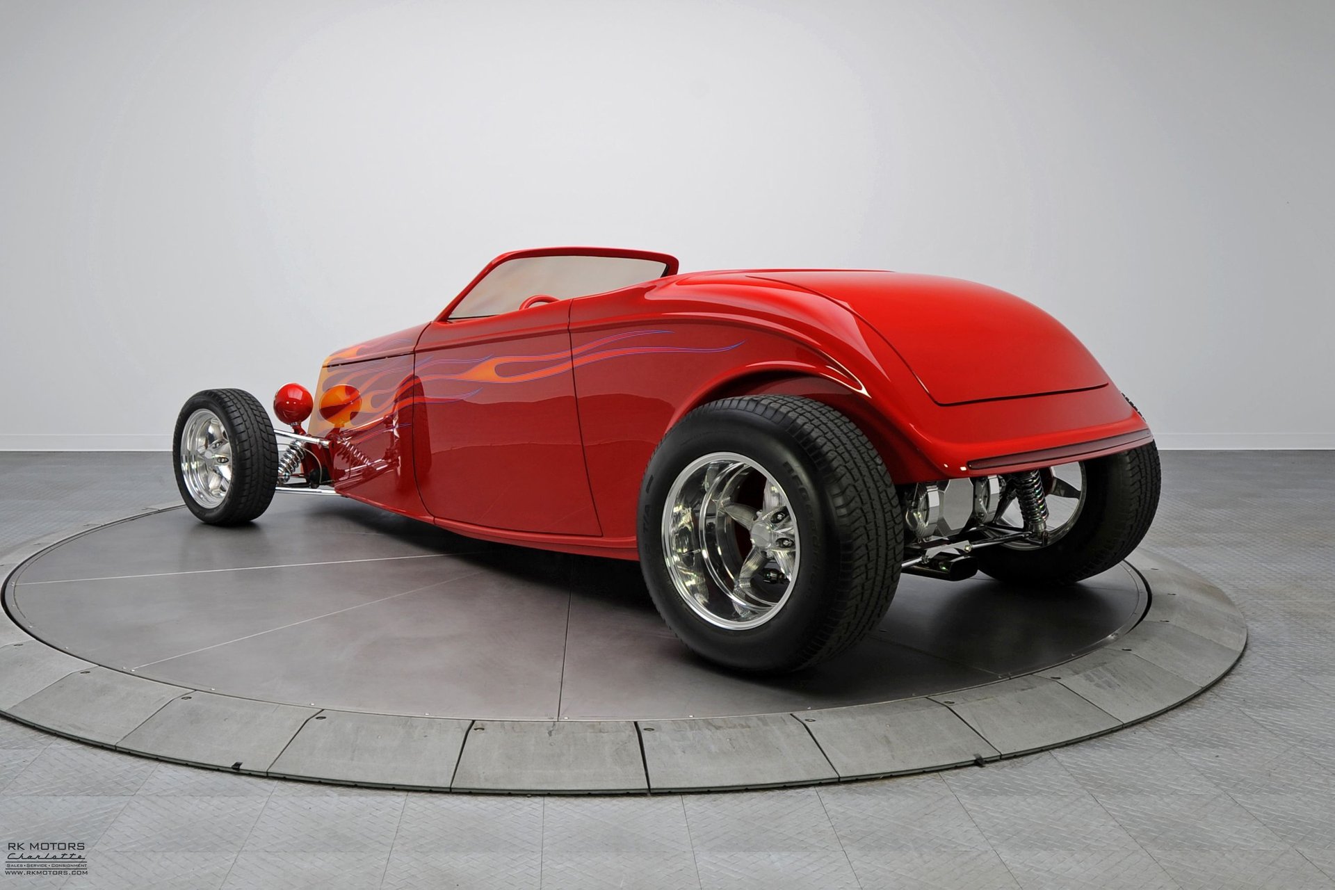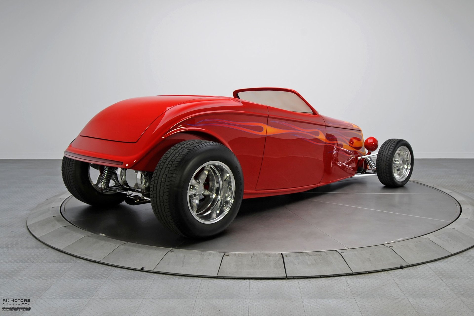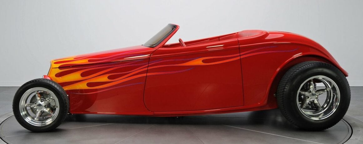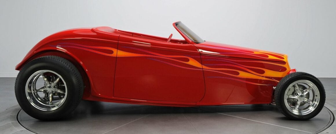 Ce Hot Rod Ford ’33, il a l’air à la fois rétro et futuriste, et son look s’est avéré tellement extrêmement populaire auprès de la communauté Hot Rodding que plusieurs dizaines de Hot Rodders ont voulu avoir le même, avec une autre calandre, des ailes ou pas d’ailes et autres déclinaisons. Mais ce n’est pas parce que la carrosserie est en production (limitée) que ce Hot Rod est ordinaire, loin de là, non… Tout d’abord, c’est Bobby Alloway lui-même qui a construit celui-ci après re-préparation de la coque en fibre de verre à la perfection avant de faire réaliser la peinture par Victory, en 2 étapes…