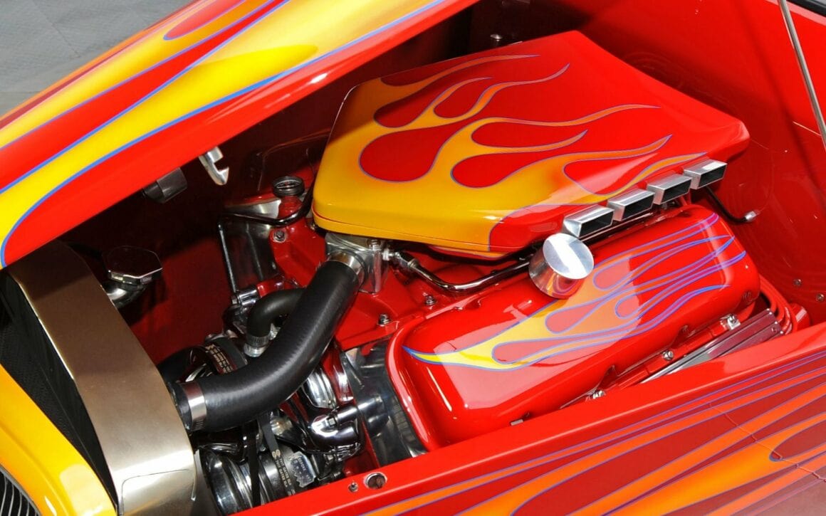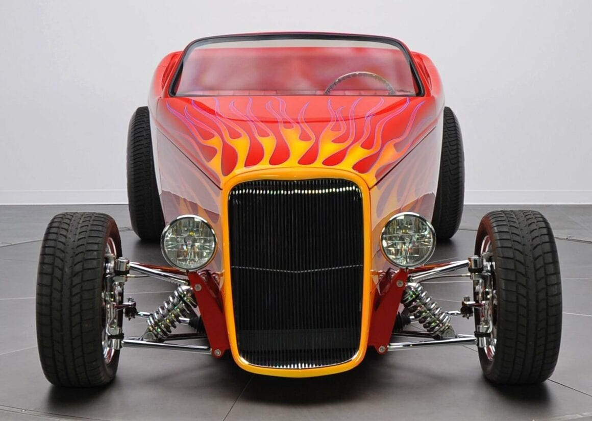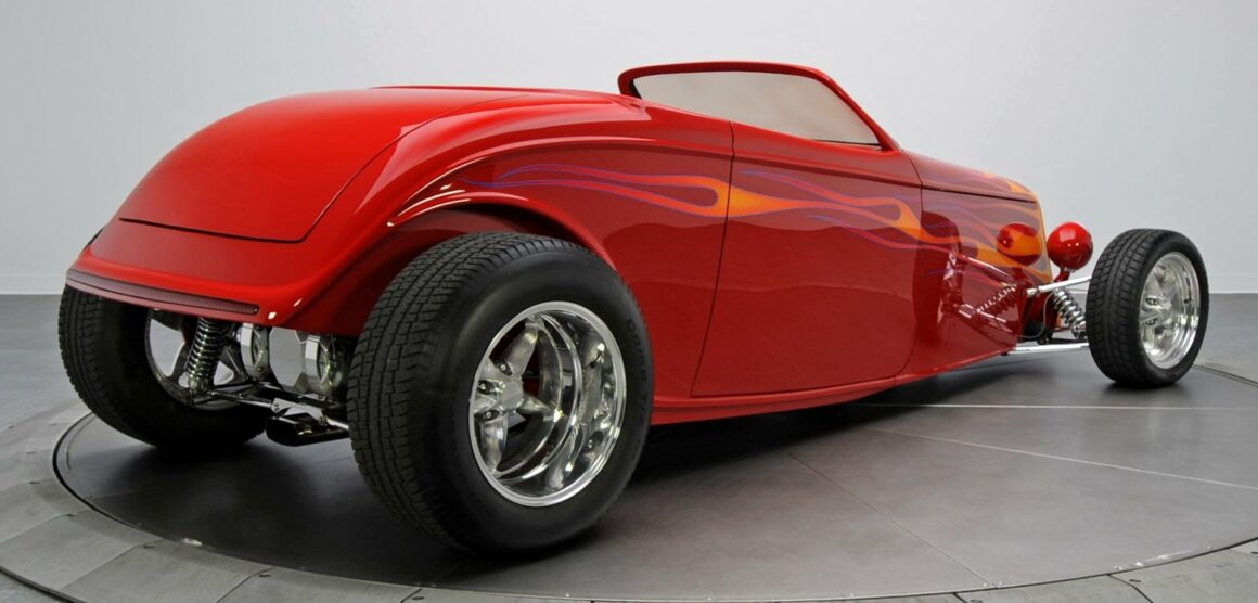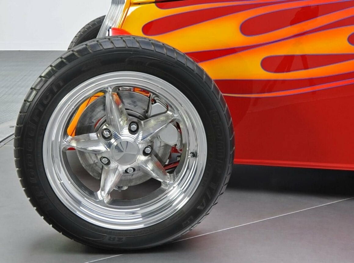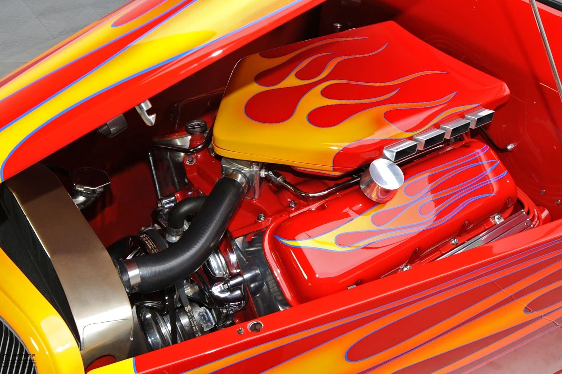 À chaque étape, la finition a été vérifiée, poncée et affinée afin que le résultat final soit très certainement gagnant à tous points de vue. Wade Hughes et Bill Roell de Victory à Cincinnati ont pris soin des flammes, donnant à la voiture quelques coups de langues de flammes traditionnels. À l’avant, la coque de calandre ’33 modifiée par Bobby Alloway contient un insert de billette Boyd Coddington polies, tandis qu’Alloway a conçu les supports personnalisés pour les phares à partir de zéro. À l’arrière, l’une des caractéristiques les plus intéressantes, le feu arrière pleine largeur, a également été fabriquée par Alloway.