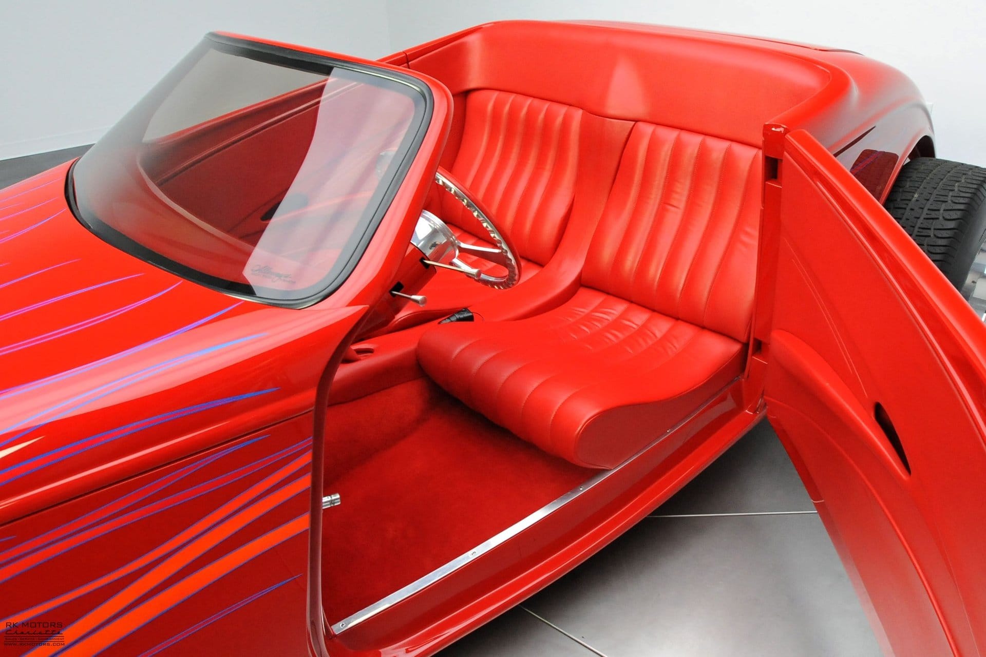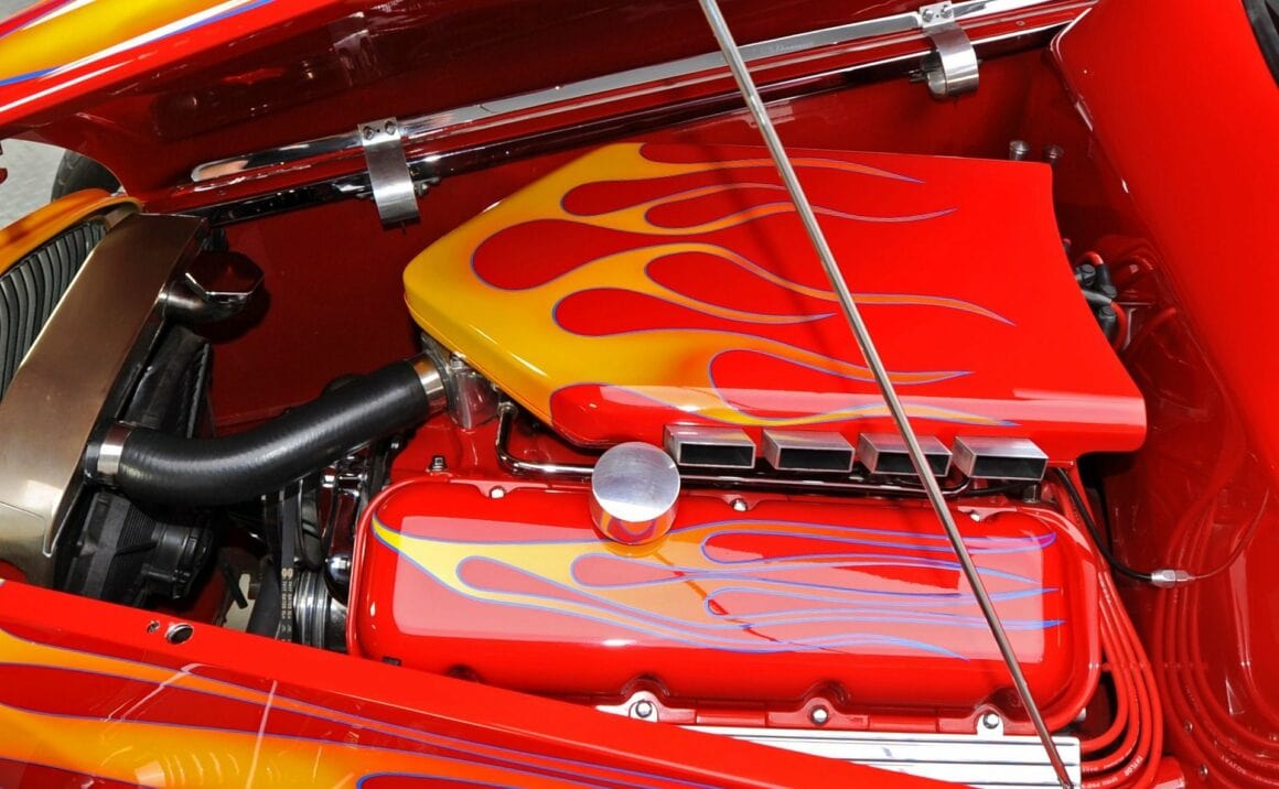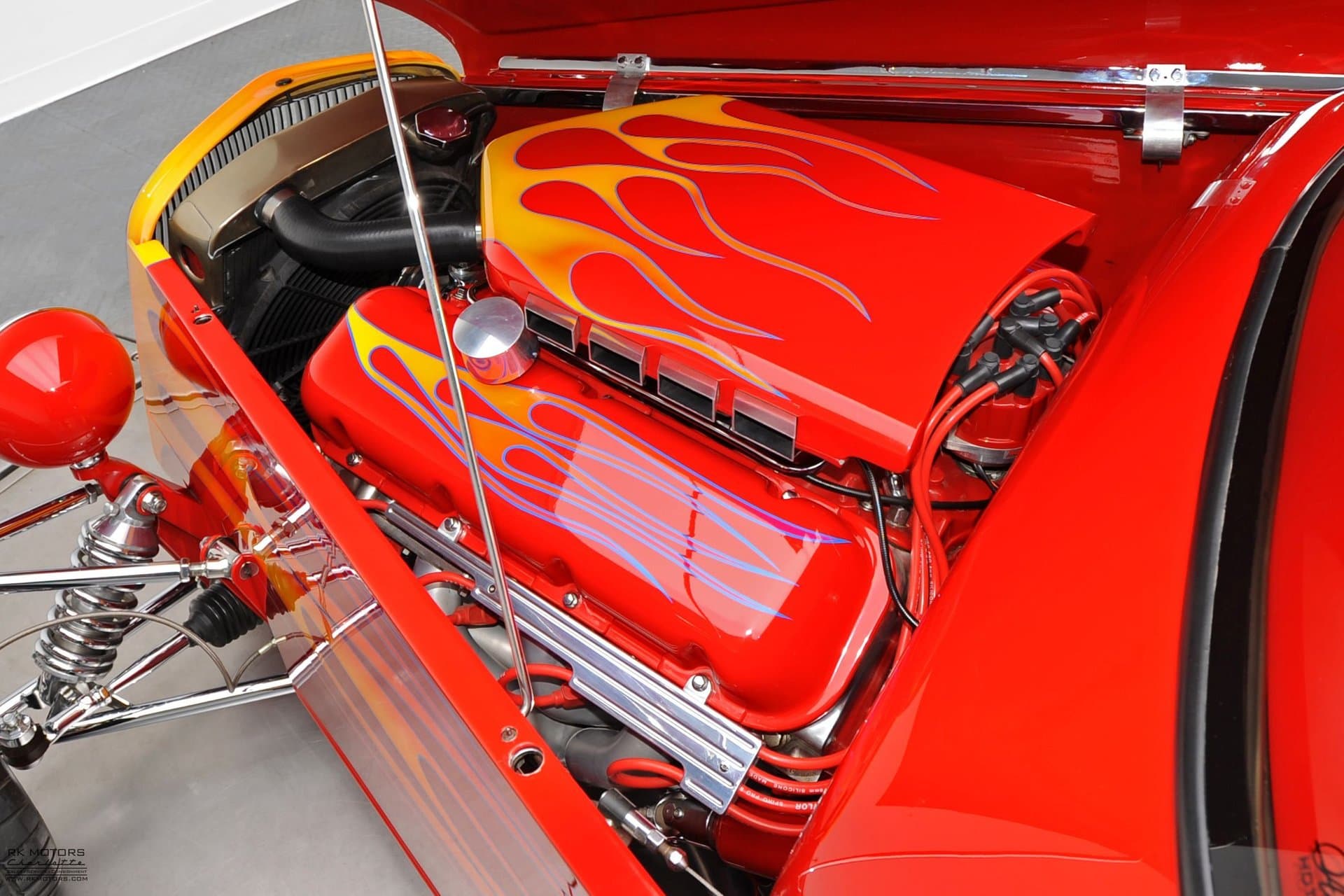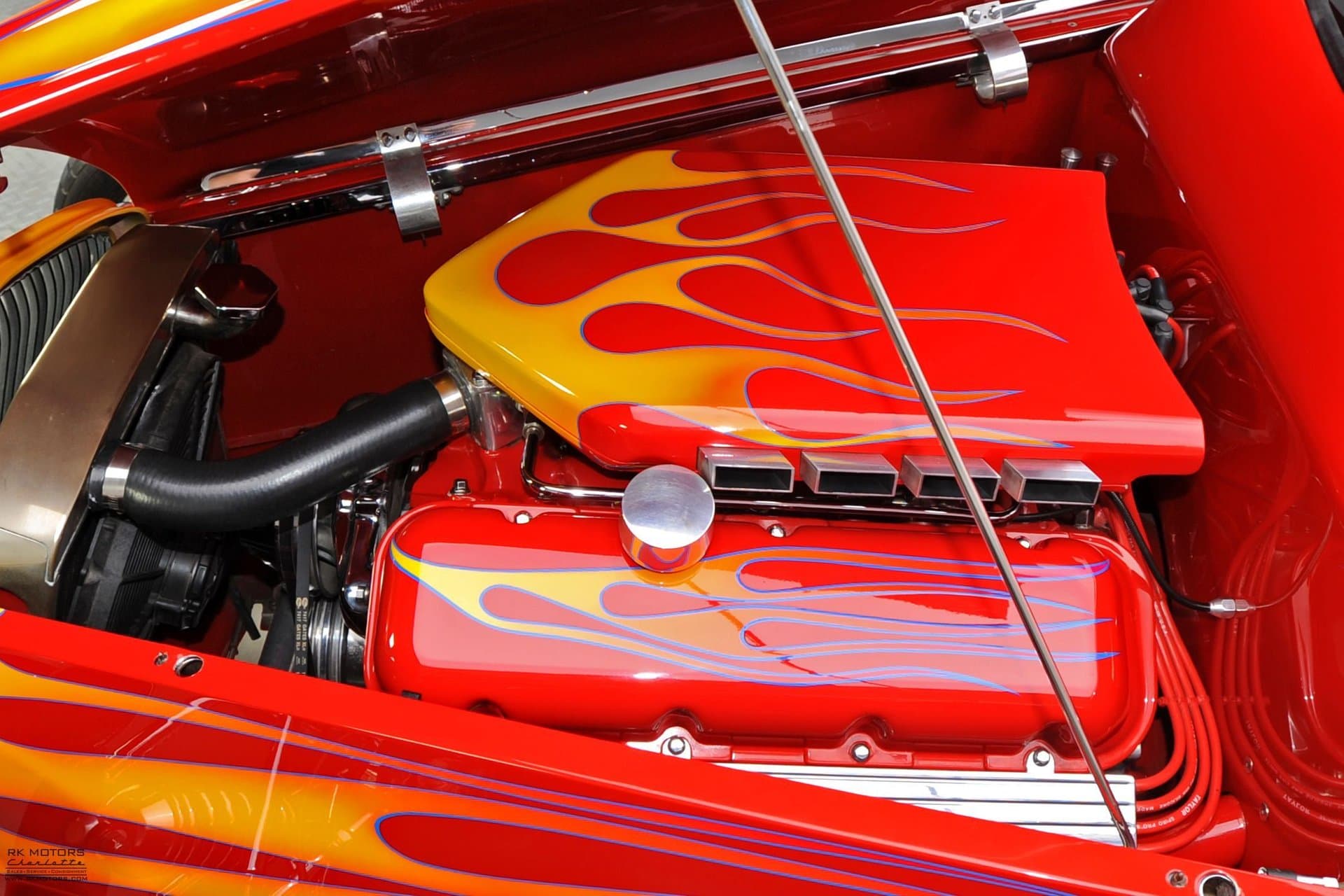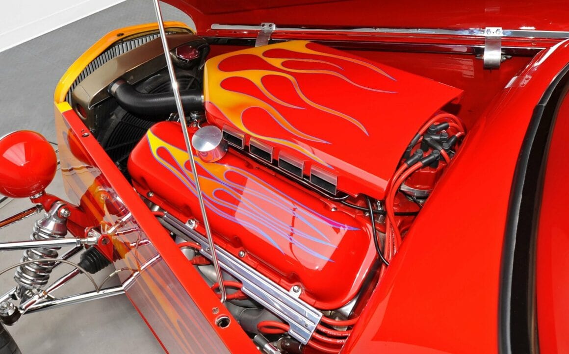Un pare-brise personnalisé a été créé pour donner à ce Hot Rod “Dazzler” un look moderne qui élimine le capot traditionnel façon B’32 au profit d’un ’34… Le 502ci a été construit par Miller Race Engines, têtes en aluminium, admission et carburateur Holley 800 CFM…. Arbre à cames à rouleaux hydrauliques Comp Cams, alternateur chromé, collecteurs longs tubes, caches soupapes soupapes et filtre à air ont été enflammés pour correspondre à la carrosserie par les mêmes gars qui ont fait le travail de peinture… Et pour une durabilité à long terme, un look général de qualité d’exposition.