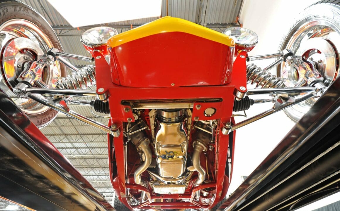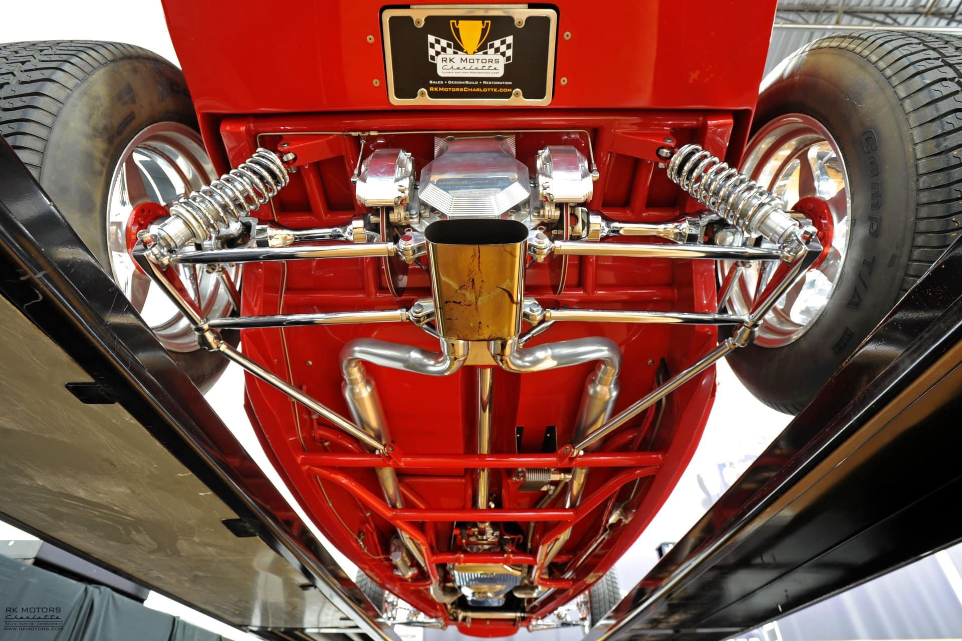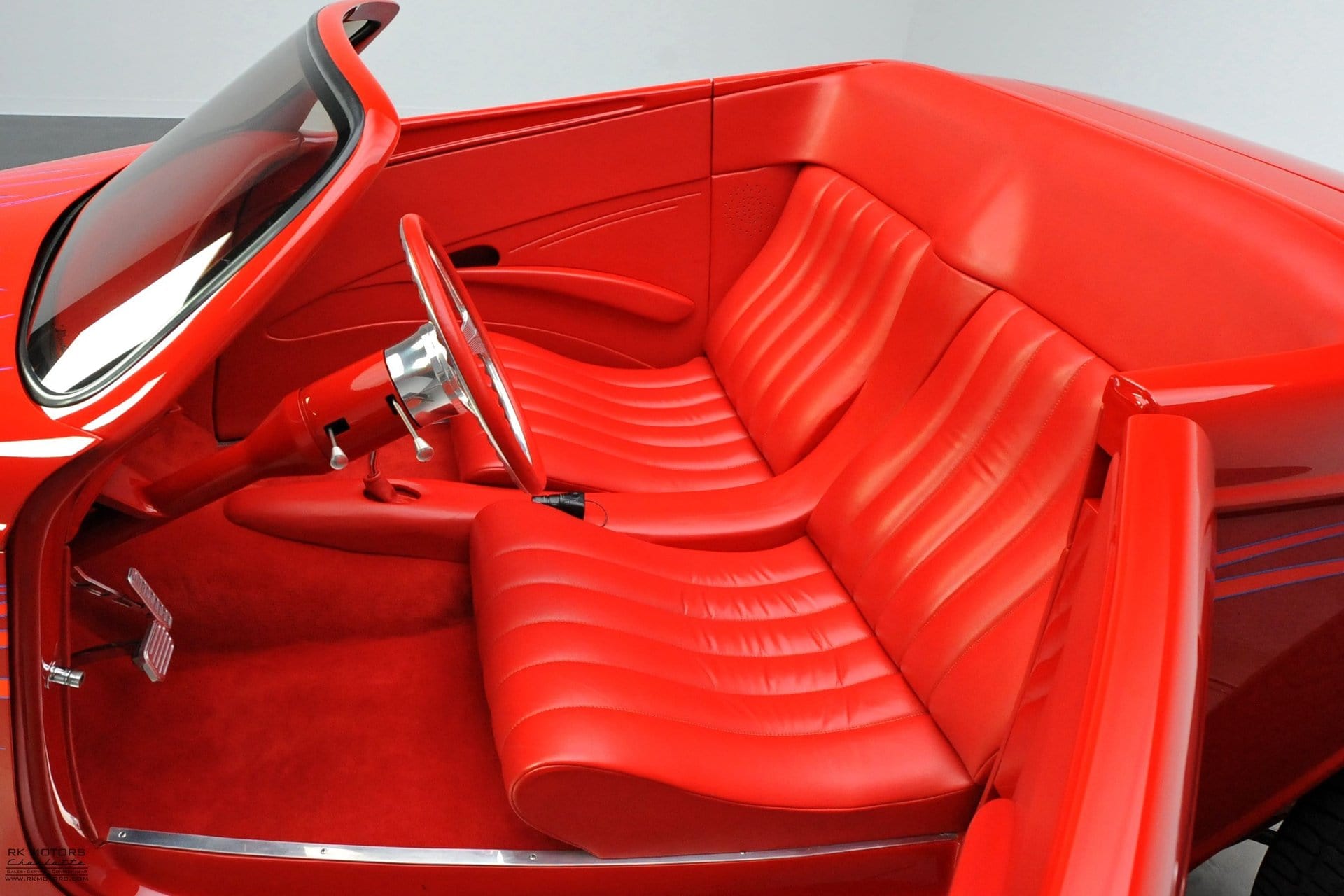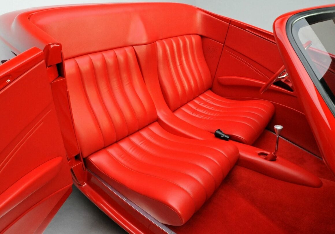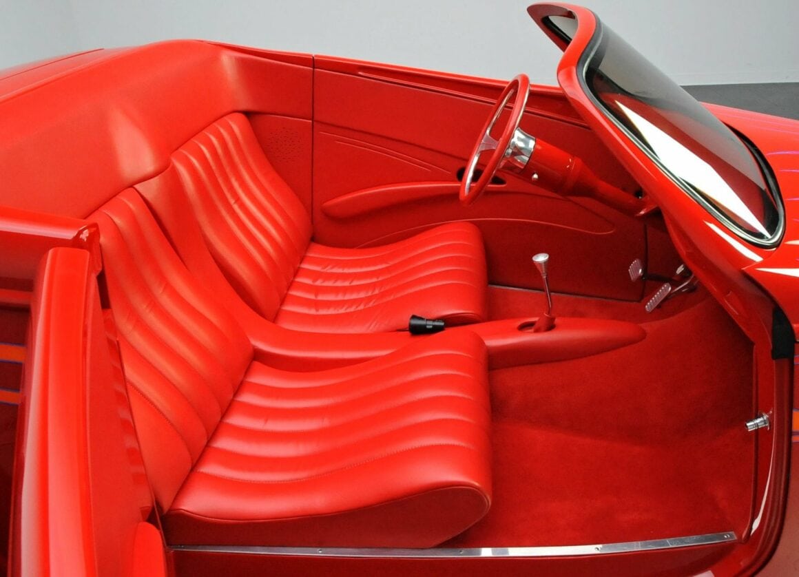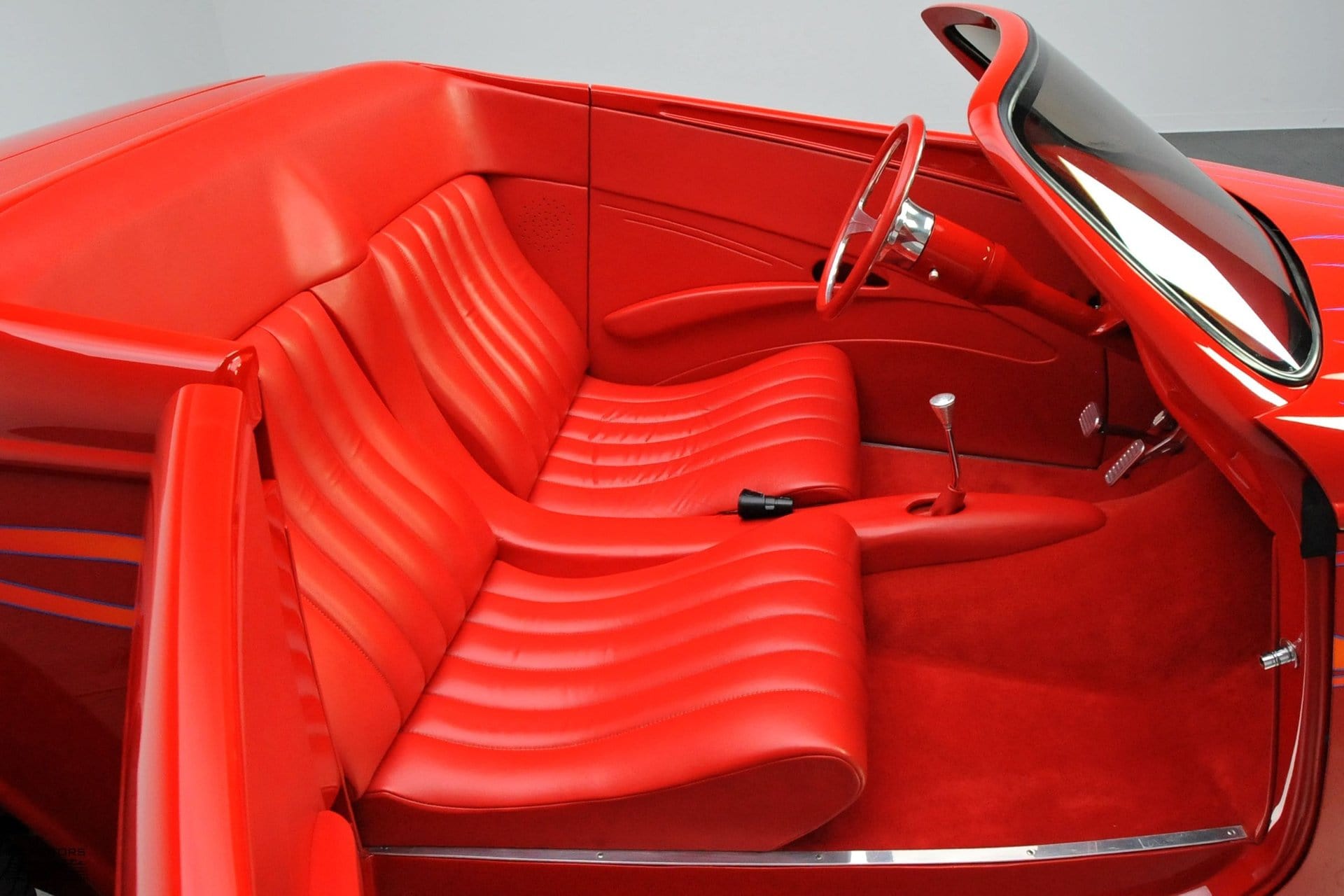 Dans l’ensemble, le compartiment moteur est simple et épuré, ressemblant plus à une sculpture industrielle qu’à une automobile fonctionnelle. Le châssis construit sur mesure est un Frames ‘N Things, revisité par la suite par Coddington et Alloway… Ne l’ais-je pas déjà écrit… Si… Pffff… Vous pouvez créditer Paul Adkins de Cullman, en Alabama, pour l’intérieur (magnifique) entièrement en cuir rouge à lèvres (sic !). Les sièges baquets ont été fabriqués sur mesure et une console se fond jusque dans les dossiers. Le levier de vitesses est de chez Lokar. La colonne de direction basculante est une Ididit…