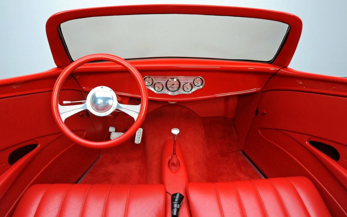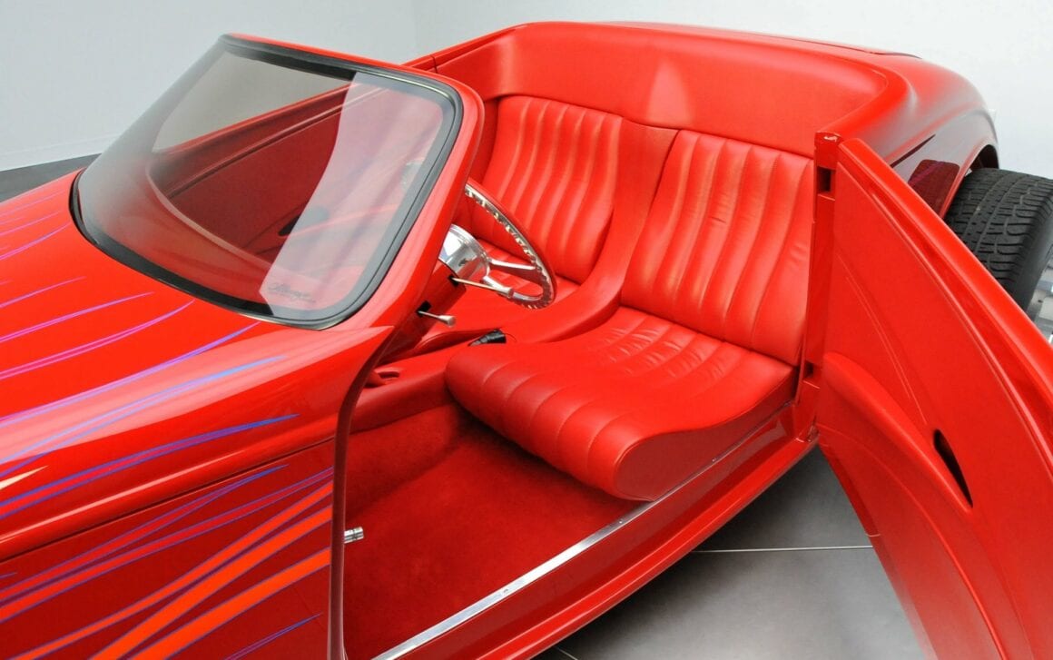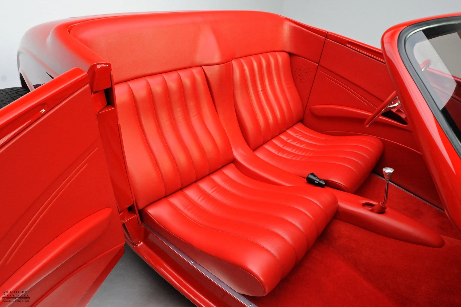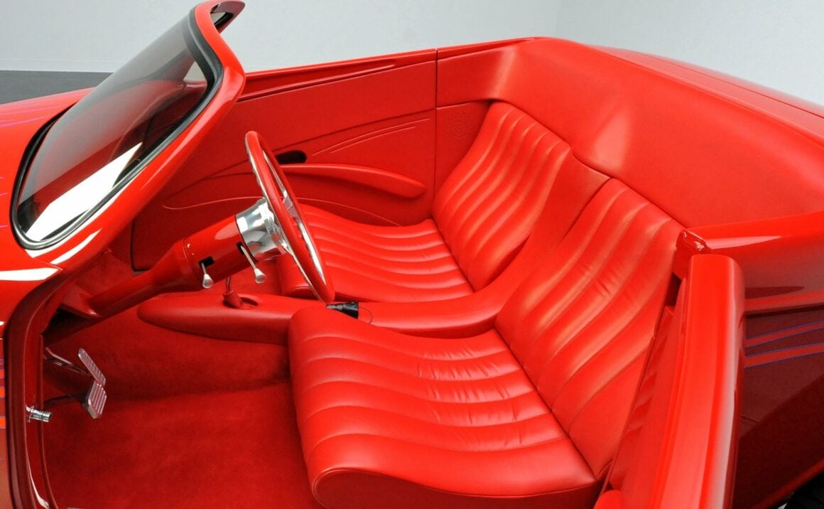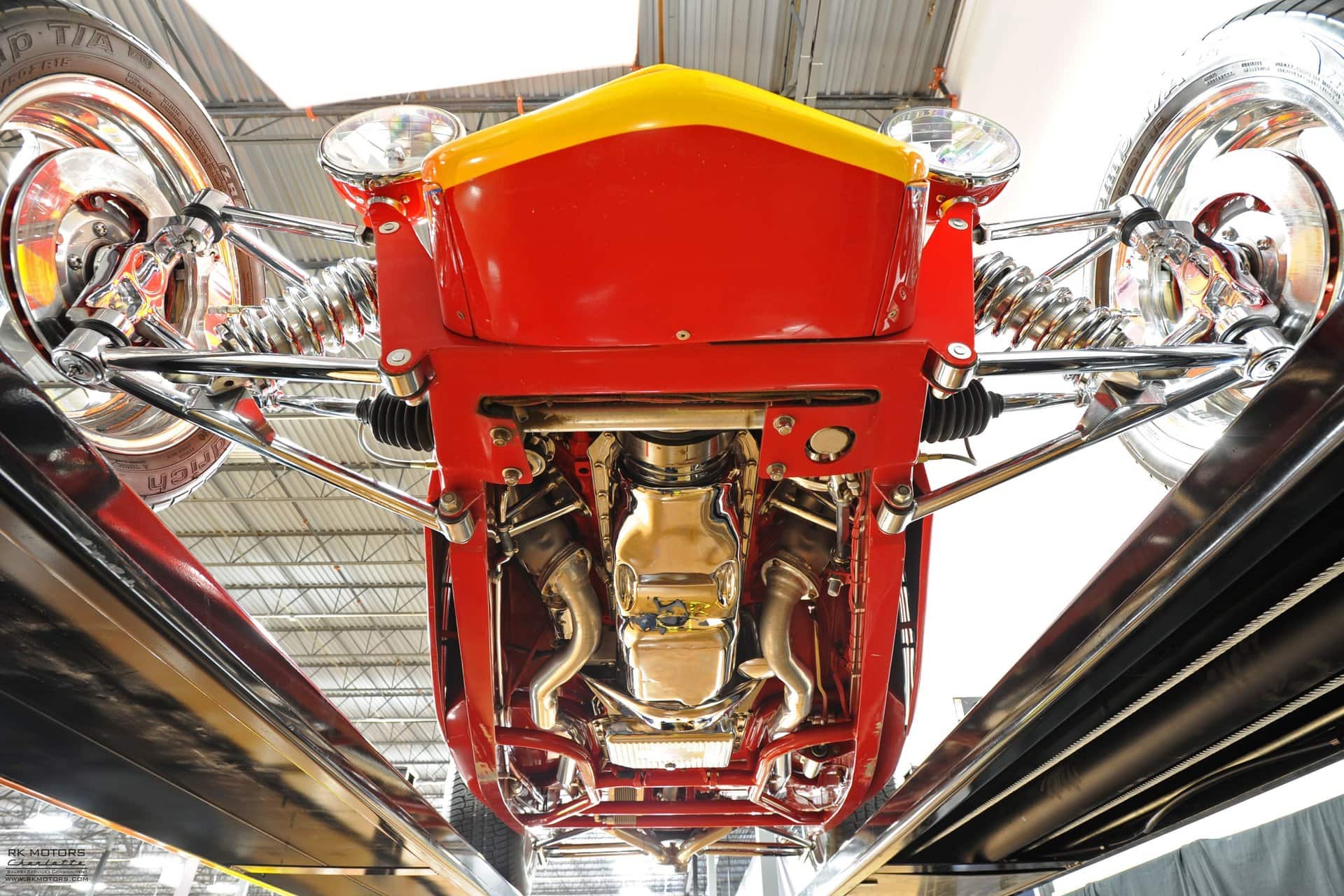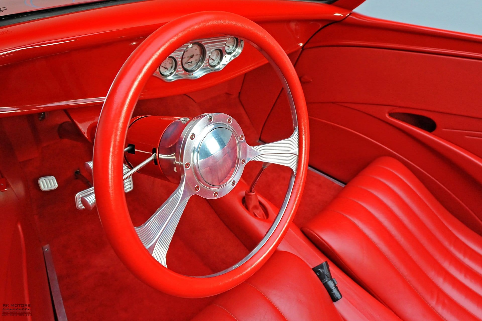 Dans l’ensemble, le compartiment moteur est simple et épuré, ressemblant plus à une sculpture industrielle qu’à une automobile fonctionnelle. Le châssis construit sur mesure est un Frames ‘N Things, revisité par la suite par Coddington et Alloway… Ne l’ais-je pas déjà écrit… Si… Pffff… Vous pouvez créditer Paul Adkins de Cullman, en Alabama, pour l’intérieur (magnifique) entièrement en cuir rouge à lèvres (sic !). Les sièges baquets ont été fabriqués sur mesure et une console se fond jusque dans les dossiers. Le levier de vitesses est de chez Lokar. La colonne de direction basculante est une Ididit…
