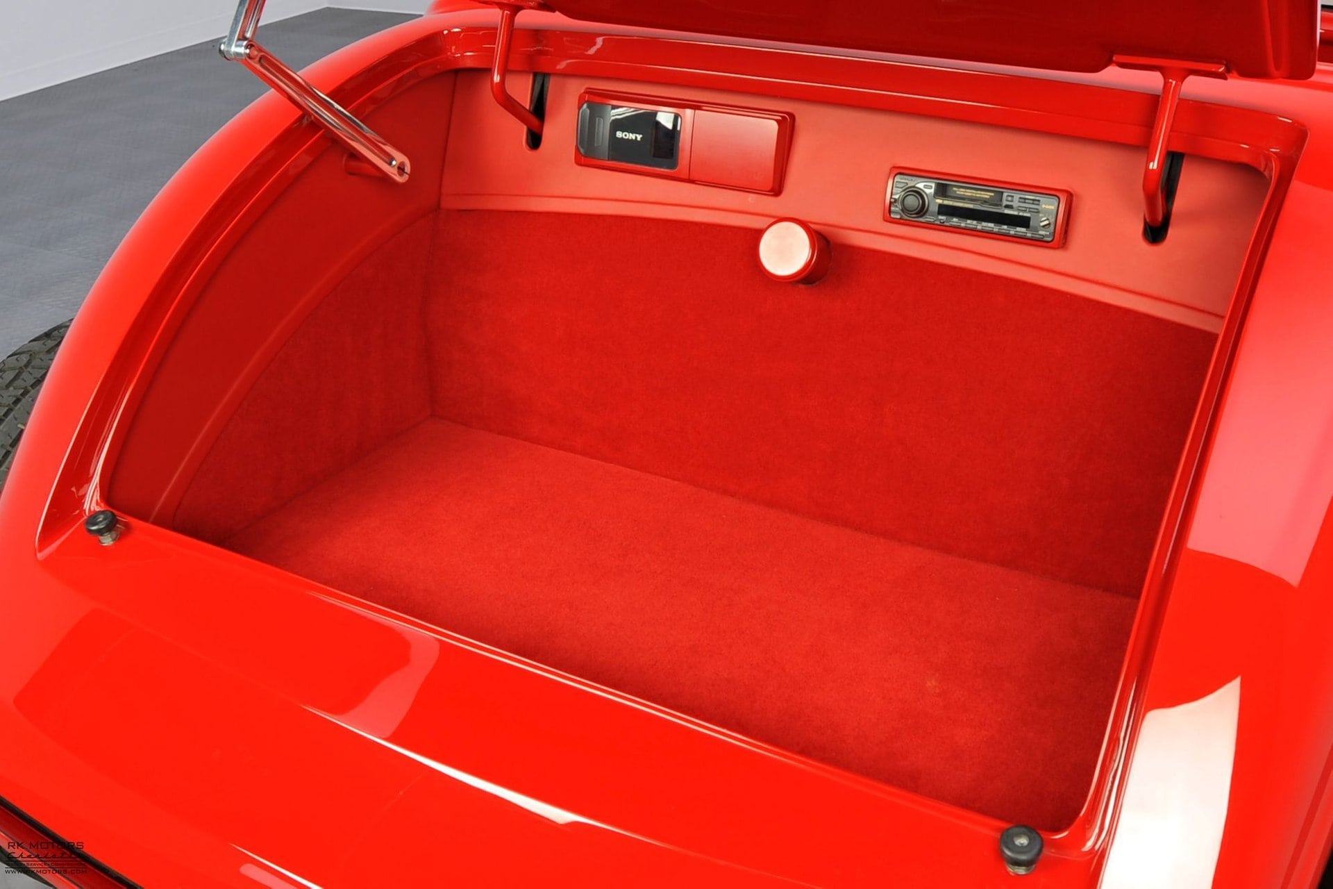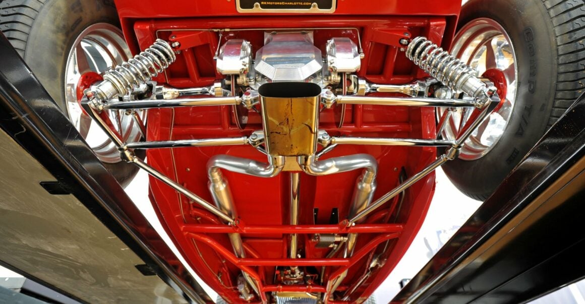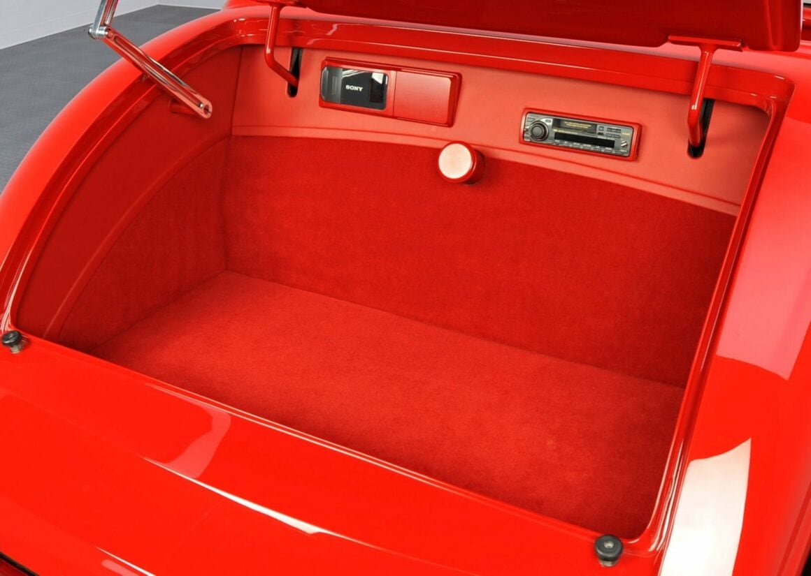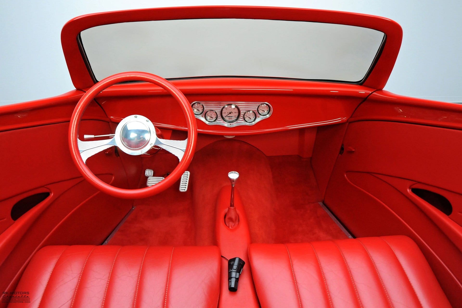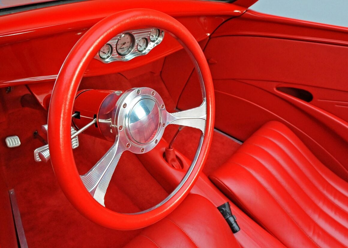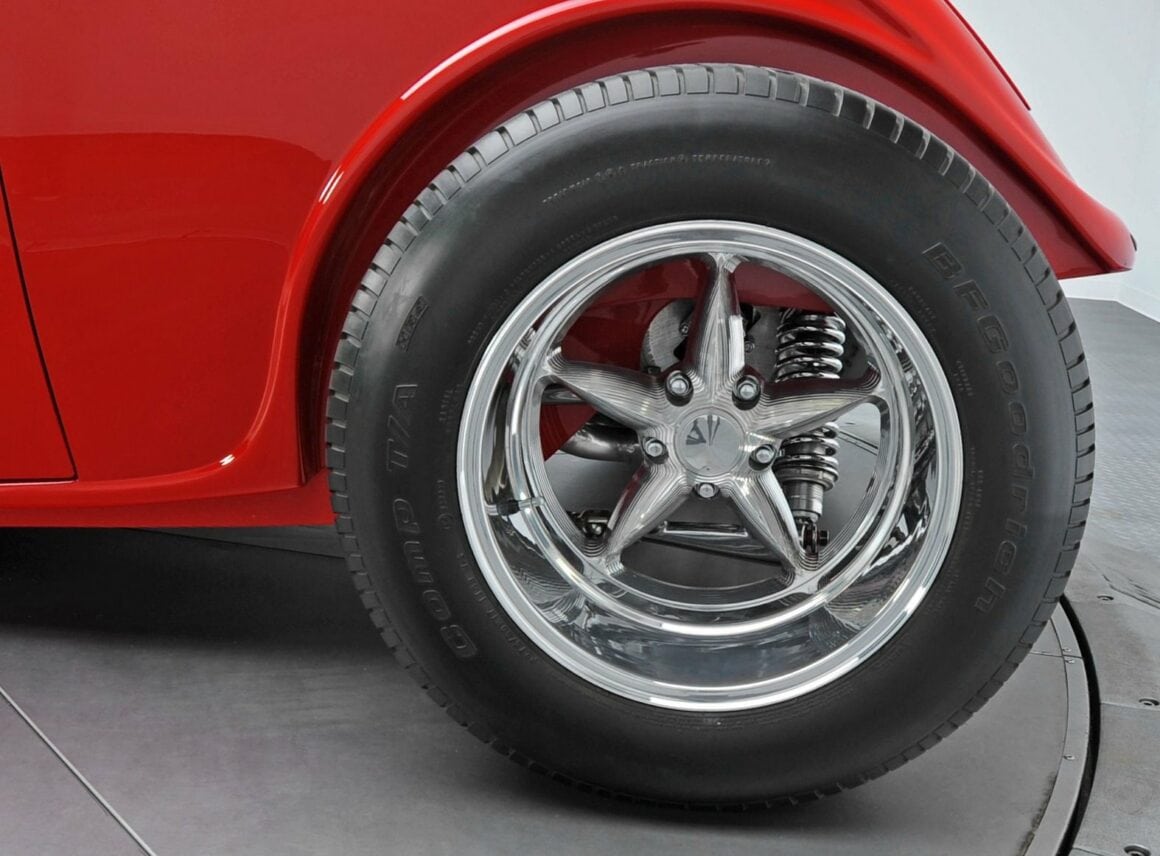 Dans l’ensemble, le compartiment moteur est simple et épuré, ressemblant plus à une sculpture industrielle qu’à une automobile fonctionnelle. Le châssis construit sur mesure est un Frames ‘N Things, revisité par la suite par Coddington et Alloway… Ne l’ais-je pas déjà écrit… Si… Pffff… Vous pouvez créditer Paul Adkins de Cullman, en Alabama, pour l’intérieur (magnifique) entièrement en cuir rouge à lèvres (sic !). Les sièges baquets ont été fabriqués sur mesure et une console se fond jusque dans les dossiers. Le levier de vitesses est de chez Lokar. La colonne de direction basculante est une Ididit…