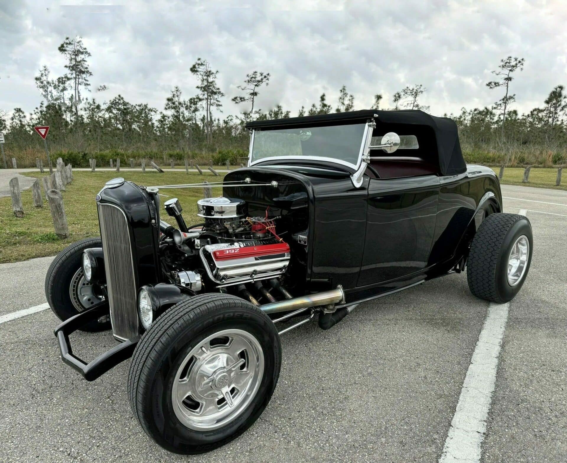 Alors voilà de quoi illustrer les presque trente photos de ce Hot-Rod Ford Hi-Boy ’32 à carrosserie en fibre de verre… Il a été construit par Davviki LTD. de Kankakee, Illinois. USA… La puissance provient d’un V8 Hemi 392ci lié à une transmission automatique trois vitesses à boutons poussoirs TorqueFlite d’origine Chrysler et à un pont arrière Ford 9″ avec un rapport limité de 2,85:1 du différentiel à glissement.